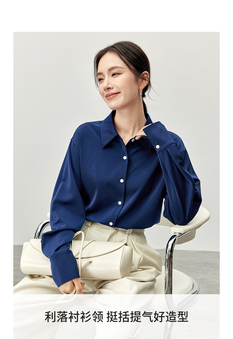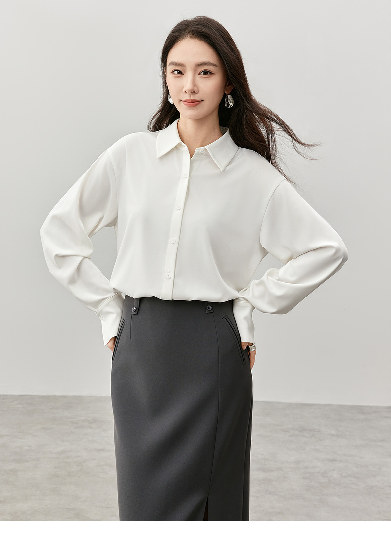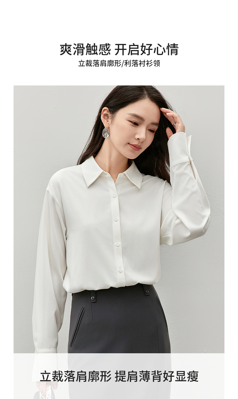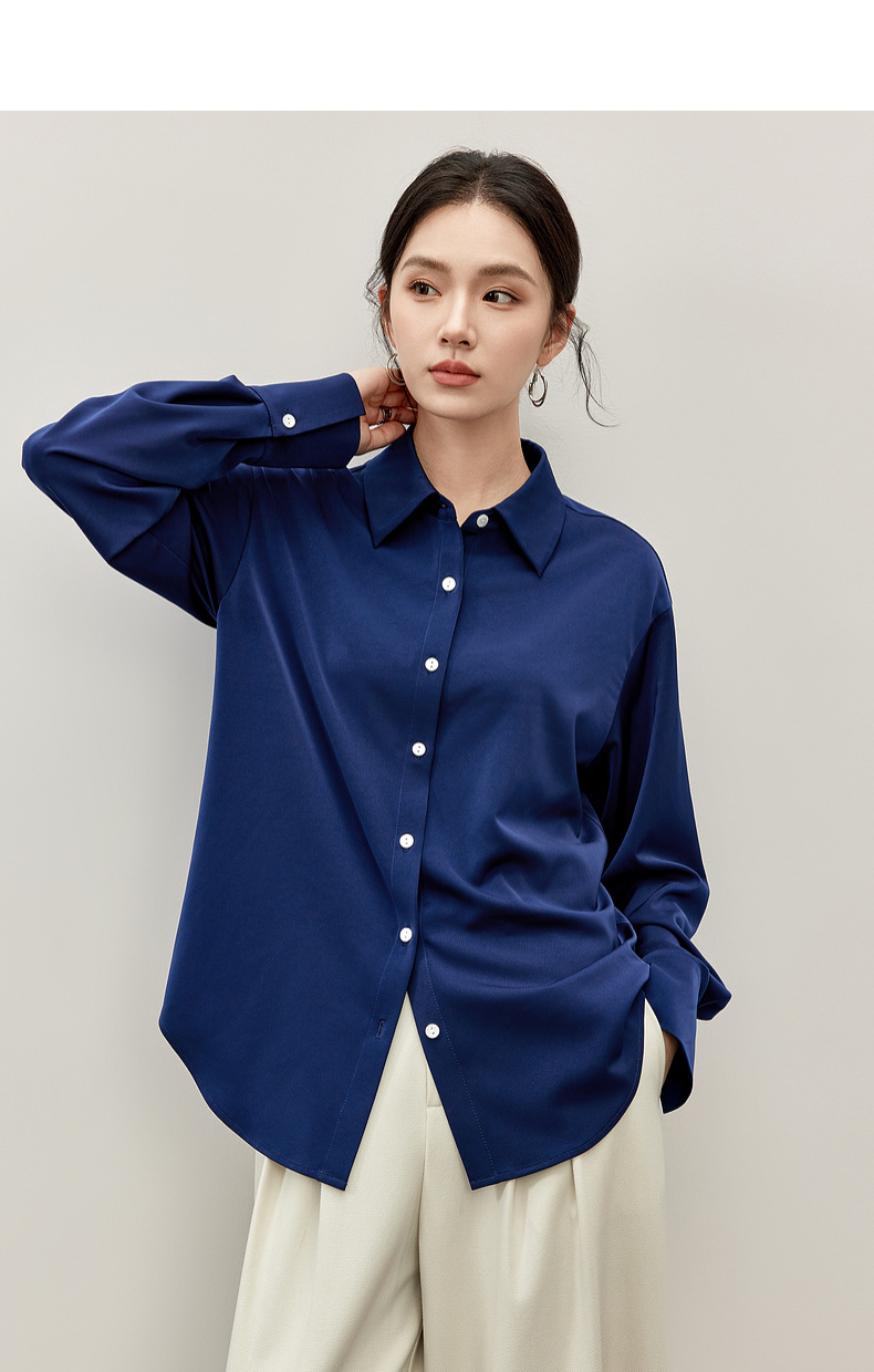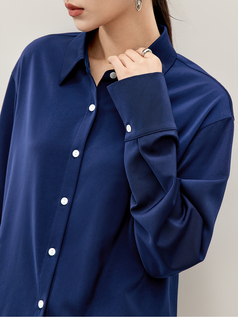 【内购】气质通勤光泽感长袖衬衫翻领落肩贝壳扣弧形衣摆上衣-153CC3580X