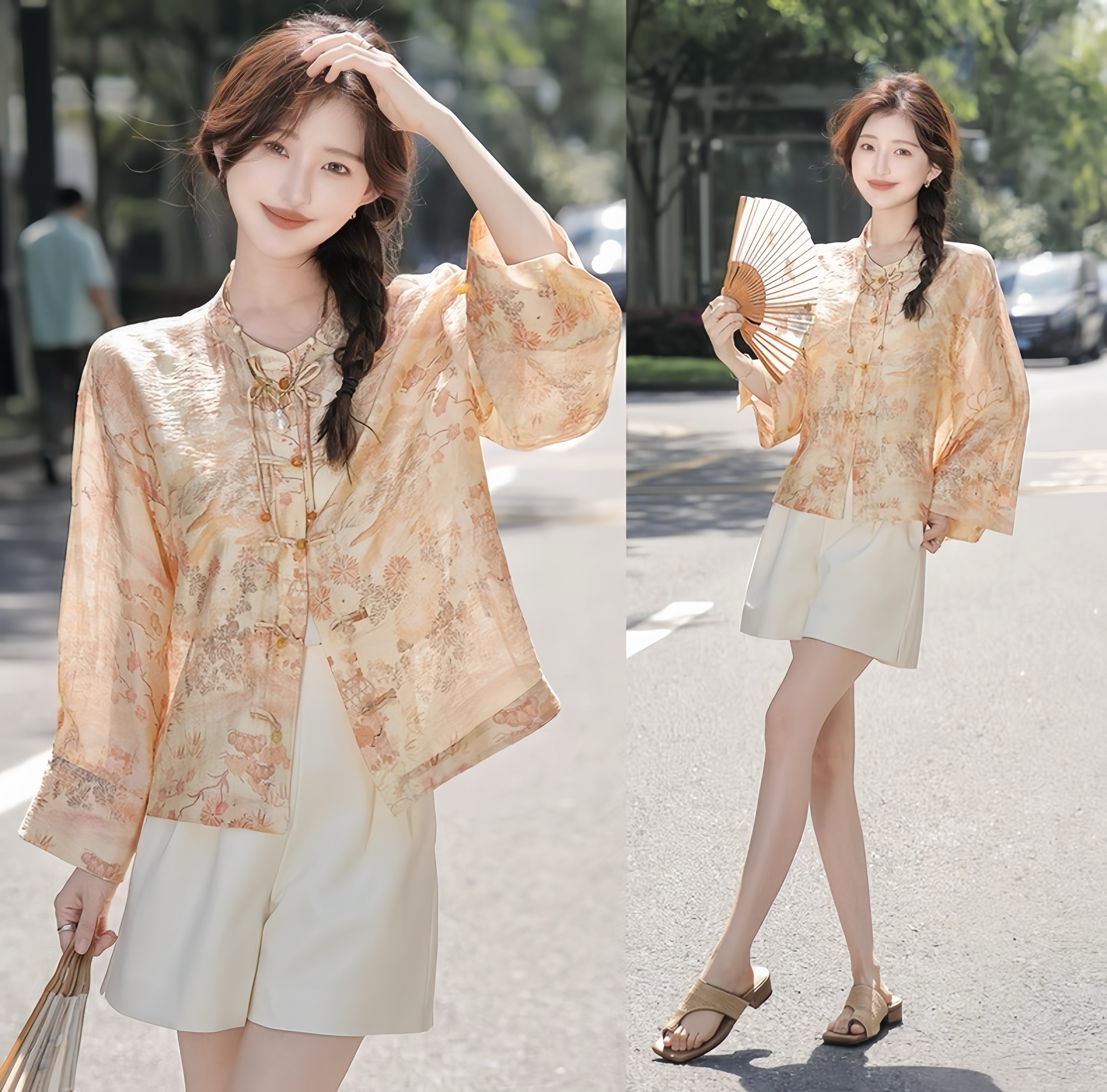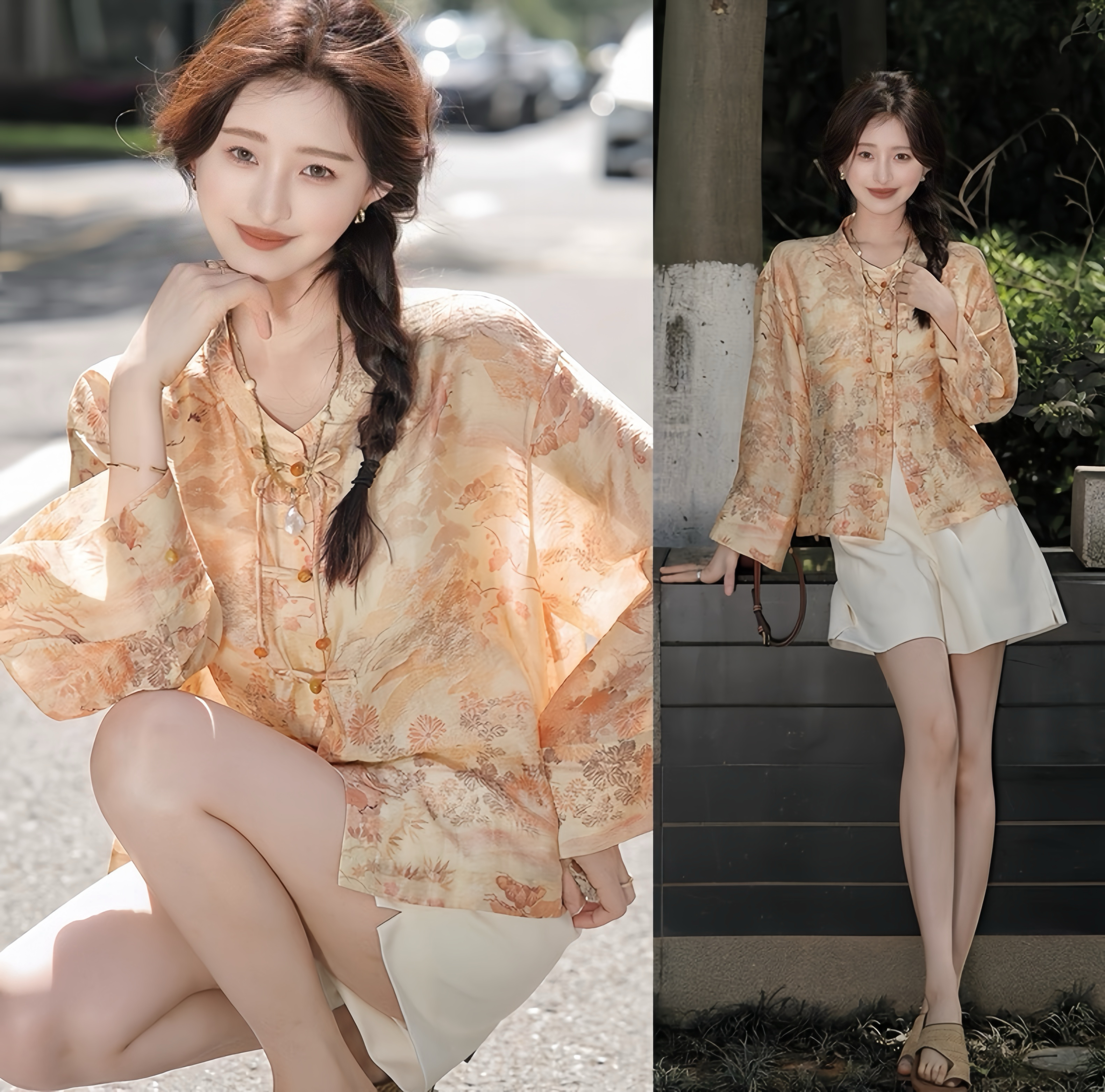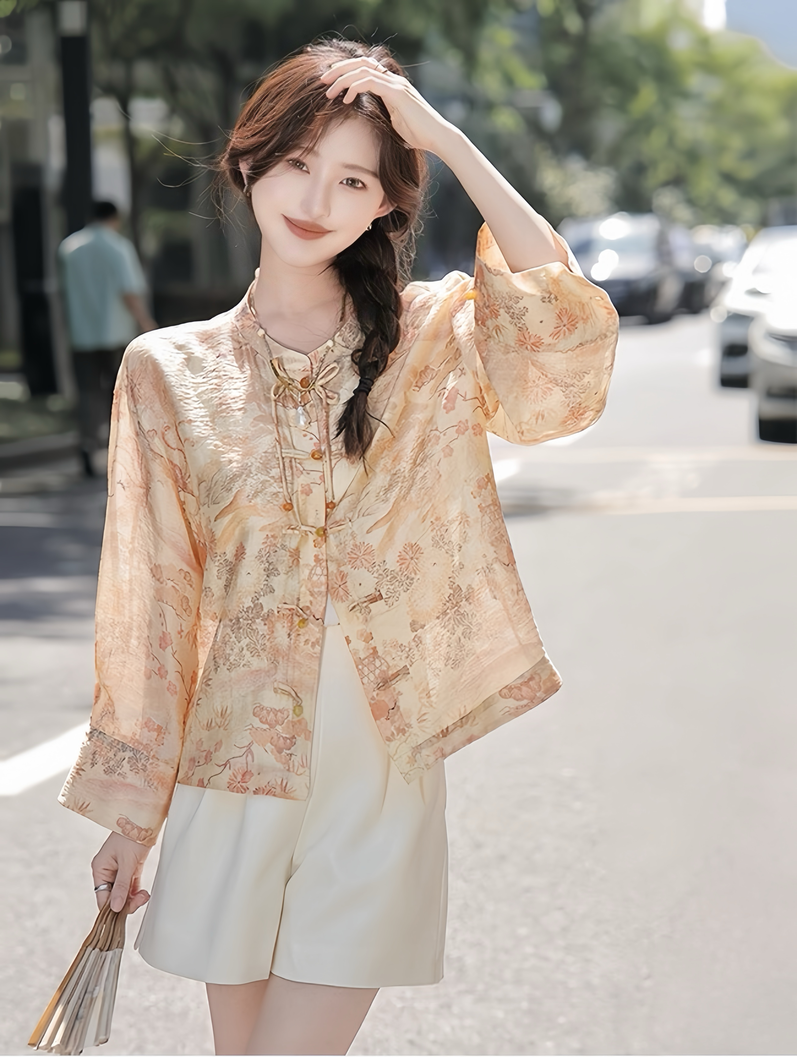 天猫同步【凉感、丝滑】拉夏贝尔/La Chapelle新中式立领印花盘扣长袖衬衫秋季新款★