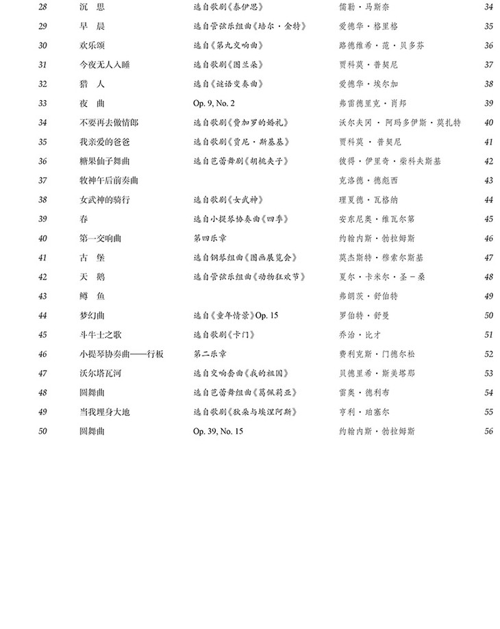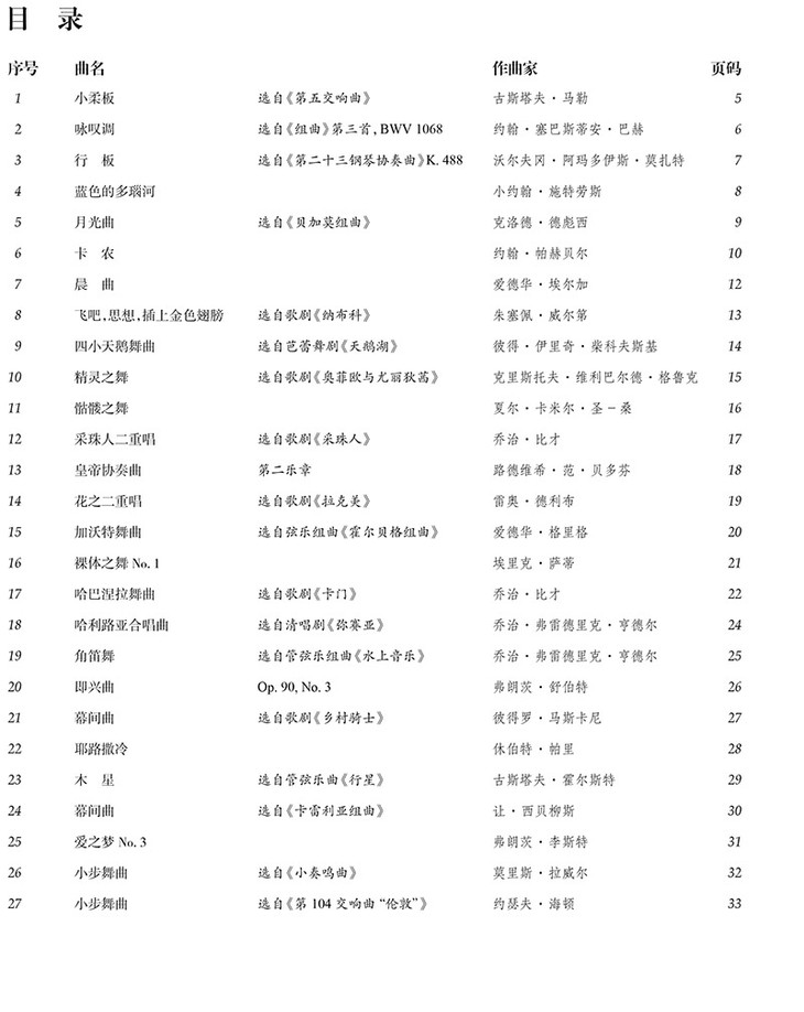 本曲集为钢琴简易改编版,收录了50首最受欢迎的古典音乐名曲,作品涵盖交响乐、歌剧及独奏保留曲。为钢琴学习者与演奏者提供了丰富的演奏素材,从休闲乐曲到戏剧音乐,不论是振奋人心的节奏抑或婉转忧郁的旋律,都应有尽有。本书适用于初级至中级水平的演奏者。