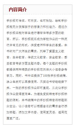 小学生的家长可能都有过帮孩子画手抄报的经历,无论南北方的小学,手抄报似乎成了家庭作业的一种常见形式。在孩子入学前我也不理解为什么这么多家长对手抄报如此热衷,当孩子上了一年级以后,我才真正亲身体会到了原来在小学校园里手抄报这么重要、这么常见。不仅是学校和班级的宣传栏要用到手抄报,家庭作业也经常是以手抄报的形式出现。为了拯救枯竭的绘画想象力,不得不去搜索手抄报的资源和作品。可是网上搜来的作品往往过于简单粗糙,某些书上搜来的作品虽然精美却过于复杂难以模仿。为了让孩子们不止是简单地模仿范例,书中除了列举了100张手抄报实例外,对手抄报的设计技巧也进行了讲解,从笔材到纸张,从配色到构图,从花边到插图,每一部分内容都有精彩的讲解。授人以鱼不如授人以渔,正是本着这样的态度,作者创作了这样一本内容全面又丰富的手抄报图书,相信它可以满足不同孩子和家长的不同需求。 |