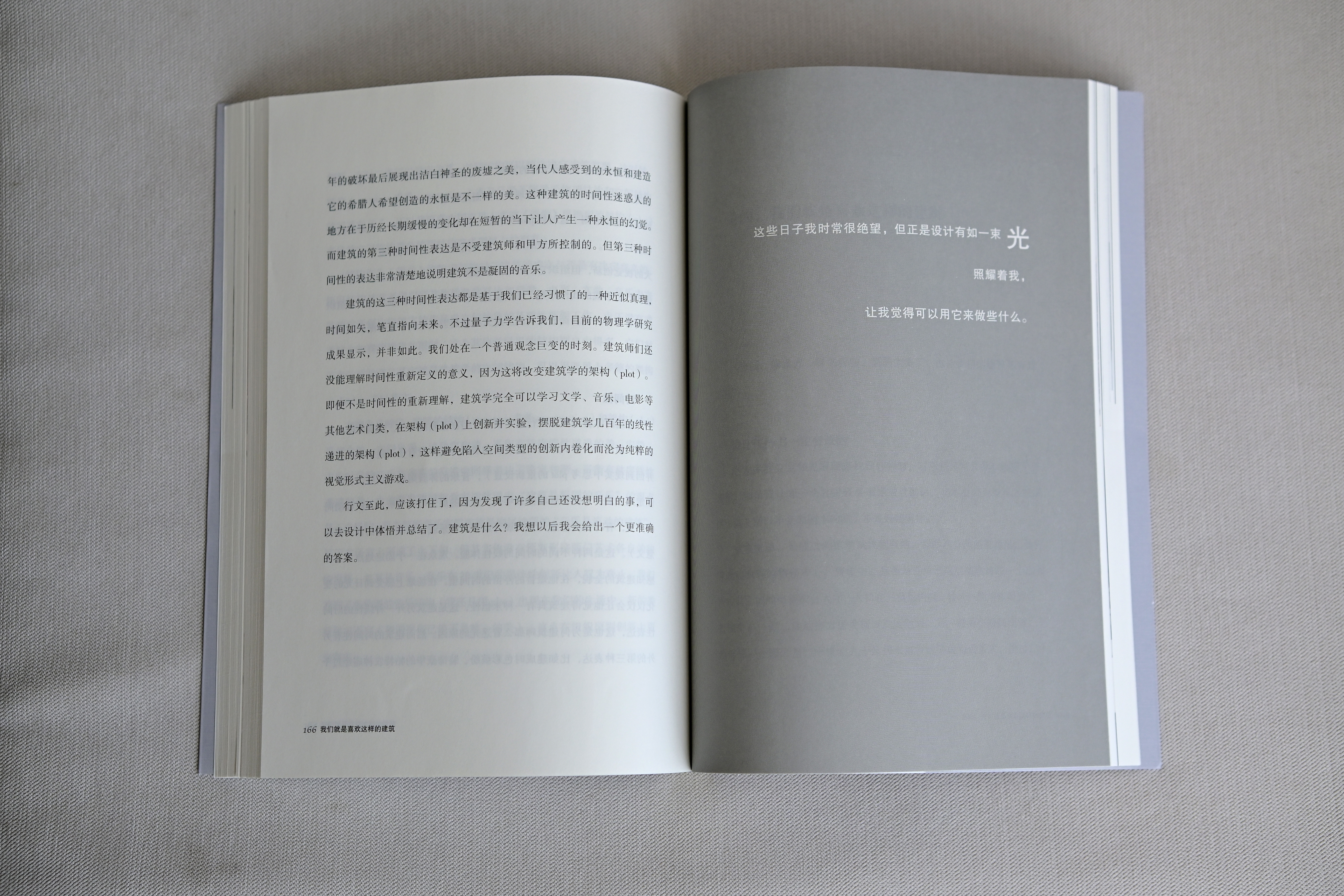 我不是一个真正坚强的人,成年人的崩溃都是一刹那的。是希望重塑了我后半生的设计态度。我想告诉大家,建筑师其实是可以为那些脆弱的、不坚固、容易消失的东西去创作,而不一定追求那种坚固的、永恒的东西。作为一个建筑师,今天的我,看待建筑学这件事情,是所有的绚烂最后归于平静,所有的磨难最后归于轻松,建筑虽然是个固定不动的东西,但它和流动、变化的人永远息息相关,它应该反映人性当中那些宝贵的、闪光的东西。最后,我是在自己的人生中,洞悉了中国这一伟大文化里最重要的审美领悟,那就是,所有艰难困苦的训练和思考,到最后都要展现不可思议的轻松。