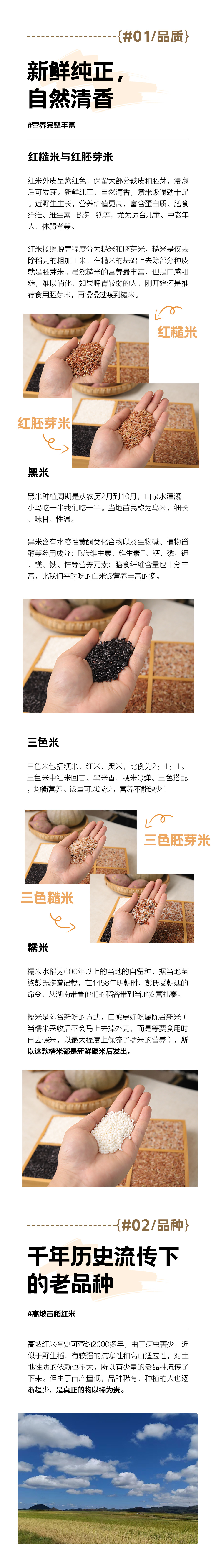 【温馨提示】: 1、现碾现发,不接受急单,下单后一周内发货(晒谷,凉谷,脱壳,镇定,包装,发出)。 2、活米保质期一般是脱壳后三个月,建议三月内吃完营养为佳。 3、三色米混合比例:粳米2红米1黑米1 4、关于口感:三色米中红米回甘、黑米香气、粳米Q弹 5、关于糙米:自留种古稻自然农法种植,糙米外表联坚硬内芯柔软,建议糙米提前泡3小时,与水1:2的比例煮。如电饭锅带有糙米发芽功能,请按照说明书使用。 6、关于胚芽米:去除部分种皮,保留完整胚芽。 7、关于包装:默认内袋为竹纤维外袋为可降解塑封袋,有特殊需求可抽真空包装,留言备注即可。 8、受天气或库存等原因影响快递可能偶有耽误,急单请发货前咨询客服。 9、已发货后不接受没有沟通的退款申请。 10、快递抵达后请尽快取件。