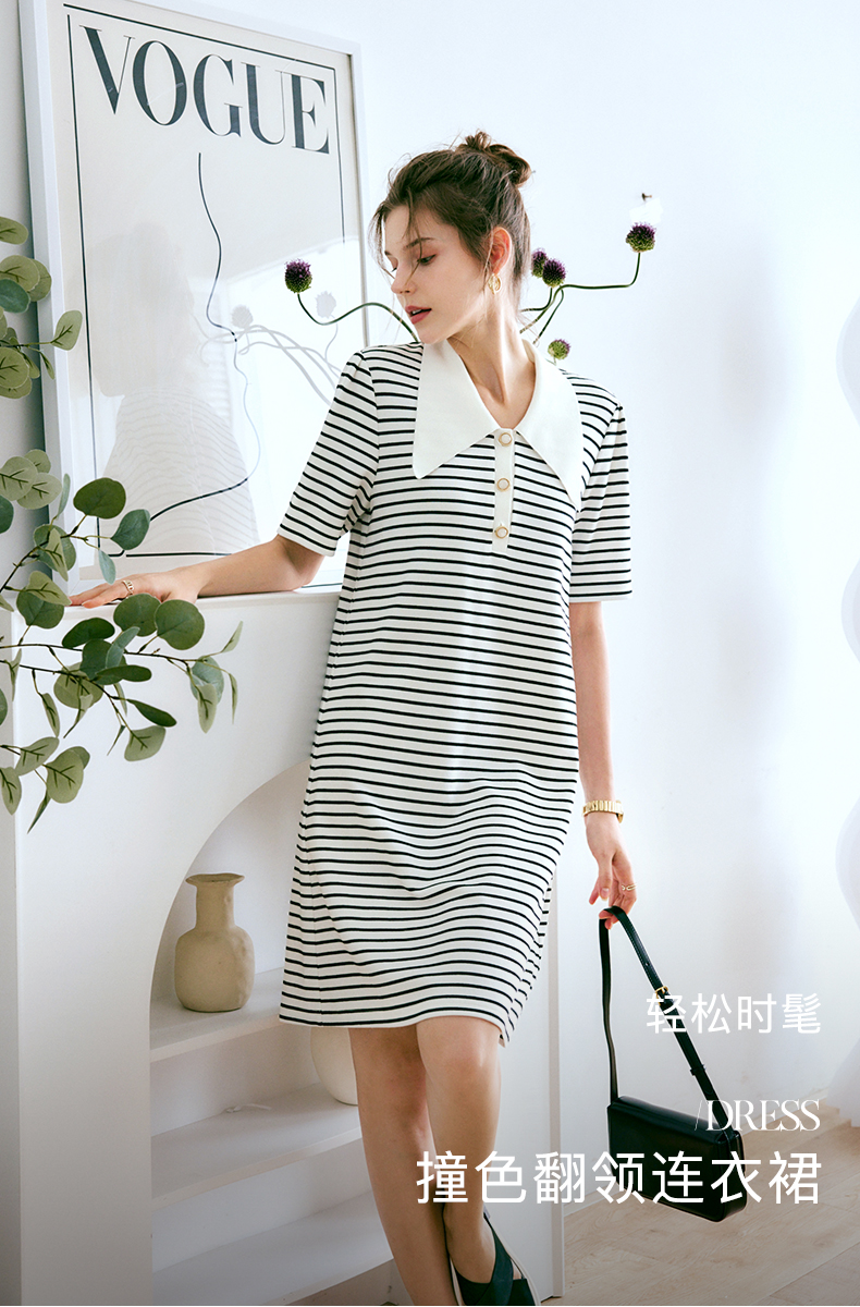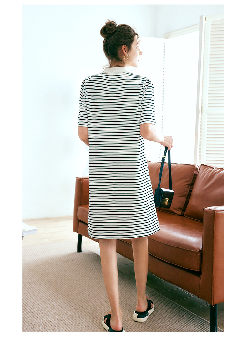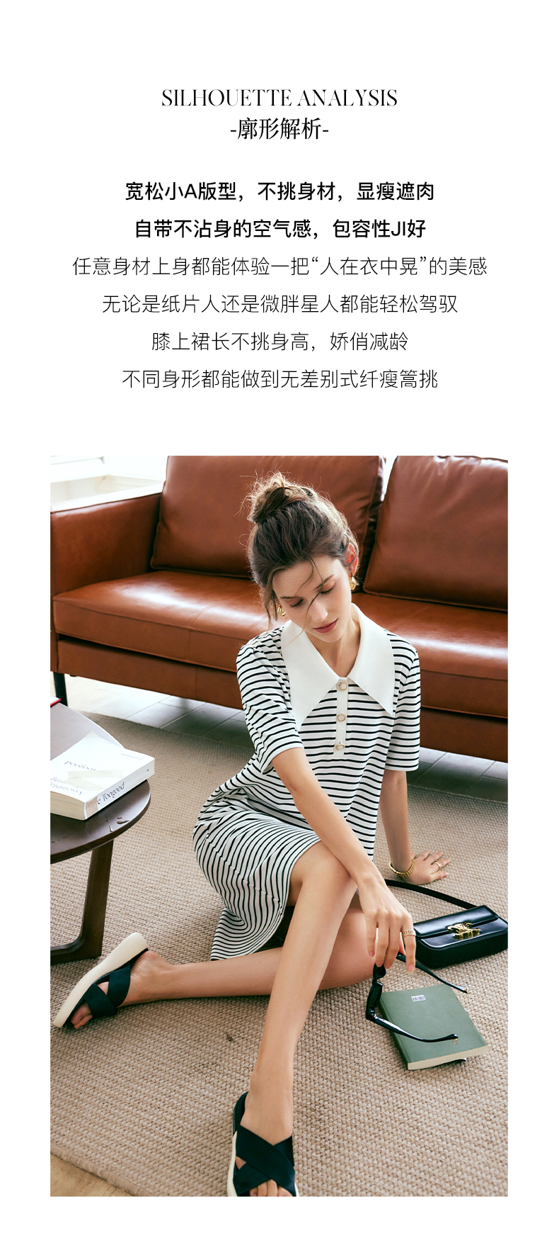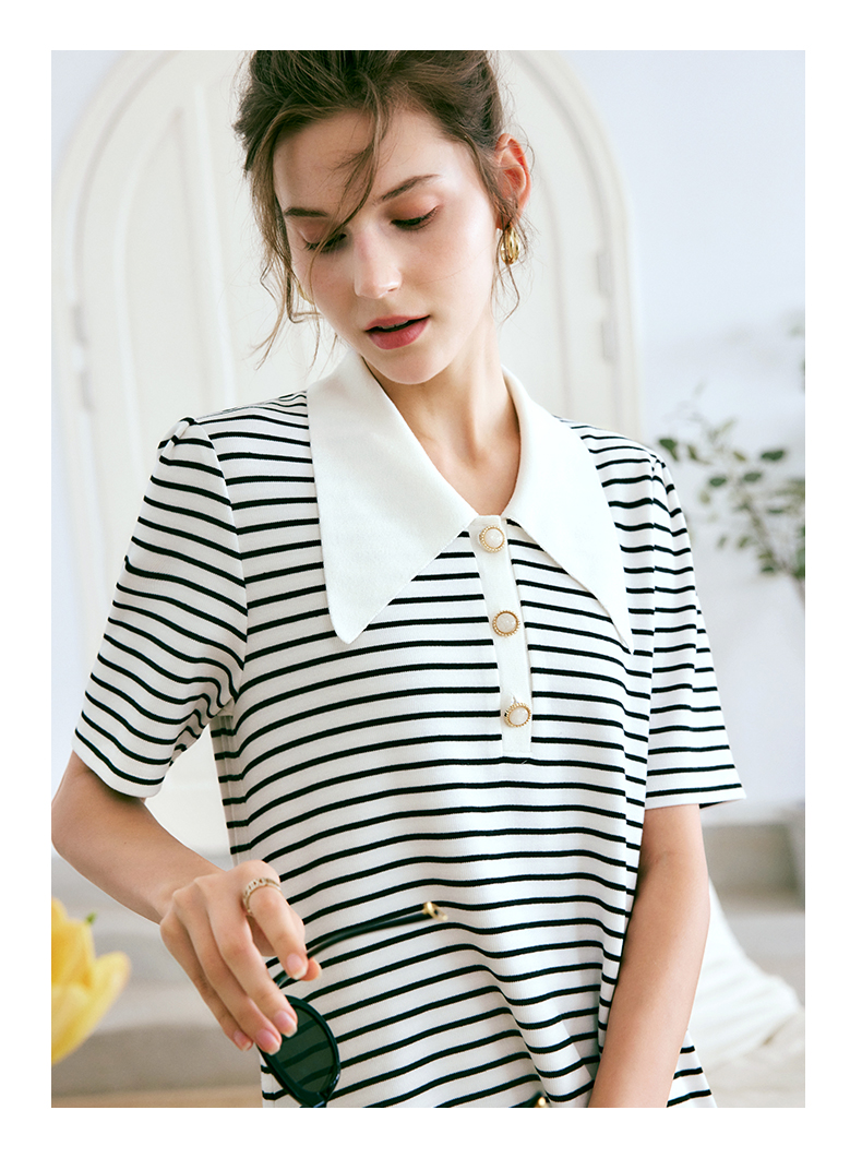 OLrain法式高级穿搭条纹T恤连衣裙女夏季2022新款气质减龄翻领裙