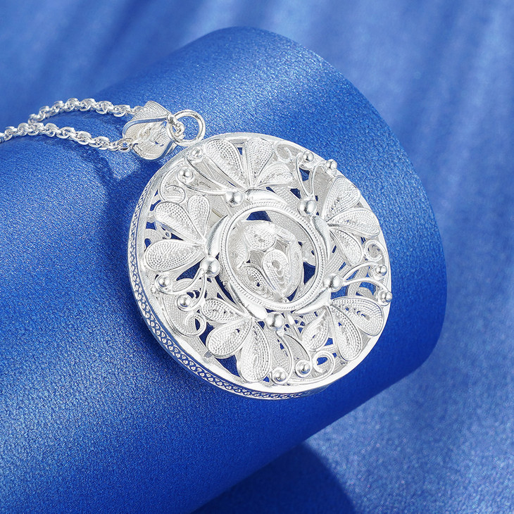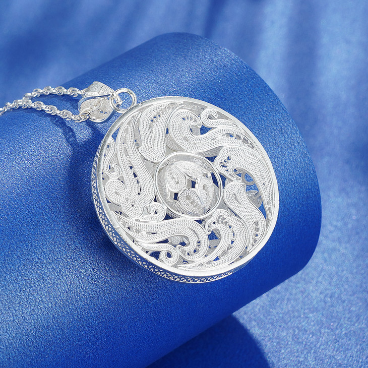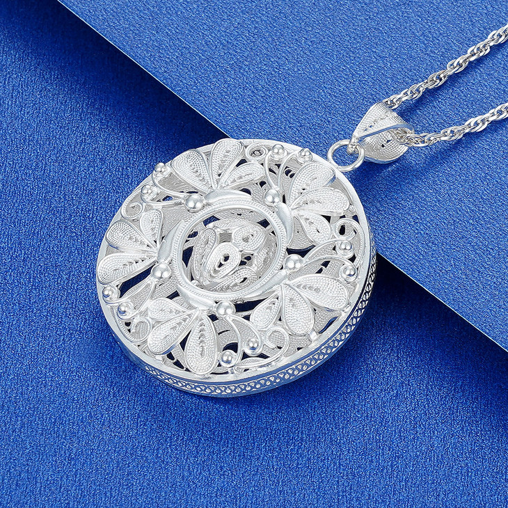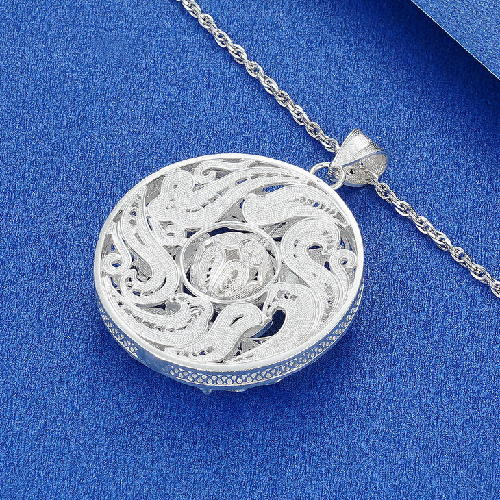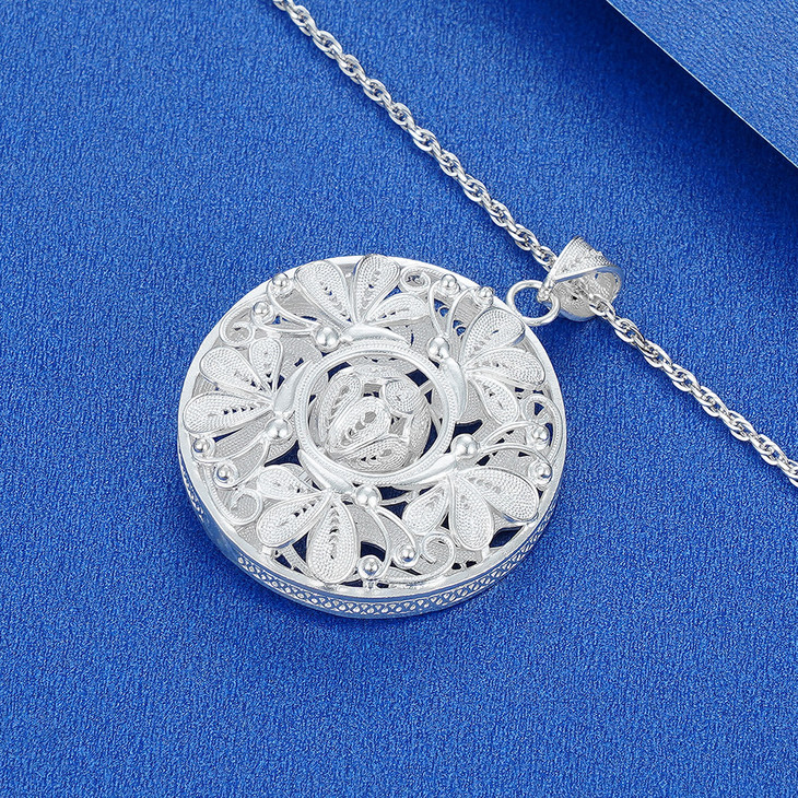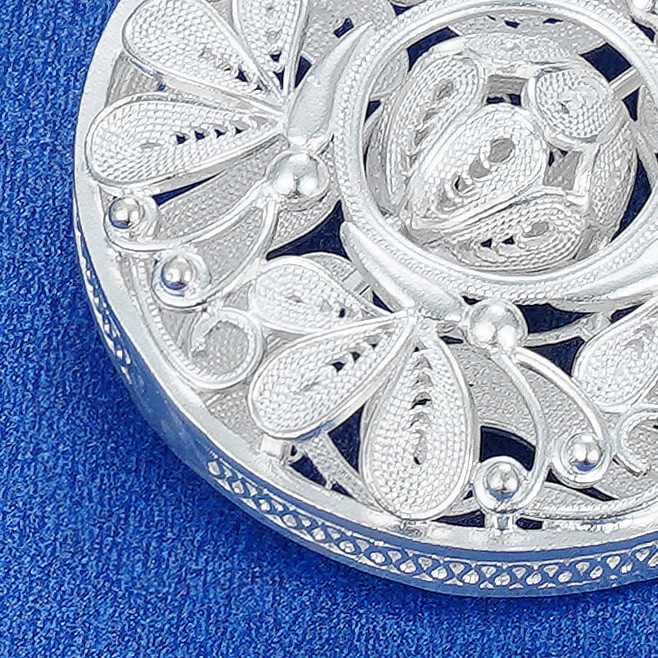 【寓意】:吊坠以银花丝工艺打造,花丝交织缠绕,勾勒出似花若蝶的灵动花纹,悠悠变幻之中,尽显非遗技艺之精妙。花与蝶的美妙邂逅,寓意着自此福气满盈。