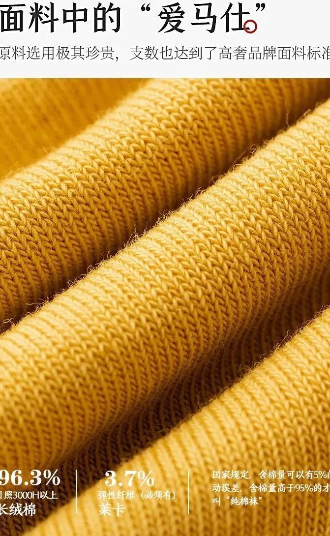 国家规定,只有含棉量高于95%的才能叫“纯棉袜”。而这款袜子除了弹性纤维外,剩下96.3%,采用的都是新疆长绒棉,已超出国家对纯棉袜定制的标准,真纯棉好品质哦!