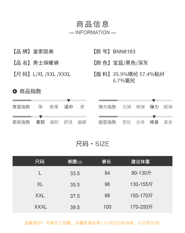 皇家丽美秋季男士德绒超细旦保暖打底裤BNN8163