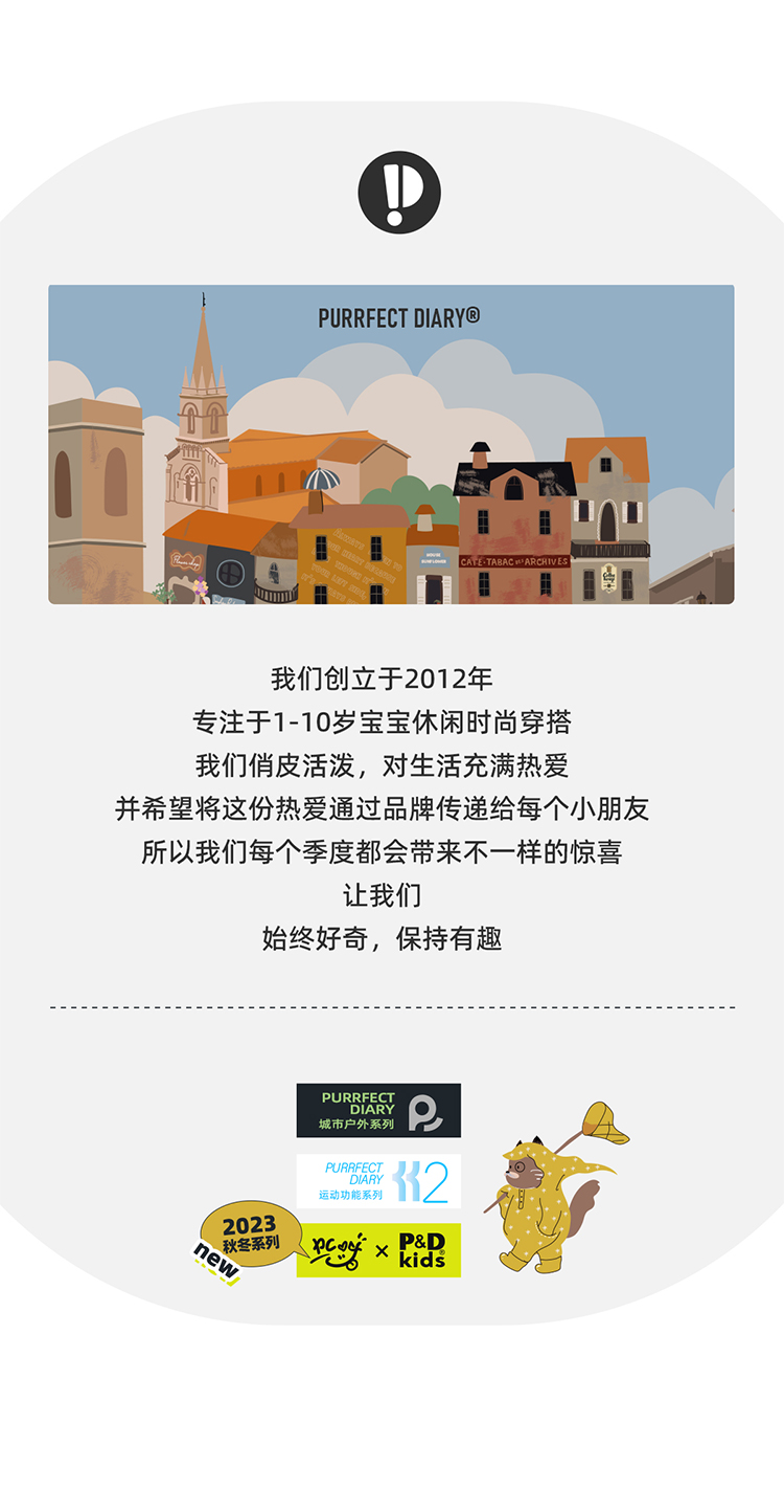 - Purrfect-Diary专注于贴近自然随性的穿着概念,轻奢平价的童装文化传播,在产品设计上更加注重婴童穿着的舒适性、安全性、更出众的国际化品牌,将欧美的育婴文化在中国进行深入的传播与推广。