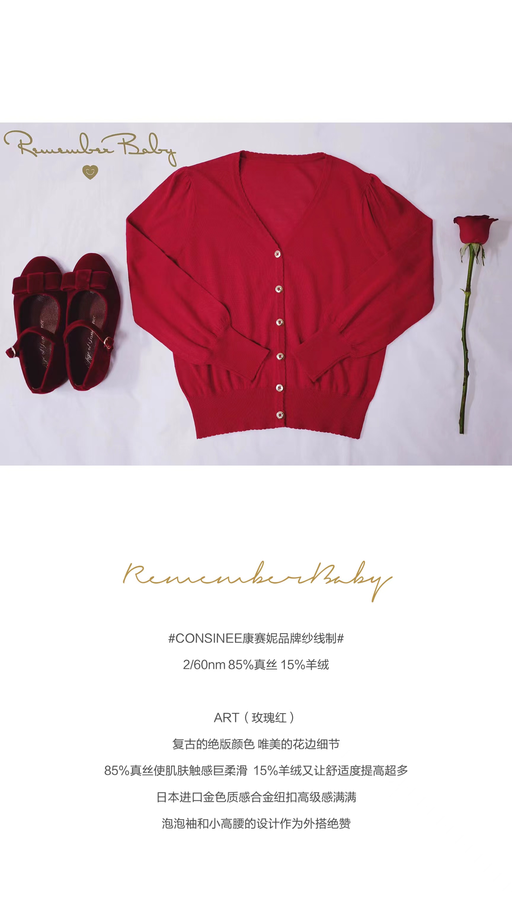 现货 / ART | 玫瑰红 康赛妮品牌纱线制 85%真丝15%羊绒 复古泡泡袖花边小开衫