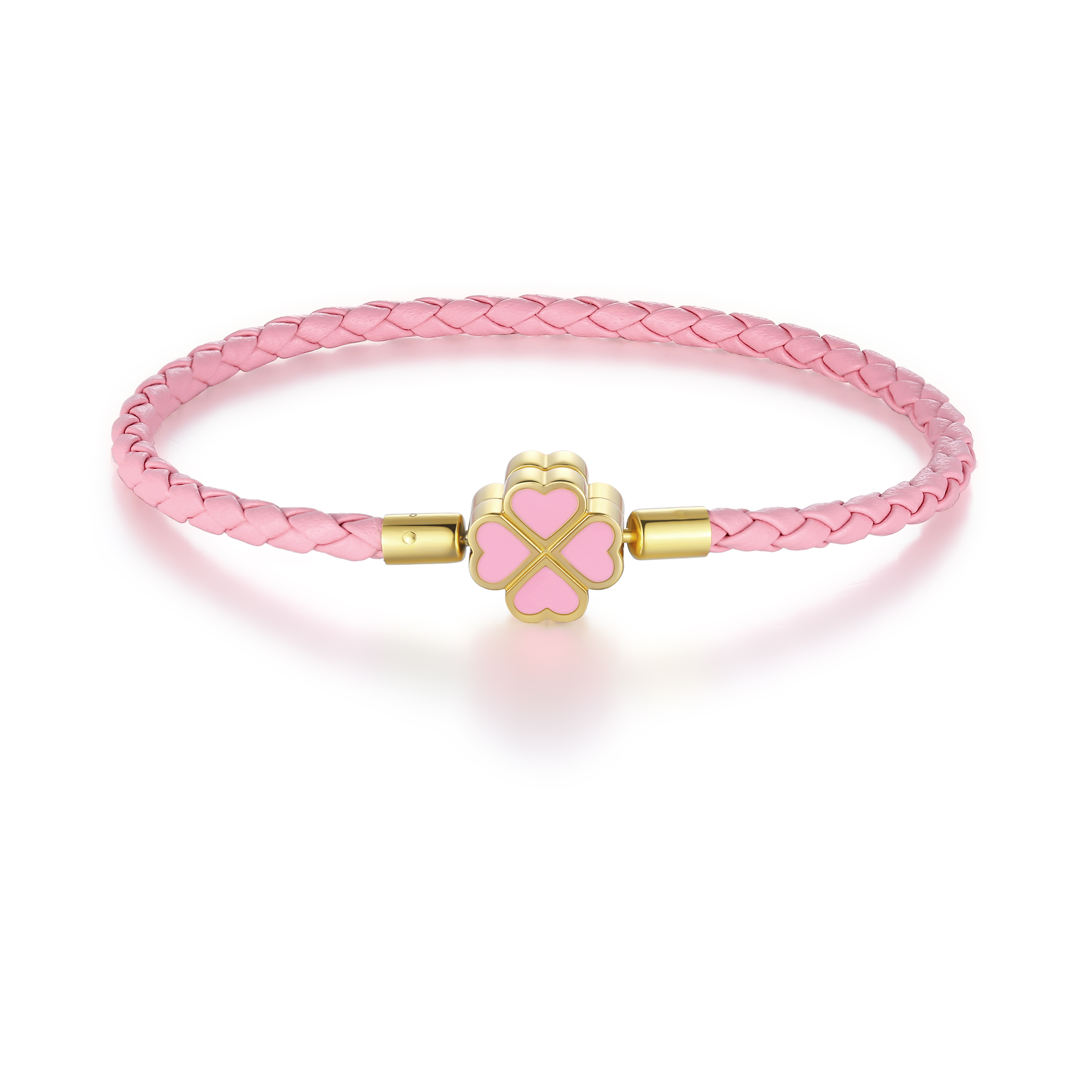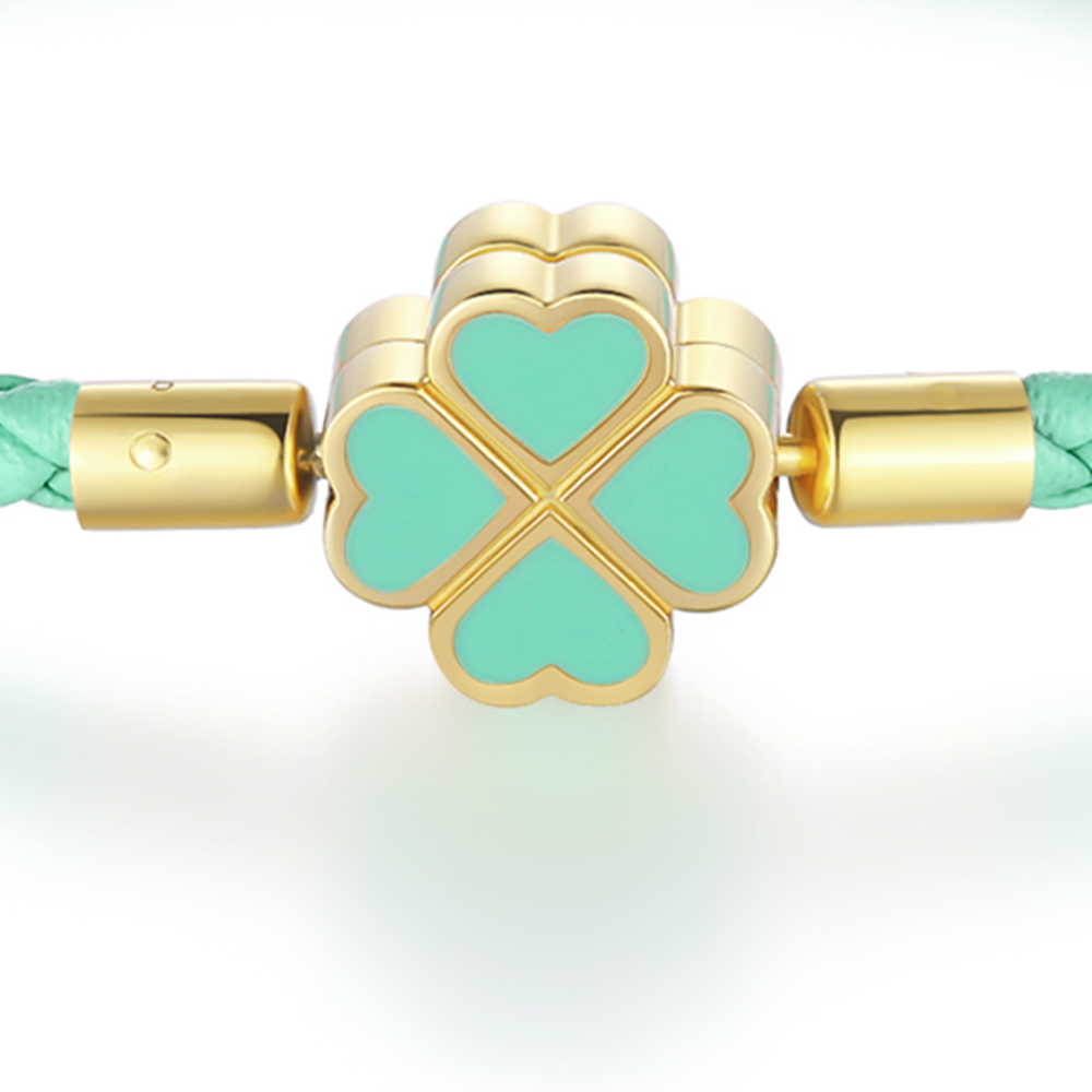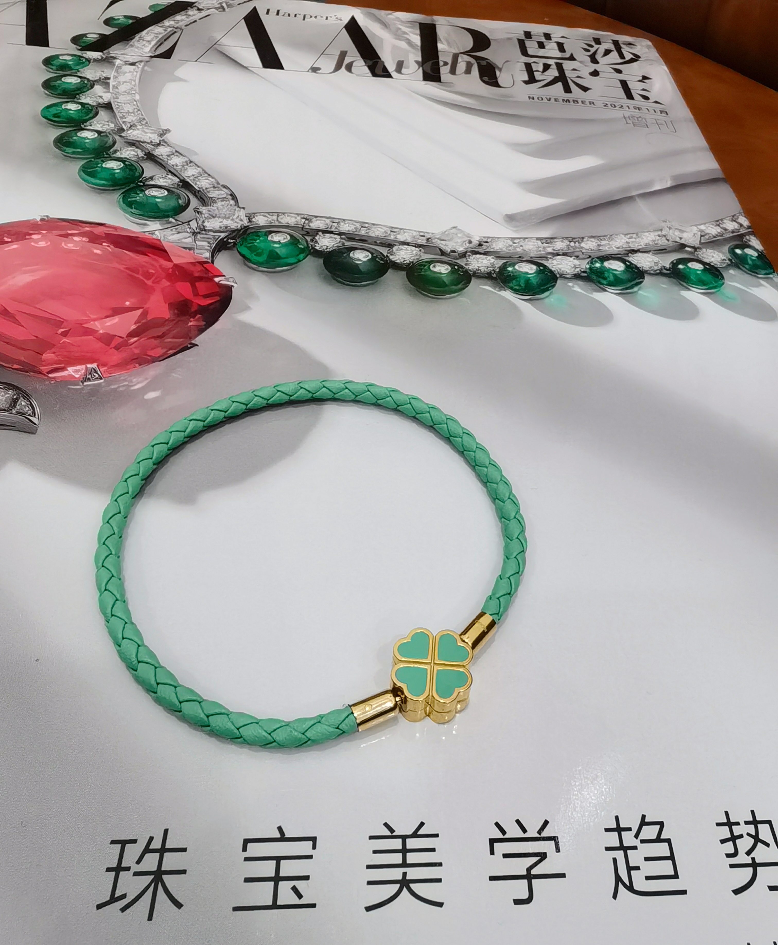 材质:意大利手工编织牛皮绳,真空电镀18K金四叶草开合扣,镶嵌珐琅