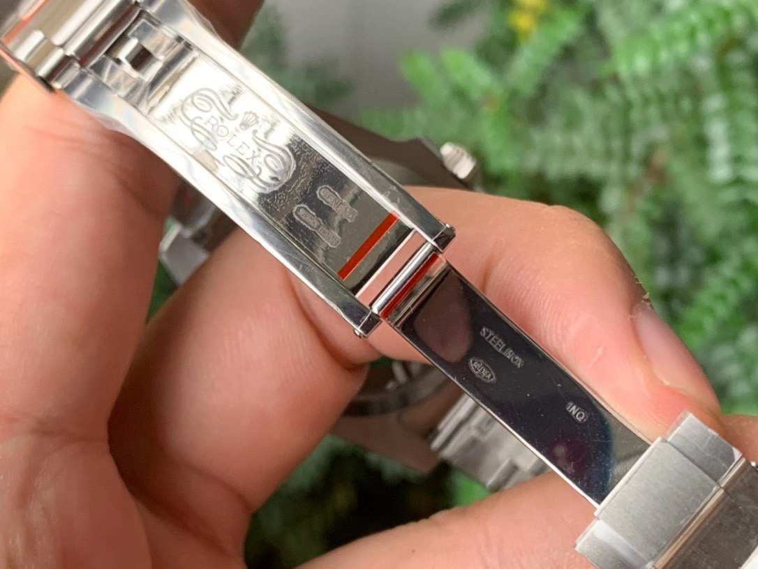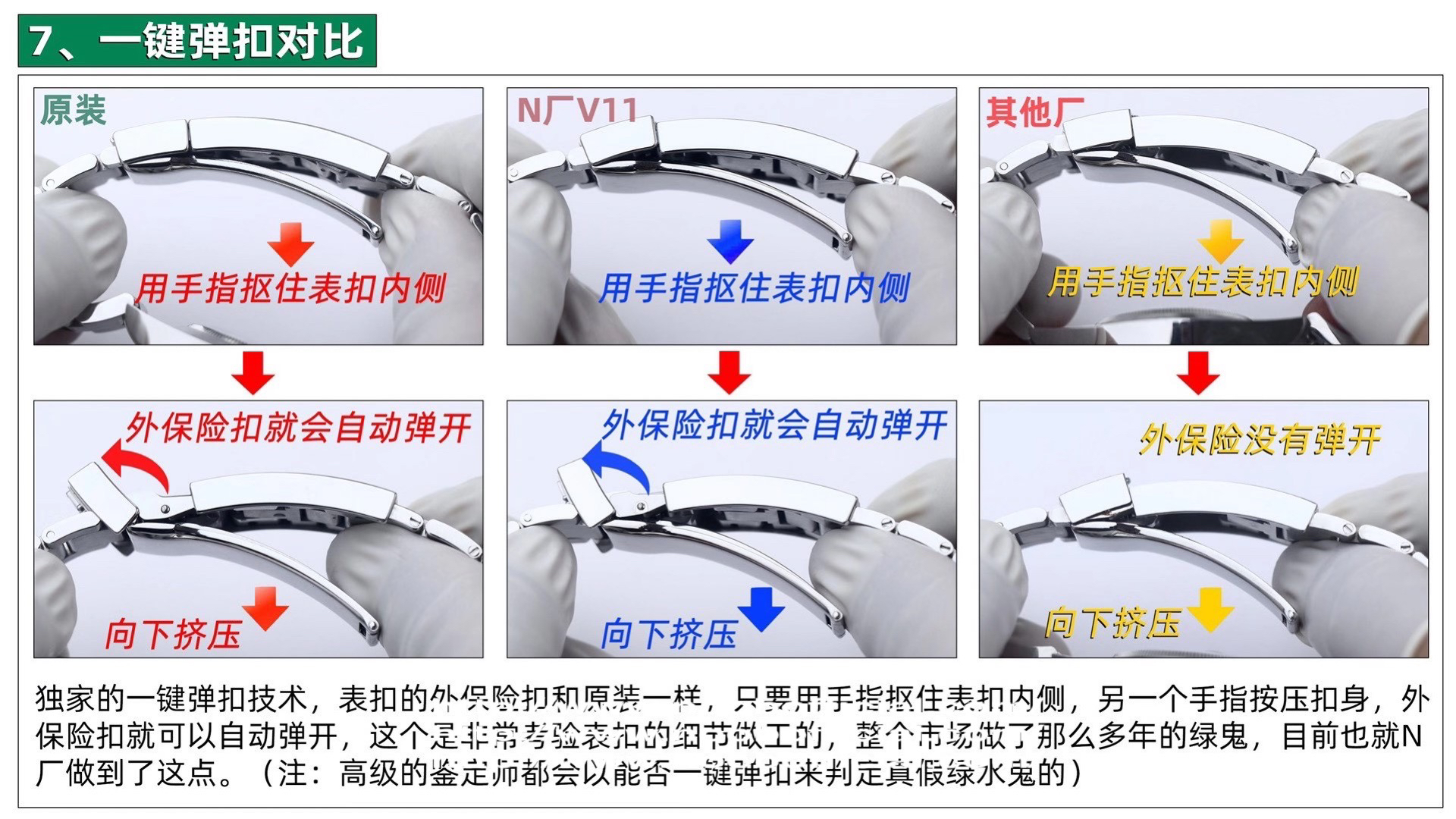 4、【可一键弹扣】表扣的外保险扣和原装一样,只要用手指抠住表扣内侧,另一个手指按压扣身,外保险扣就可以自动弹开。在整个市场也是独家技术。