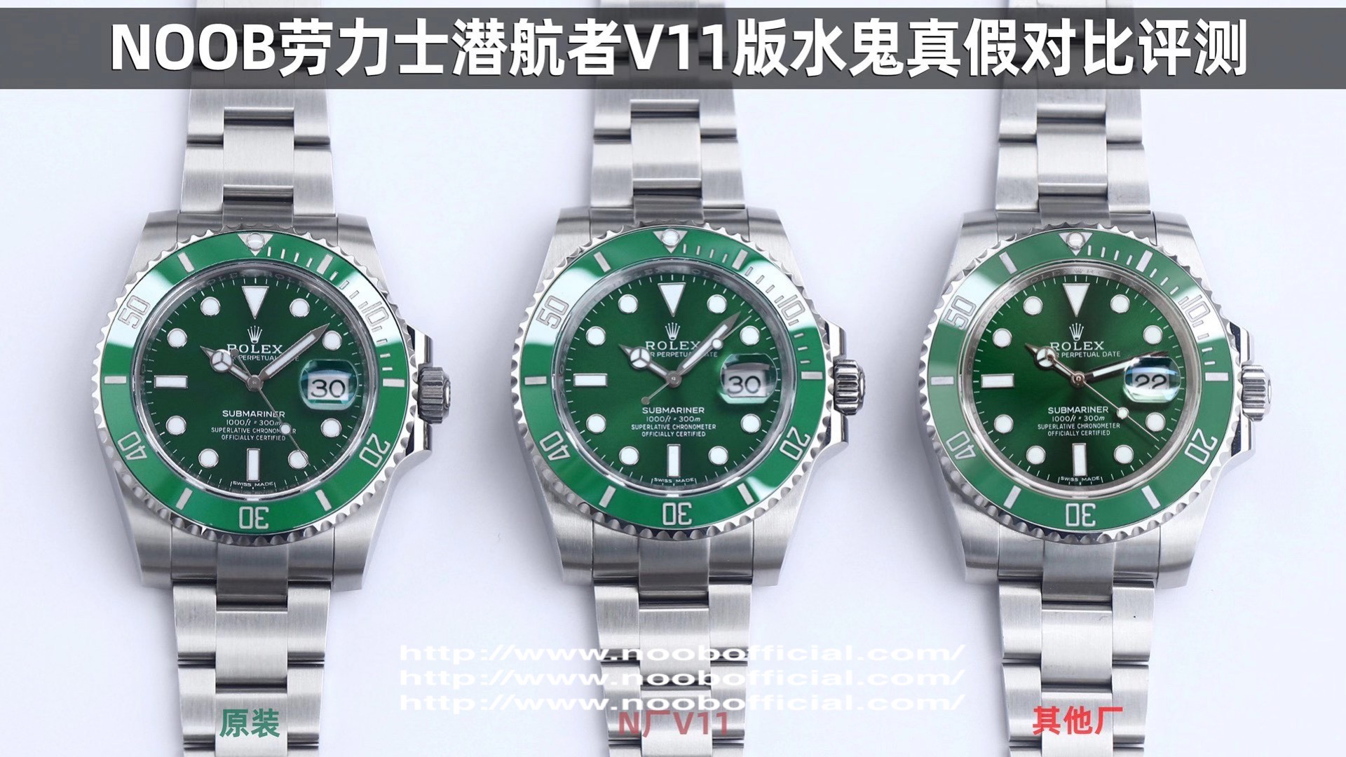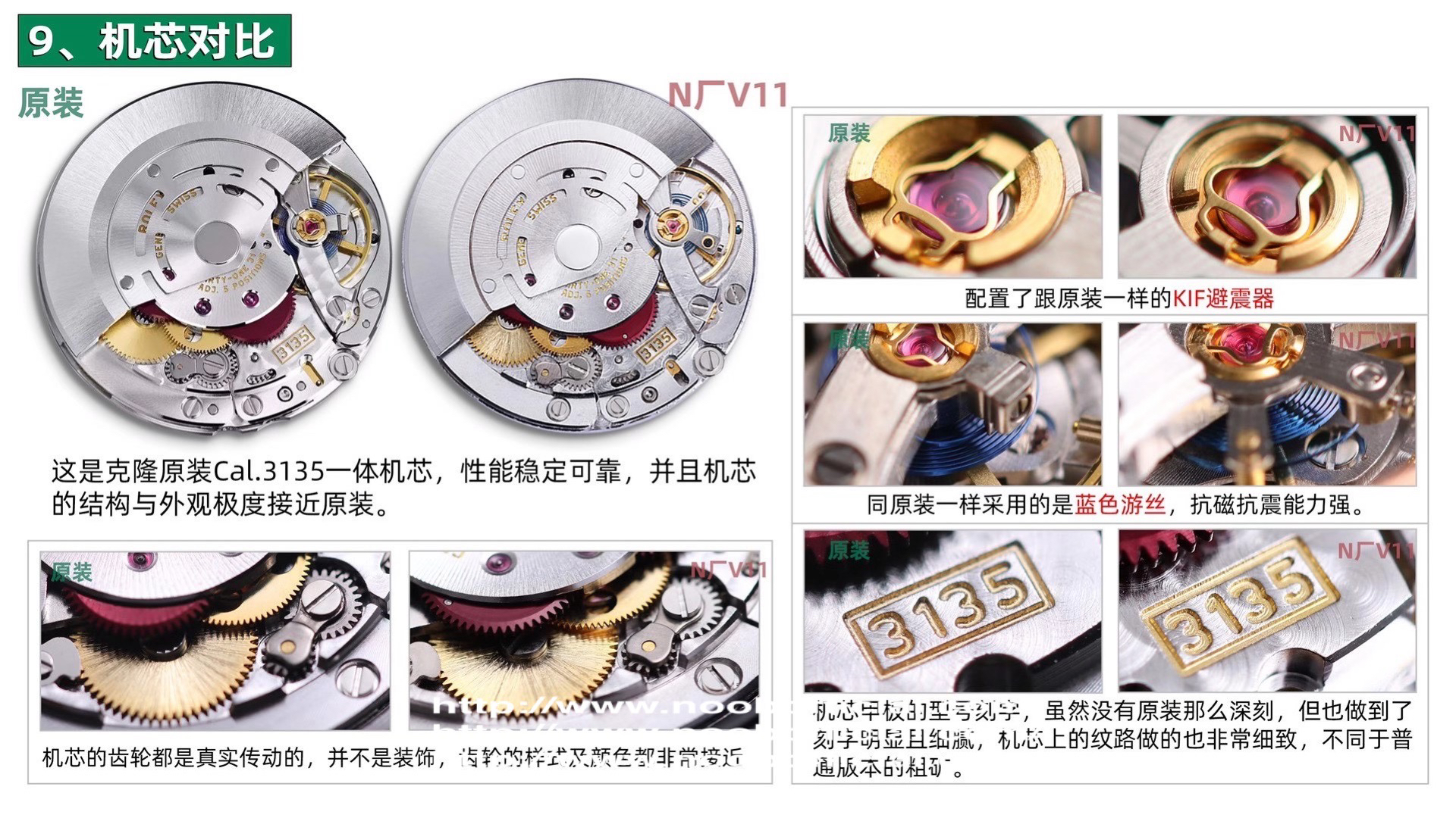 NOOB劳力士潜航者V11版水鬼强势来袭,特别是绿水鬼116610LV的圈口诚意满满,整个陶瓷圈脱胎换骨,按照全新的配方和温度烧制,肉眼下成色和原装毫无差异,彻底碾压市面所有版本。由于成本原因,价格也会比黑水鬼116610LN高出很多。另外实现了【蓝宝夜光石】和【一键弹扣】两大独家技术。克隆原装Cal.3135一体机芯,蓝色游丝,进口KIF避震器(非假三角避震器)。升级重点:
