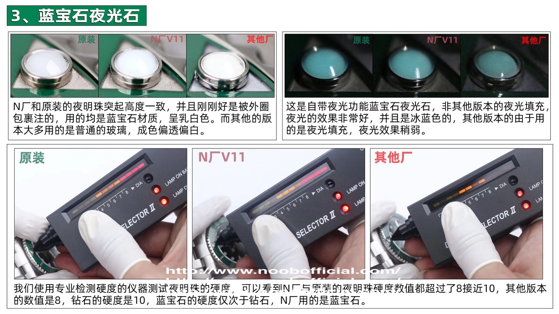 2、【蓝宝夜光石】独家技术,在夜光石外层加装了蓝宝石镜面,在仅3mm的直径内加装镜面实属艰难,通过高精准的先进设备,还是顺利的完成了,实现了和原装一样的防刮夜明珠。再一次力挽狂澜的证明了N厂的强大。