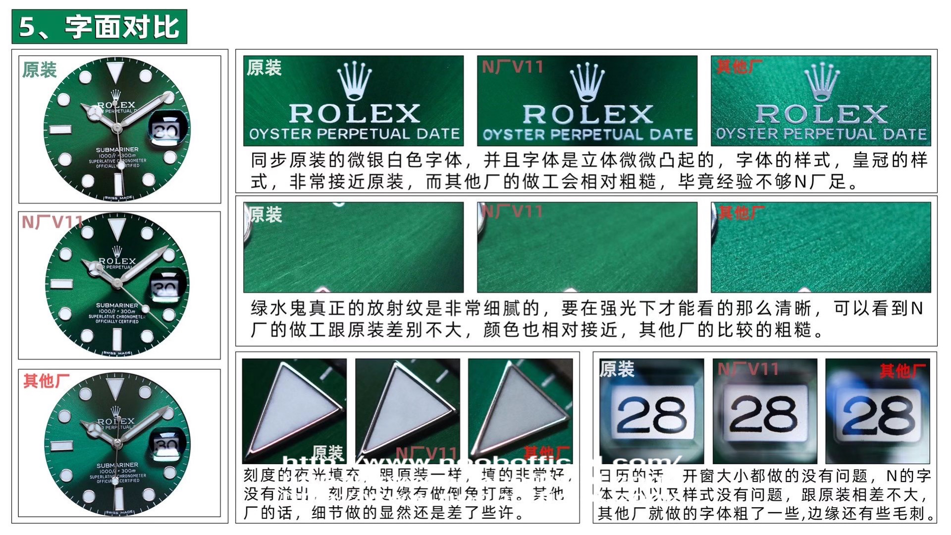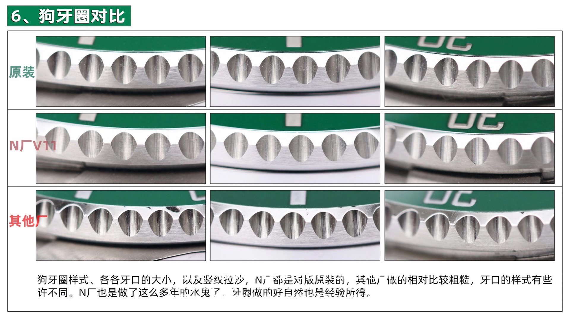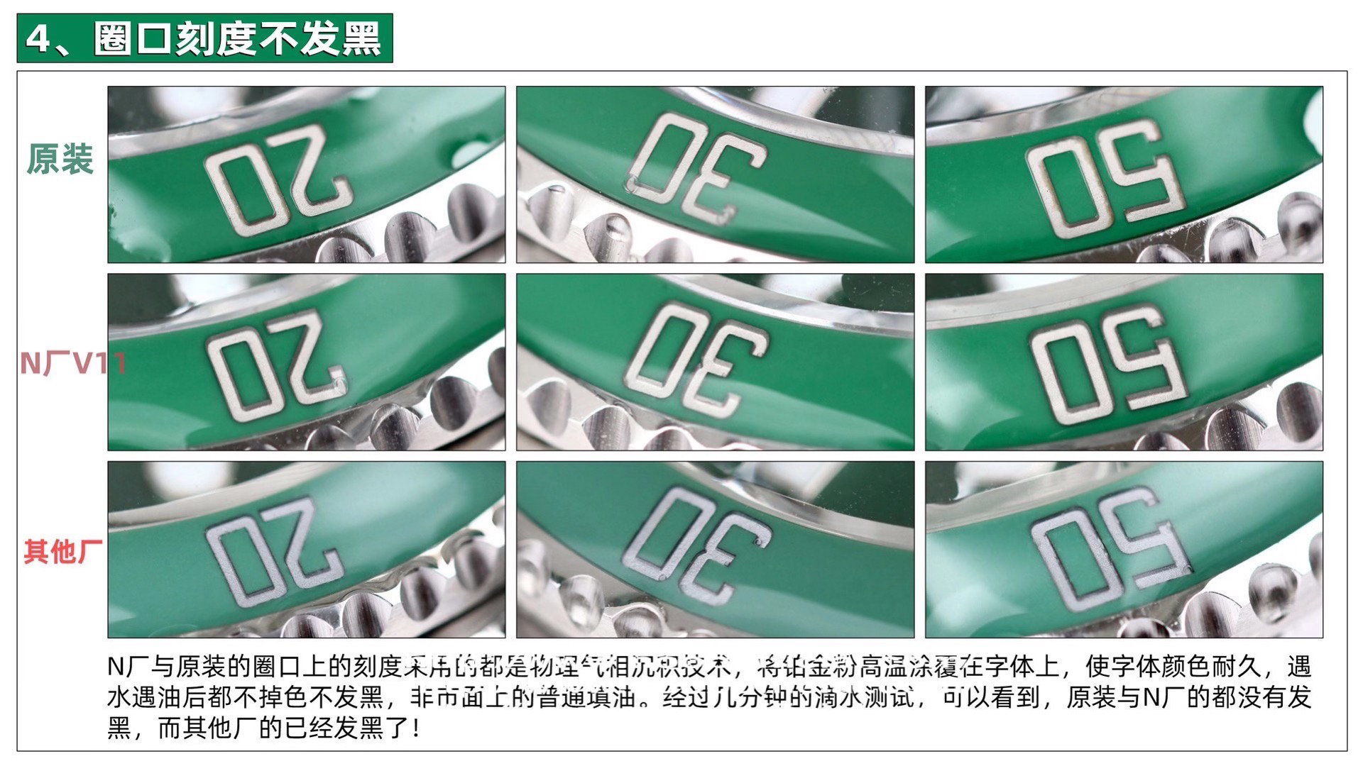 1、【乱真绿圈】全面解析原装Cerachrom绿色陶质外圈的成分,用二氧化硅包裹纳米合金着色、剂陶瓷着色的技术,通过不同温度的尝试最终确定了在1100到1250摄氏度之间烧制。N厂多年制劳的经验加之多位工程师的呕心沥血,最终给大家呈现出了殿堂级的绿色圈口,肉眼下专业人士也很难分辨真伪,彻底碾压了市场目前所有版本。