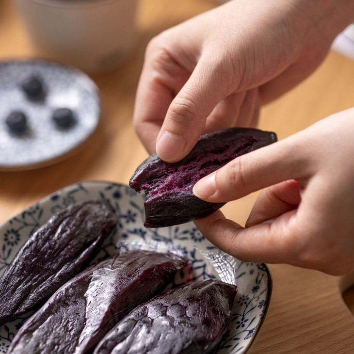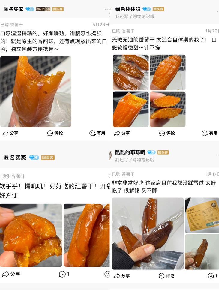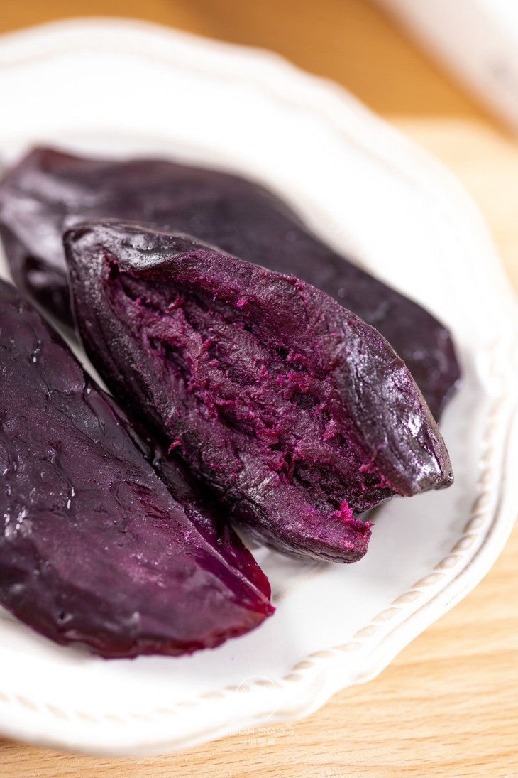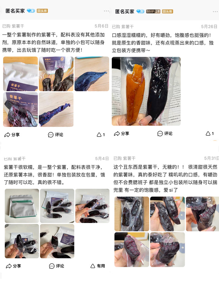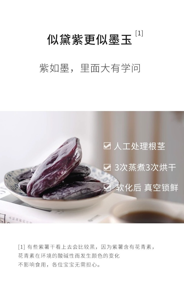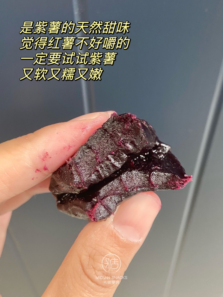 ✅三蒸三烘,更鲜甜! 自然糖化回软后的紫薯干很软糯 吃起来也有嚼劲,有点像刚煮出来的紫薯! 也是富含膳食纤维微量元素,还有花青素。