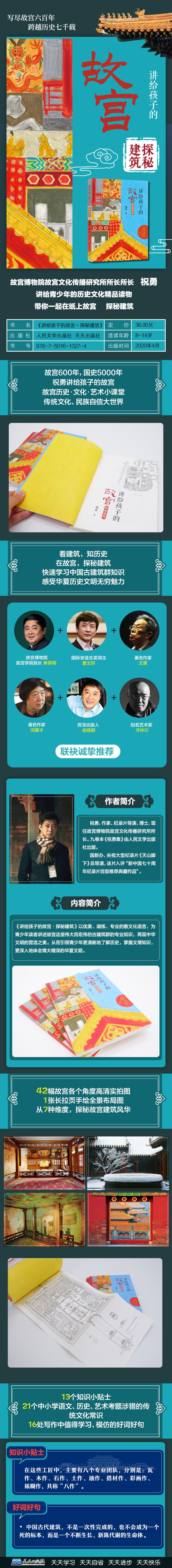 《探秘建筑/讲给孩子的故宫》精选祝勇新作《故宫六百年》中与故宫建筑知识相关、青少年读者值得了解和关注的7个主题(名字、空间、时间、地点、设计、布局、建筑物),每个主题下设置3个与建筑知识有关、青少年熟悉且易混淆的小问题。(如:“为什么故宫又叫紫禁城?”“故宫到底有多大?”“故宫是如何建成的?”“故宫的正门在哪儿?”“故宫里有哪些宫殿?”“中轴线是怎样一条线?”)作品以优美、凝练、专业的散文化语言,为青少年读者讲述故宫这座伟大而宏伟的古建筑群的专业知识,再现中华文明的营造之美。从而引领青少年更清晰地了解历史,掌握文博知识,更深入地体会博大精深的华夏文明。