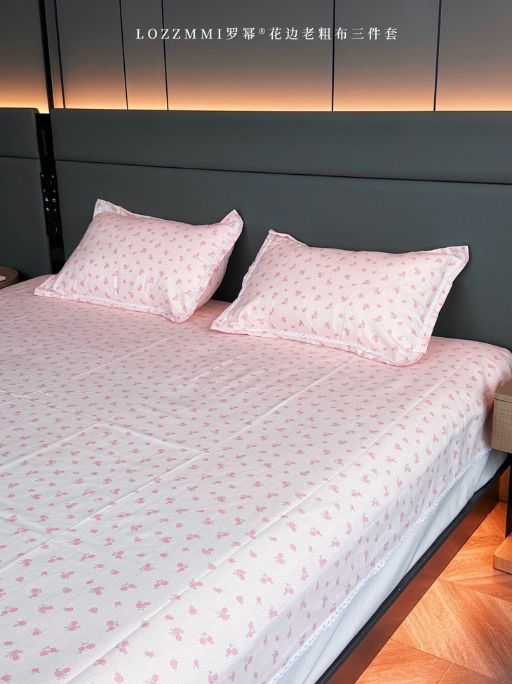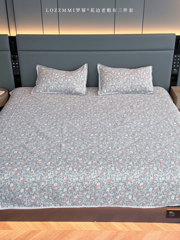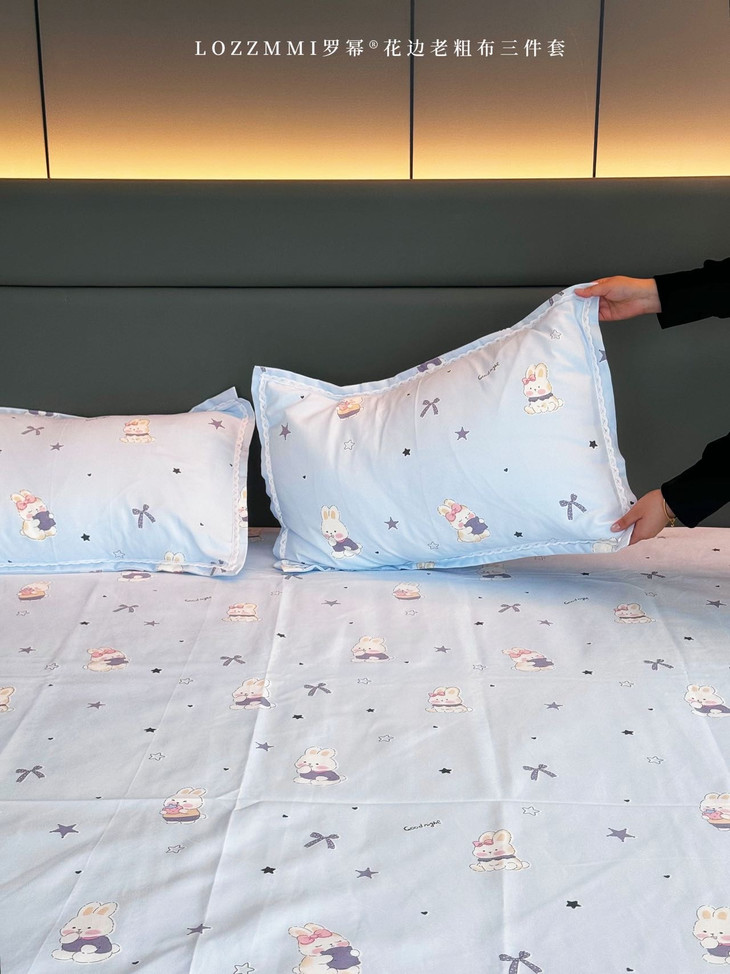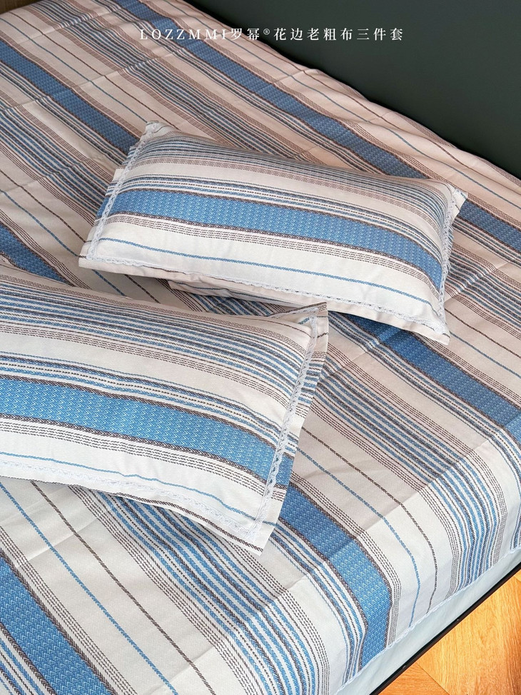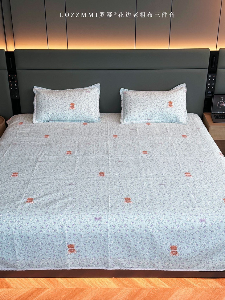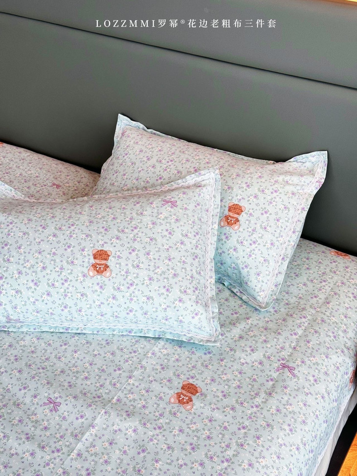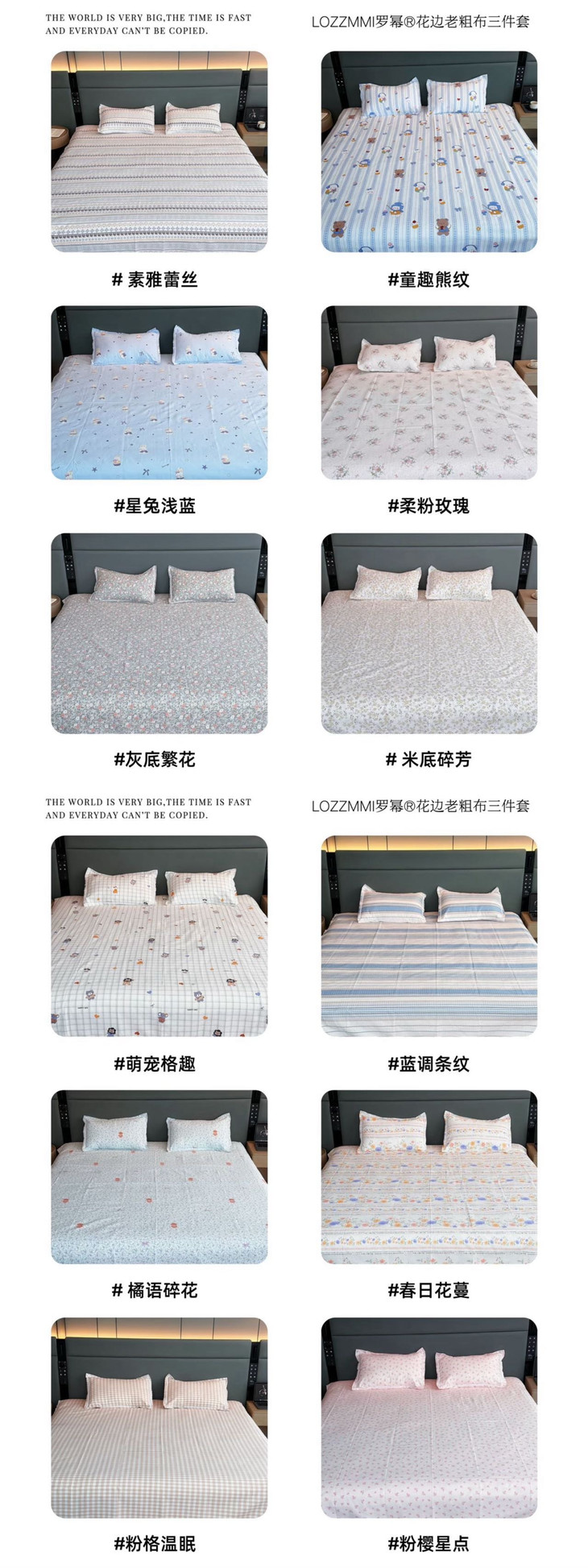 下单详情:LOZZMMI罗幂®花边老粗布三件套 尺寸:凉席:225*245cm 枕套48*74*2 (通用于1.5米/1.8米2.0/米床) 规格:12色可选 萌宠格趣、蓝调条纹、橘语碎花、春日花蔓 粉格温眠、粉樱星点、素雅蕾丝、童趣熊纹 星兔浅蓝、柔粉玫瑰、灰底繁花、米底碎芳