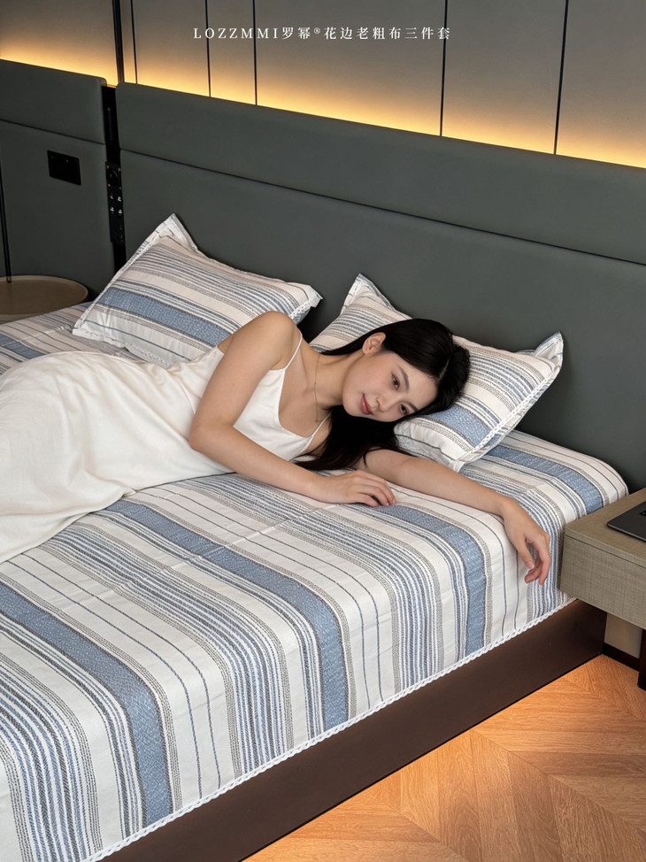 【蓝调条纹】 克制冷调的高级表达 低饱和蓝色条纹延展出清晰秩序感 没有多余装饰却自带高级氛围 老粗布结构让面料更有支撑透气不闷 贴肤干爽舒适,兼顾视觉冷静与触感温和