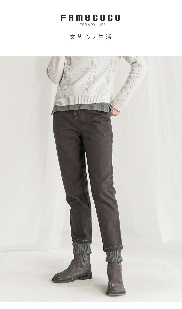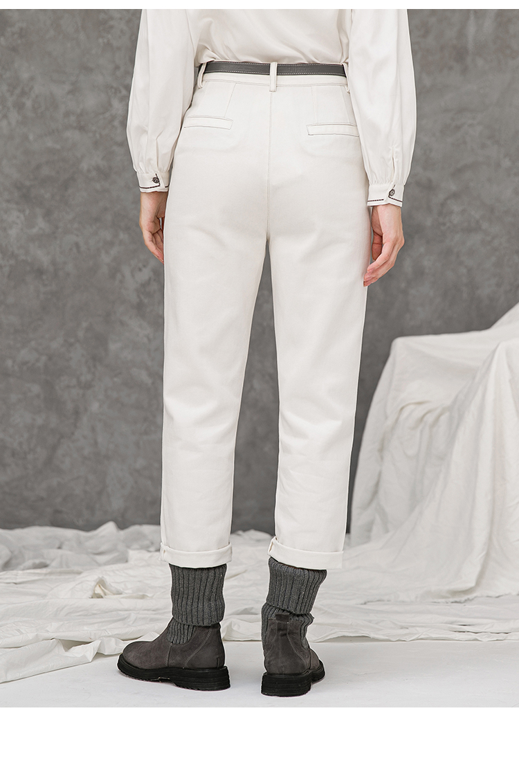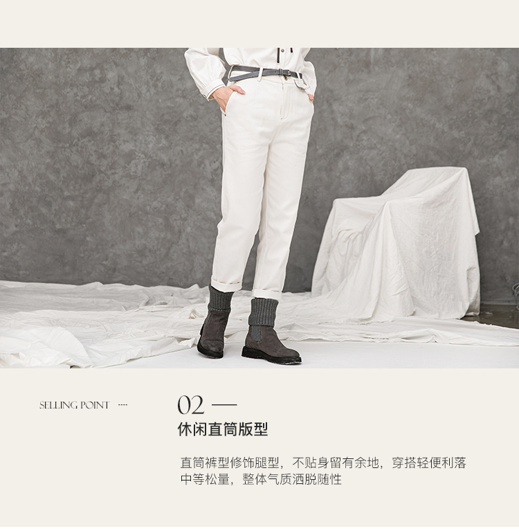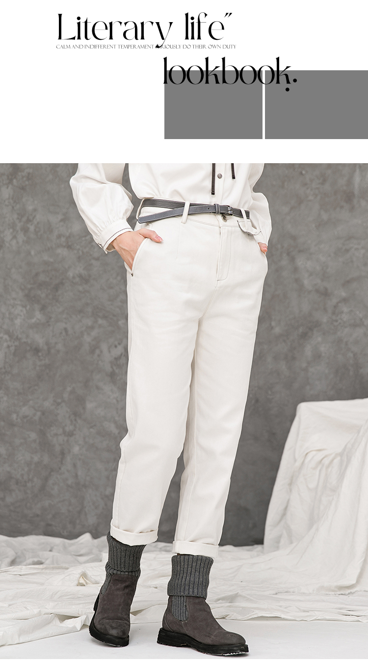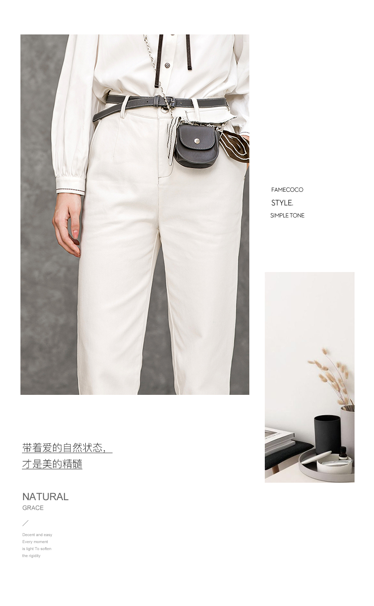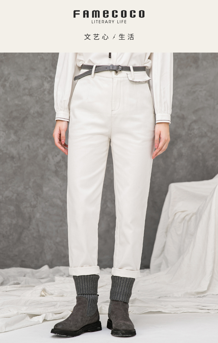 Famecoco范可儿休闲裤女秋冬宽松直筒裤子白色纯棉F218GA013