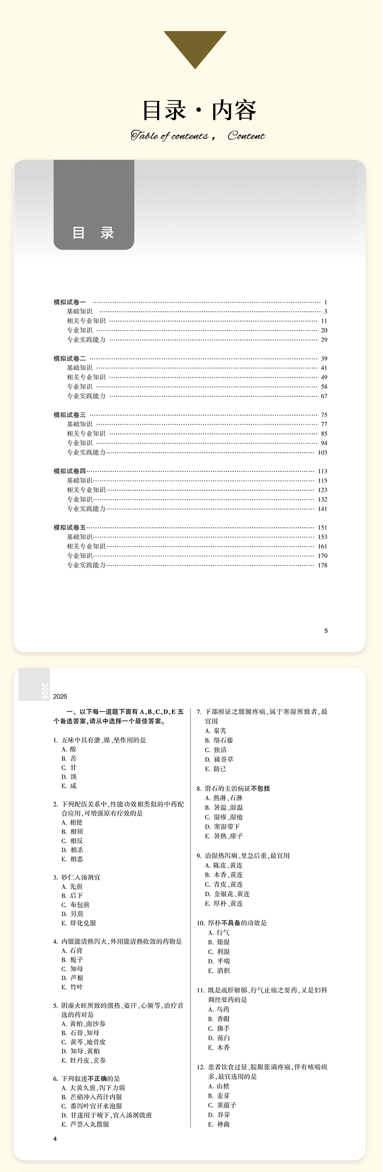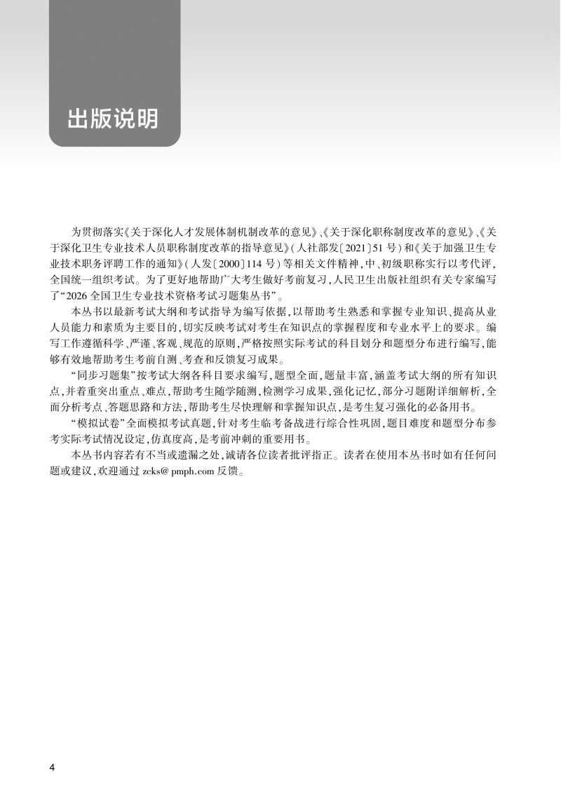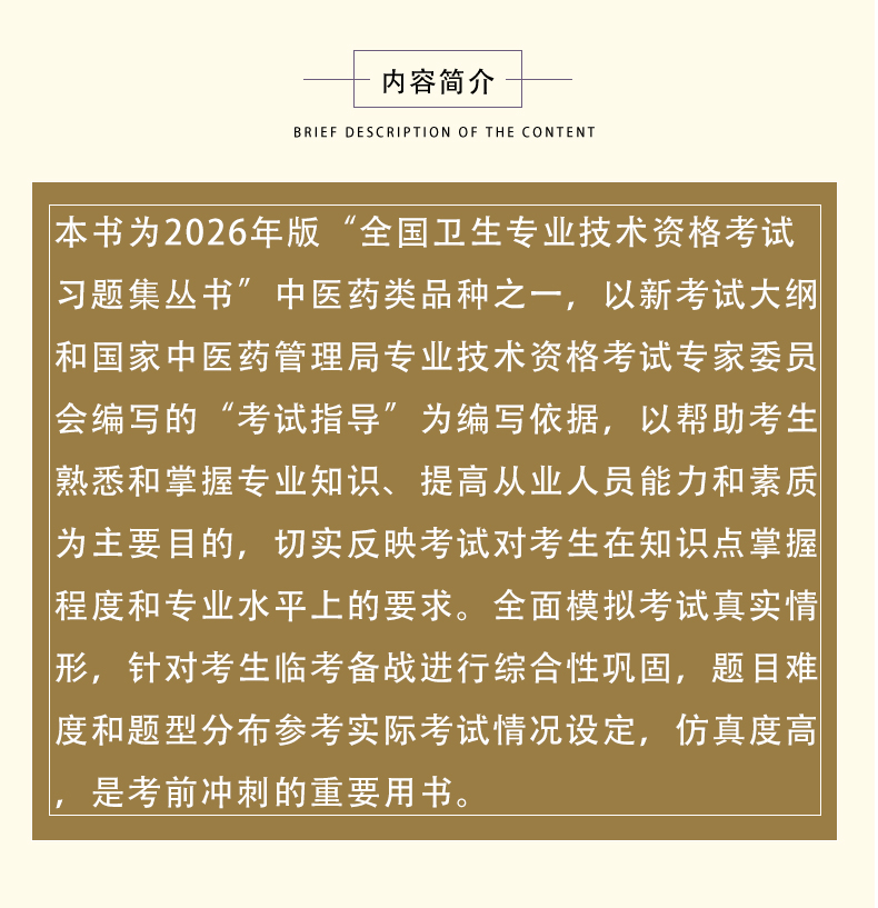 本书为2026年版“全国卫生专业技术资格考试习题集丛书”中医药类品种之一,以新考试大纲和国家中医药管理局专业技术资格考试专家委员会编写的“考试指导”为编写依据,以帮助考生熟悉和掌握专业知识、提高从业人员能力和素质为主要目的,切实反映考试对考生在知识点掌握程度和专业水平上的要求。全面模拟考试真实情形,针对考生临考备战进行综合性巩固,题目难度和题型分布参考实际考试情况设定,仿真度高,是考前冲刺的重要用书。