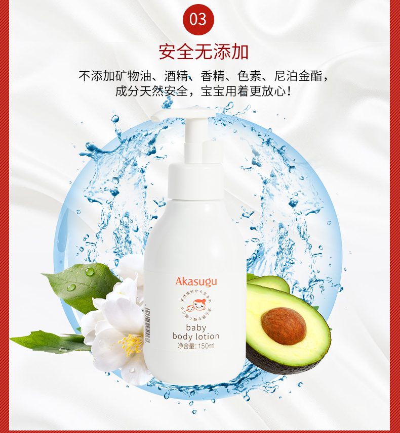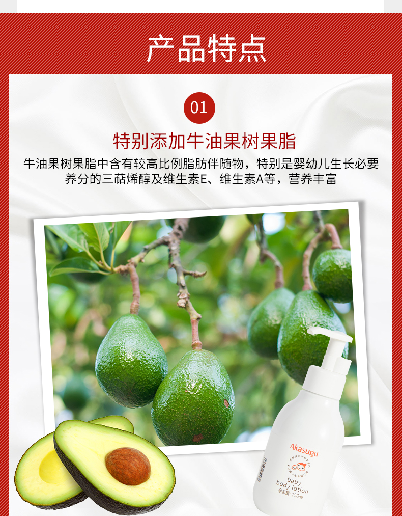 牛油果树果脂中含有最高比例脂肪伴随物,特别是婴幼儿生长必要养分的三萜烯醇及维生素E、维生素A等,营养丰富。该成分不仅能够防止肌肤水分流失,增强肌肤保湿能力,还能增加婴幼儿肌肤防御能力及柔顺度。