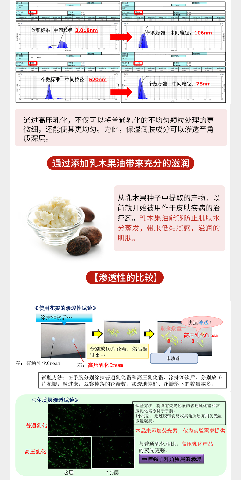 采用独创高压乳化技术,将分子缩小为普通分子的1/125,深层渗透至角质层,渗透力增强,吸收更快。
