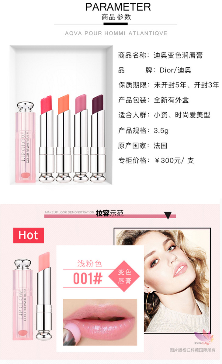 法国原装进口 迪奥(Dior) Dior迪奥口红魅惑粉漾润唇膏变色唇膏口红 保湿滋润烈艳蓝金 001浅粉色-人气色