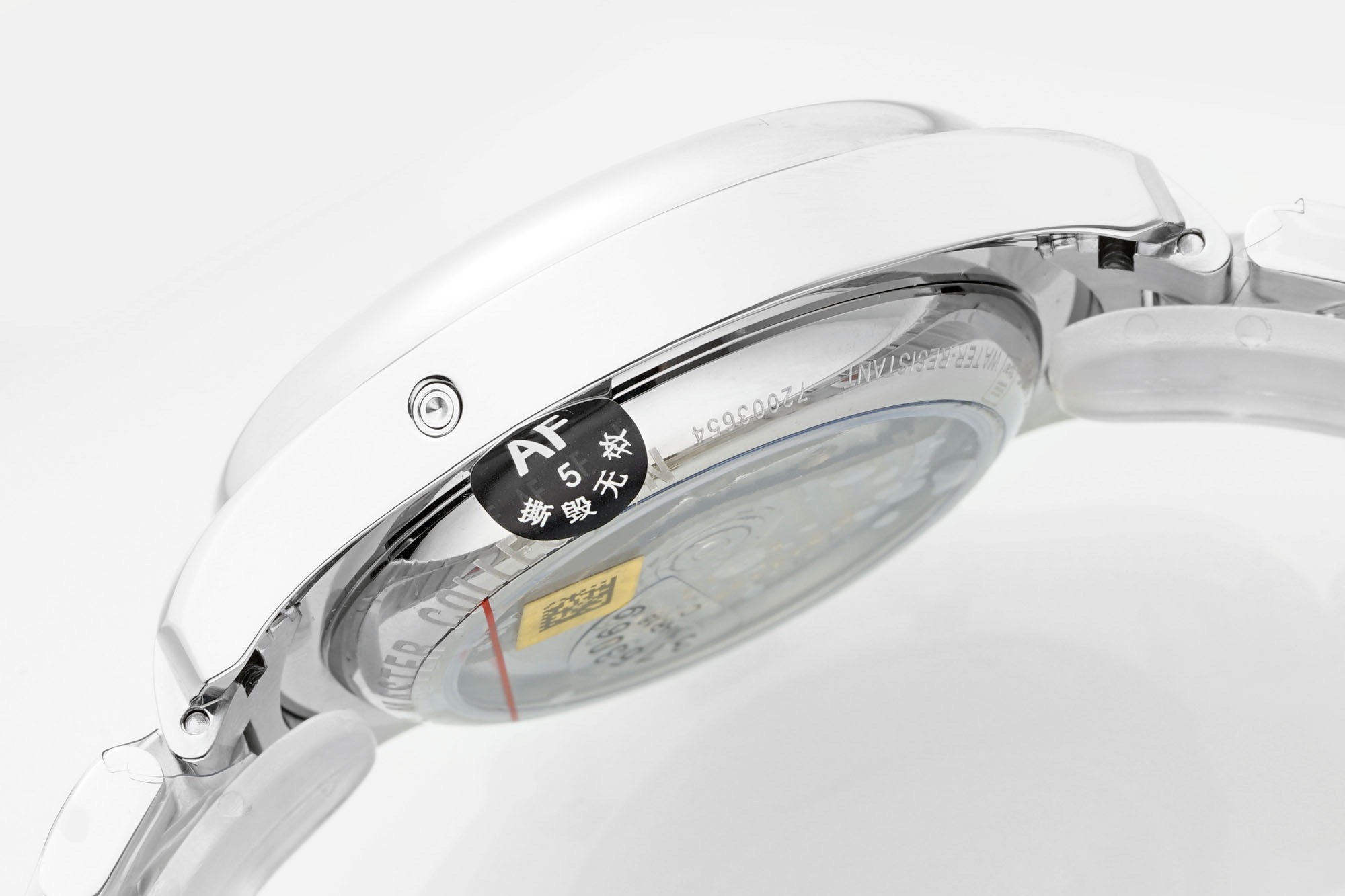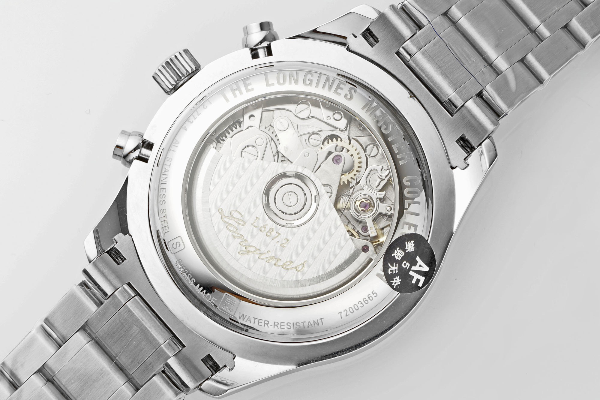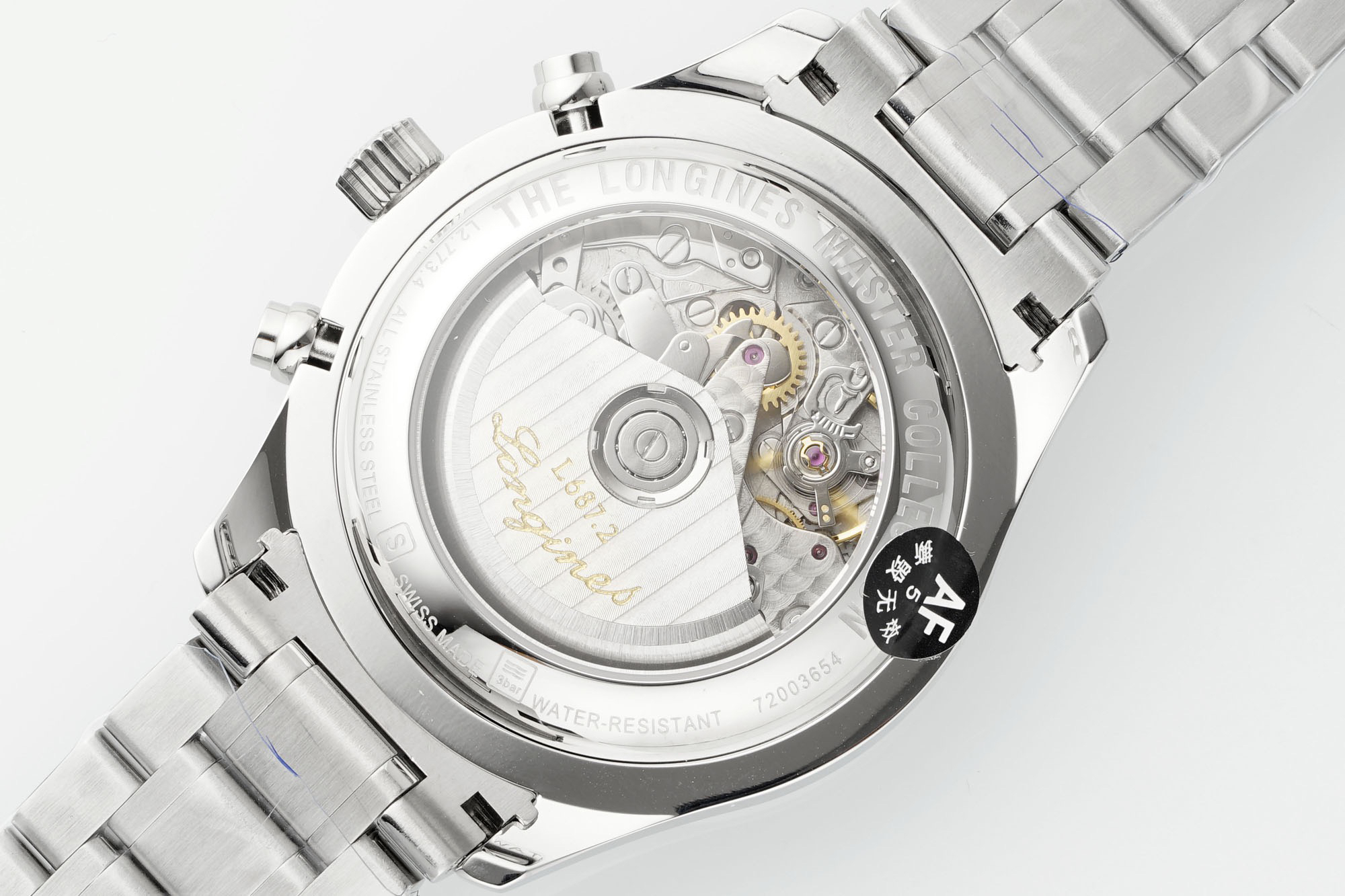 腕表做了背透,通过魔术窗里面的机芯清晰可见,自动舵有不错的打磨,足以见得AF的制表水准。