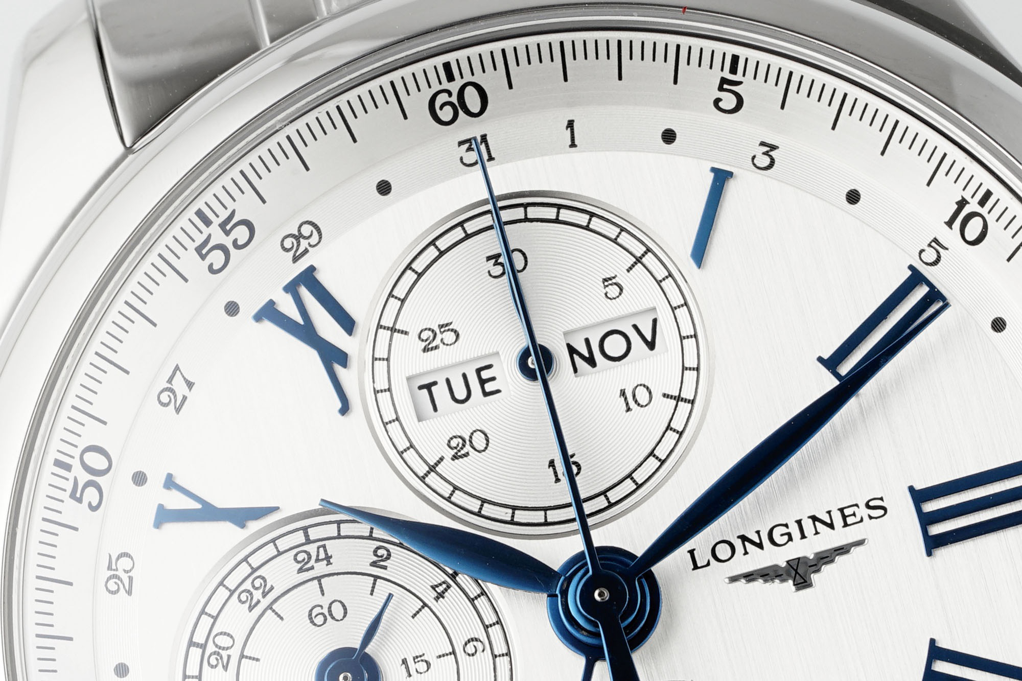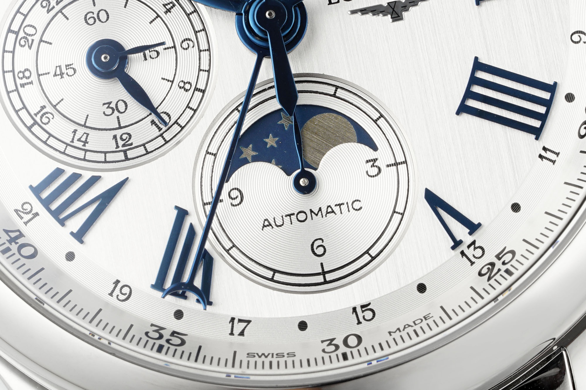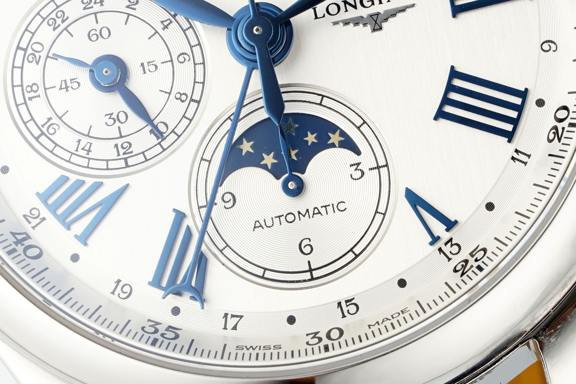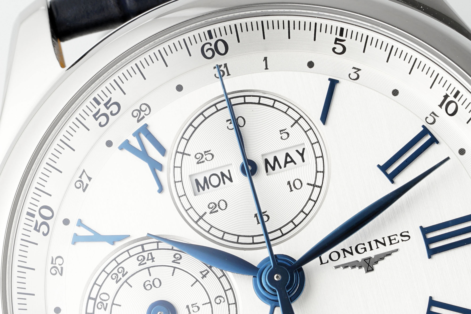 The classic "silver grain decoration" is arranged in an orderly manner with all complex functions on the textured dial. The four large hands, in addition to the hour and minute hands, are the sporty large second hand and the calendar hand with a small crescent at the end.