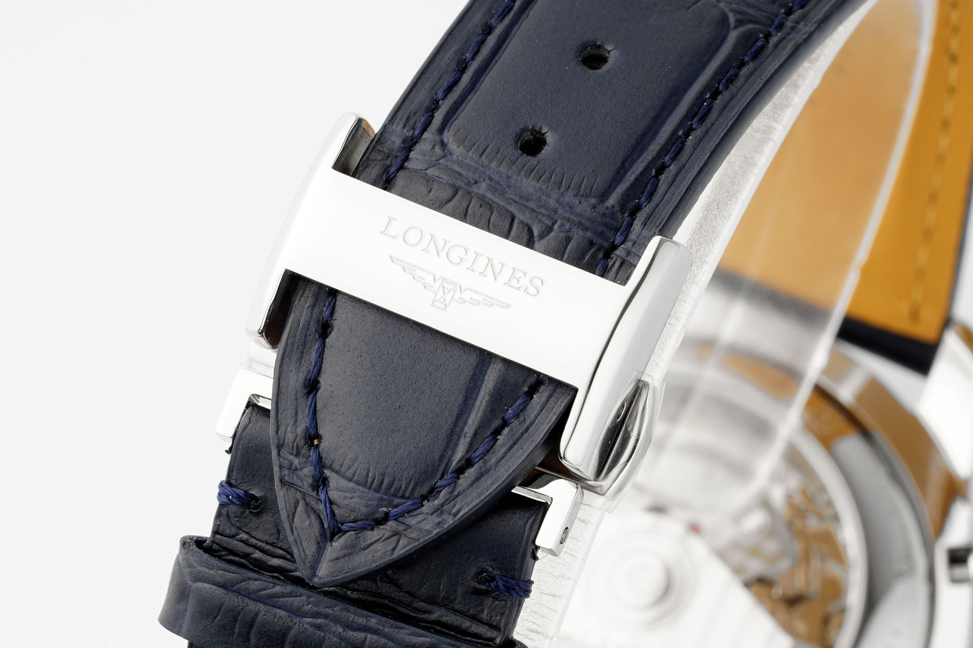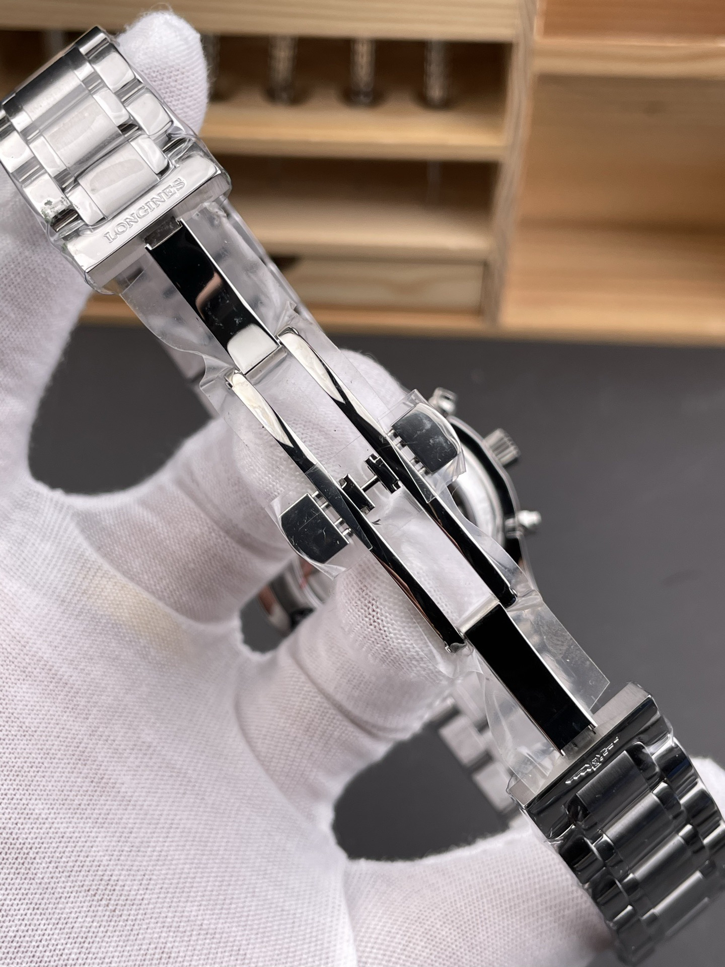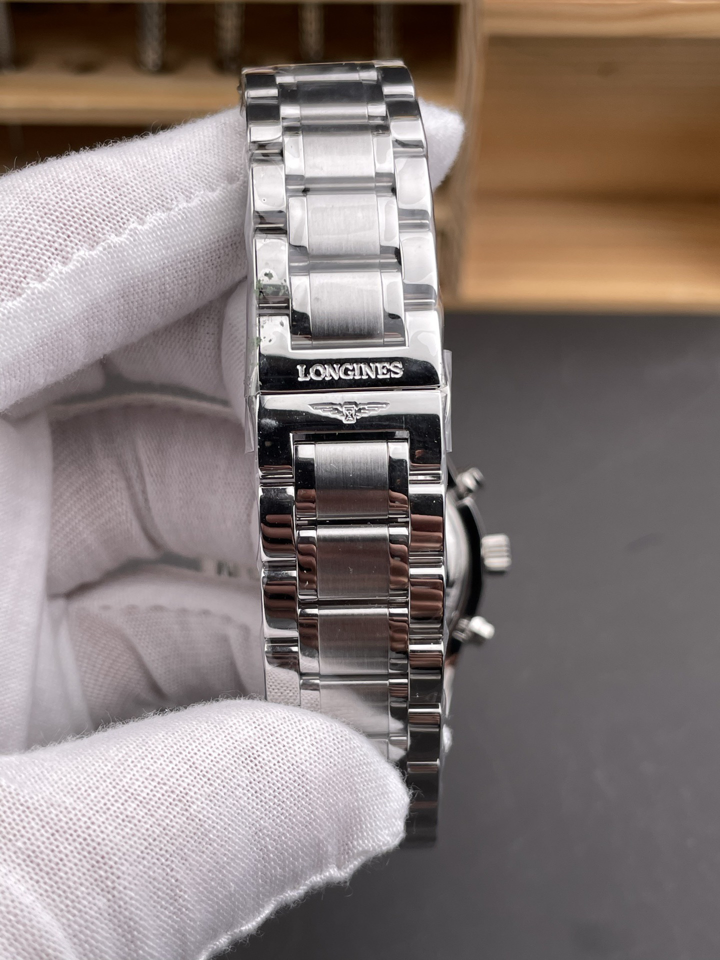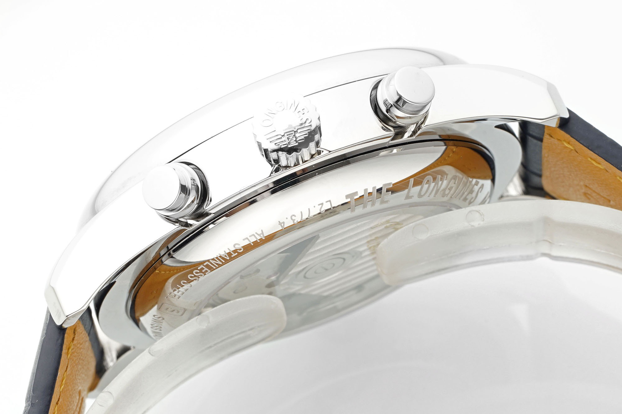 The 42mm stainless steel case has been polished, continuing the elegant temperament of Longines. The adjustment button for the calendar is hidden on the left side of the case, while the two major buttons for a regular sports watch and the crown in the middle are on the right side of the case.