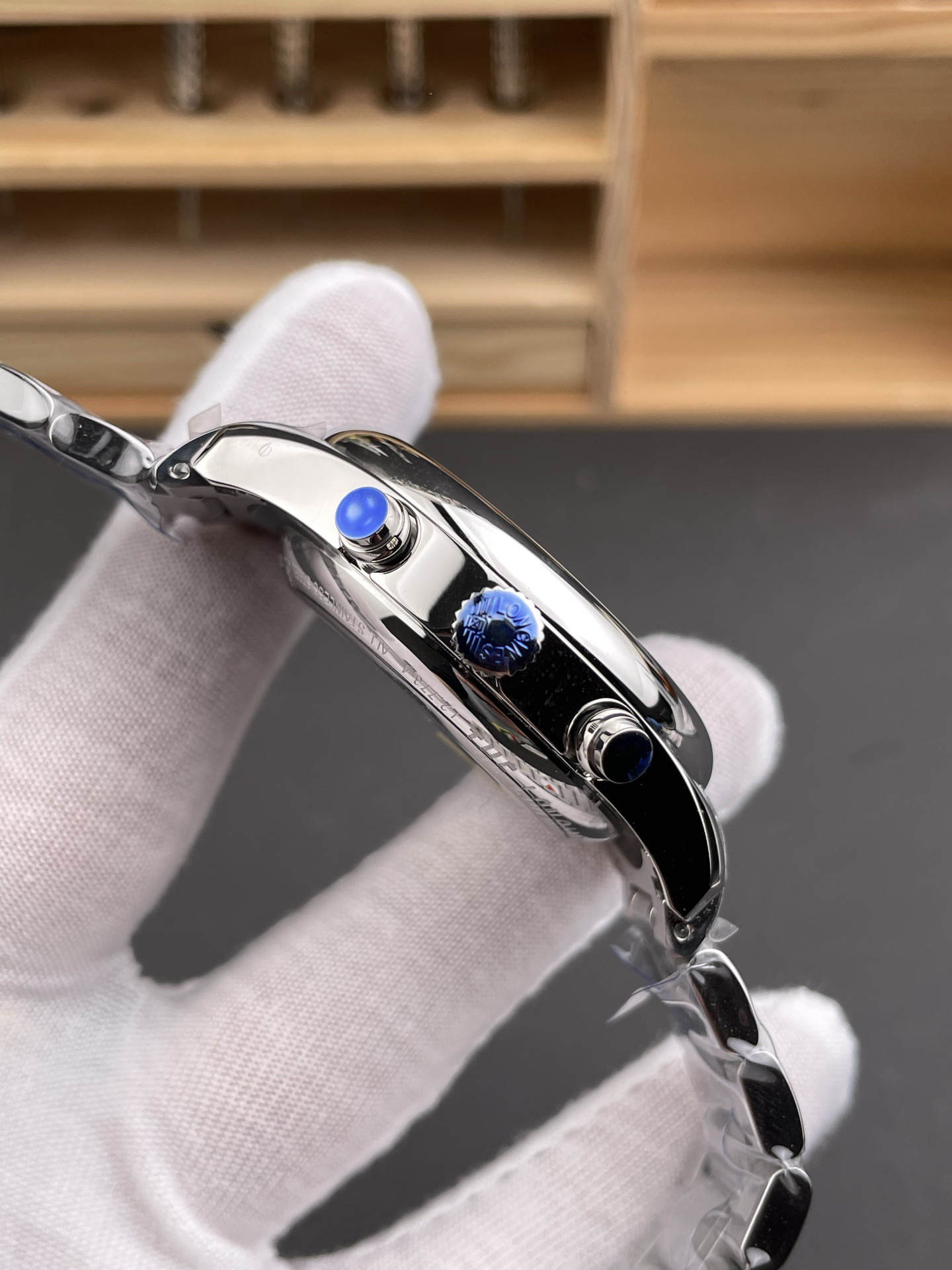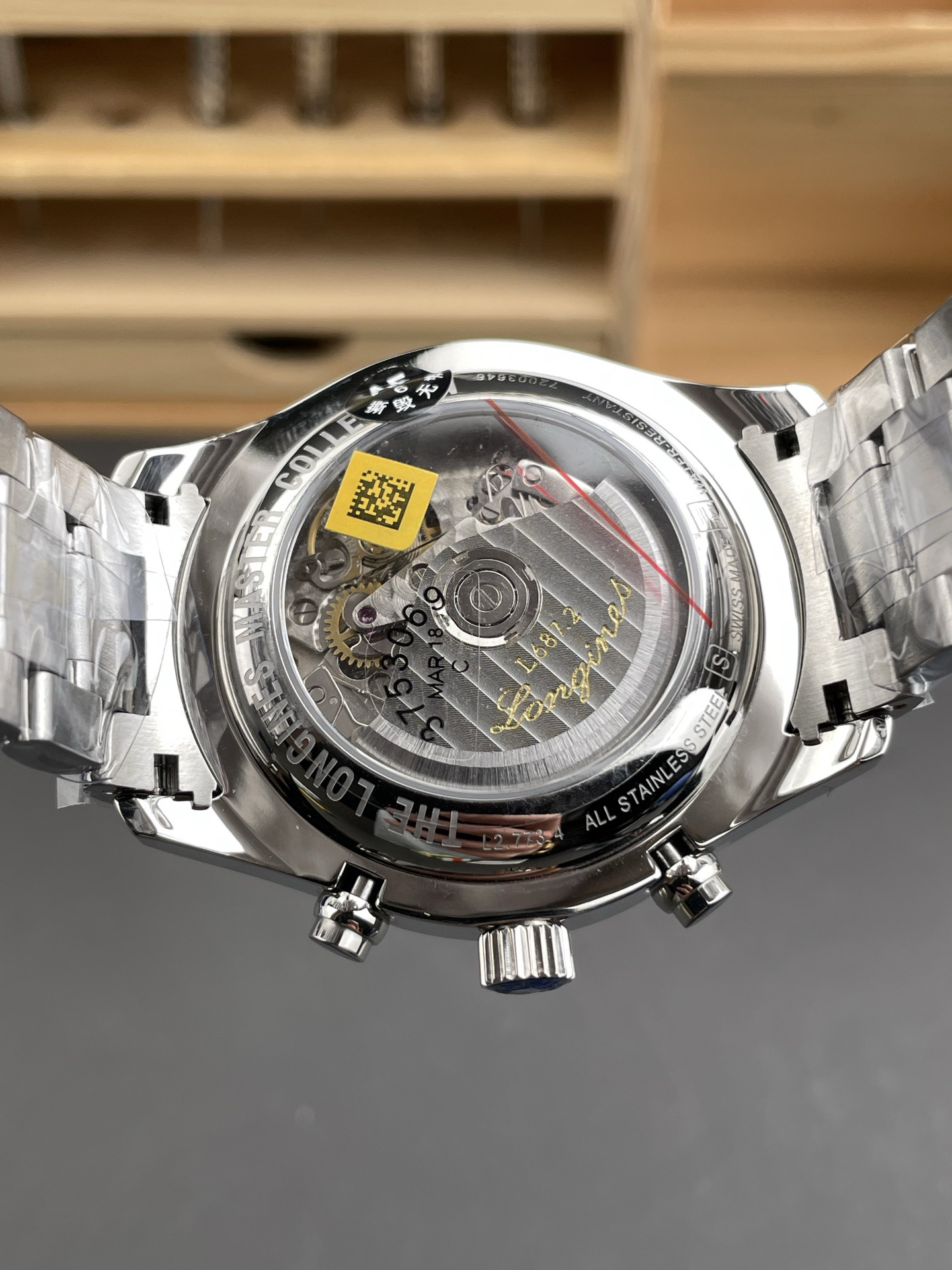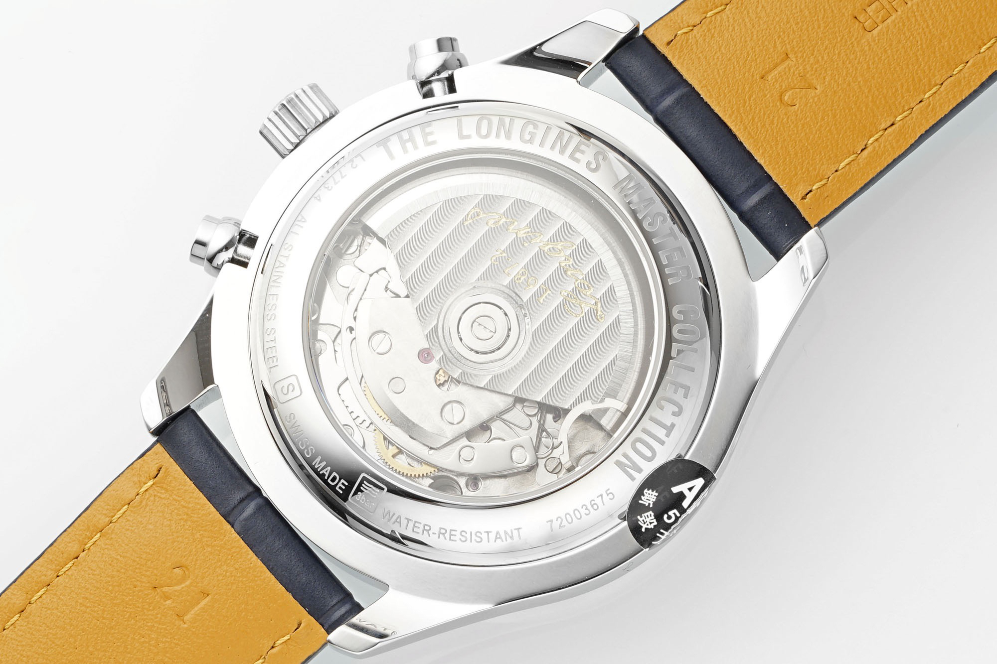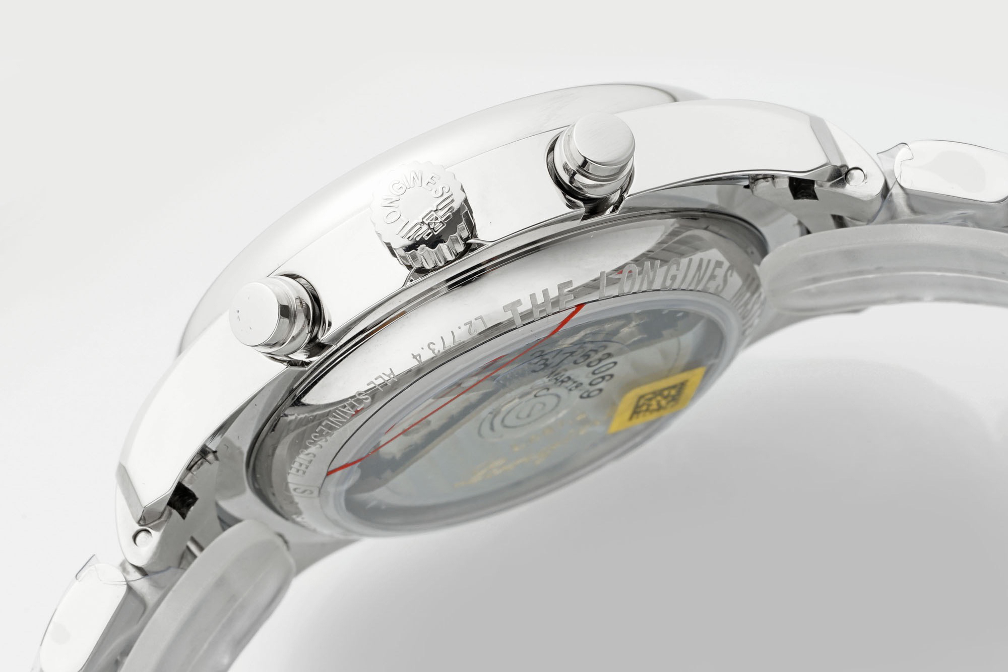 The 42mm stainless steel case has been polished, continuing the elegant temperament of Longines. The adjustment button for the calendar is hidden on the left side of the case, while the two major buttons for a regular sports watch and the crown in the middle are on the right side of the case.