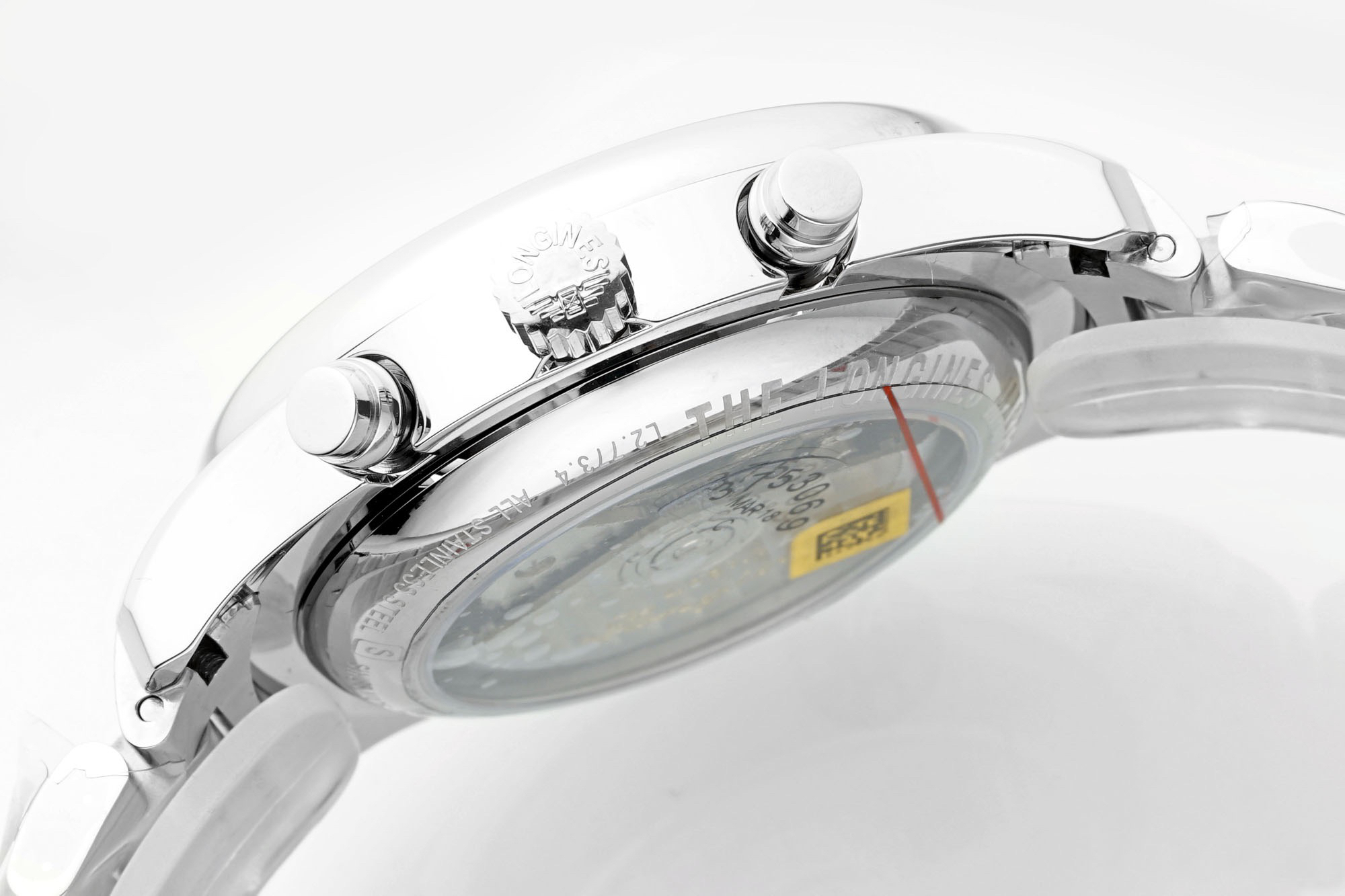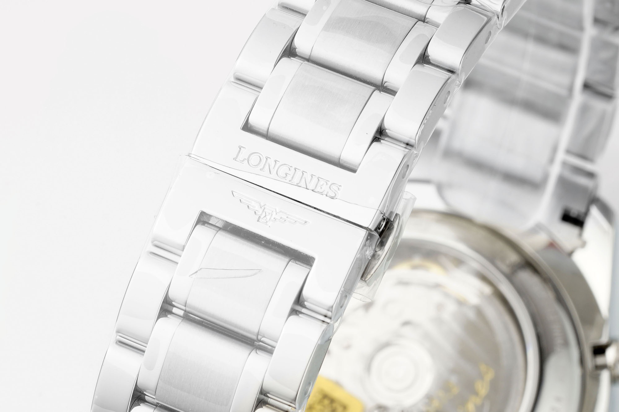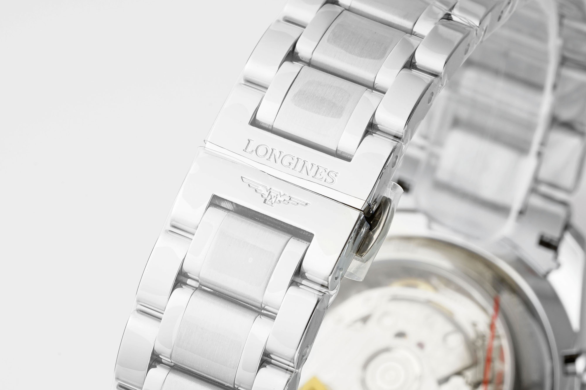 42MM精钢表壳经过抛光处理,延续了浪琴的优雅气质,表壳左侧隐藏了星期历的调节按钮,表壳右侧则是常规的运动表两大按钮和中间的表冠。