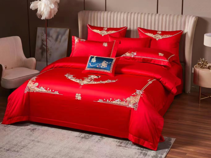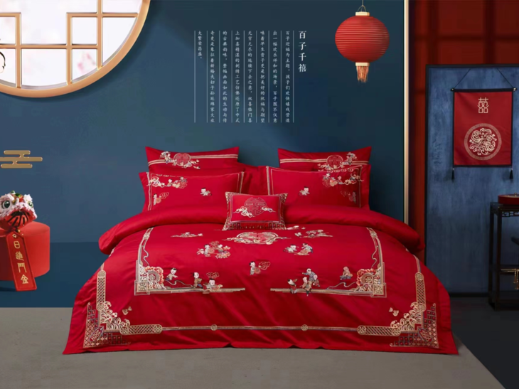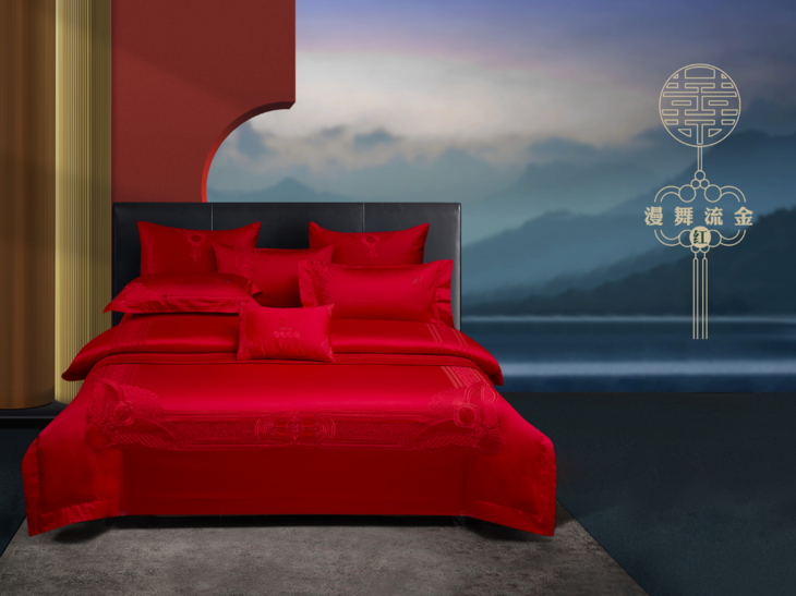 这一刻,漫舞流金。2023年漫舞流金婚庆六件套以流光溢彩的绝代风华为新人点亮幸福时刻,开启全新的人生旅程。产品用新疆长绒棉和金银线织出华丽的珍贵面料,用同色丝线和精致绣工绣出多种吉庆图案,最终形成流光飞舞、群星闪耀的浪漫氛围感。东方红为底色,双喜、祥云、麦穗作为吉祥纹样,烘托新婚佳人热烈蓬勃的爱意,寓意夫妻和合,恩情绵绵,生活蒸蒸日上,为新房增添无上华贵喜庆。