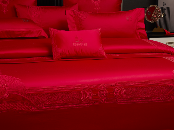 化妆师、摄影、司仪……除了大家口中常说的“四大金刚”,传统中式婚礼中,火红喜庆的床上用品必不可少。为了应对回暖的市场,杭州龙头家纺品牌提前布局,于2月初上新三款婚嫁系列,我们也将其带到了“每满生活”平台。