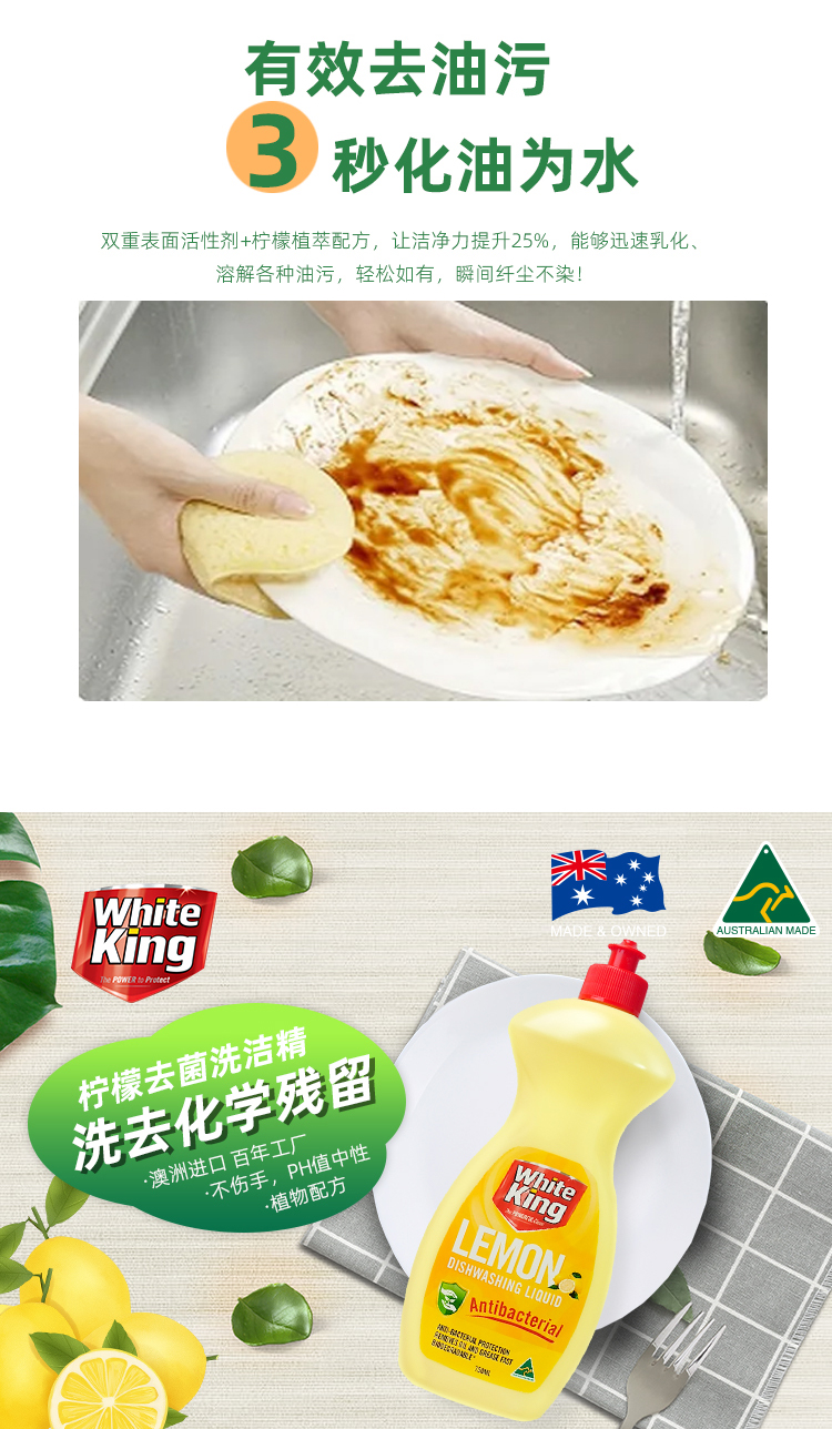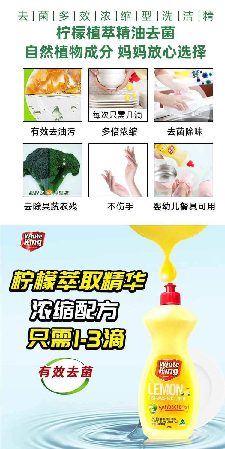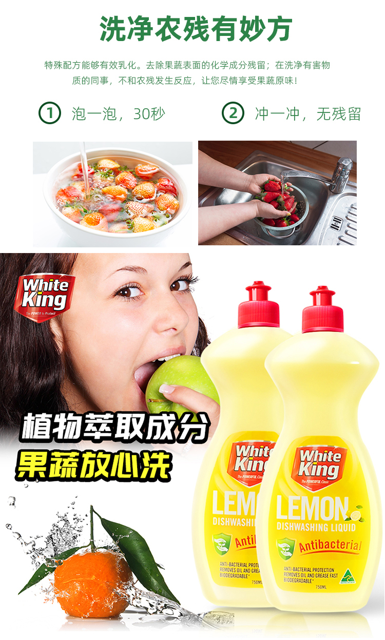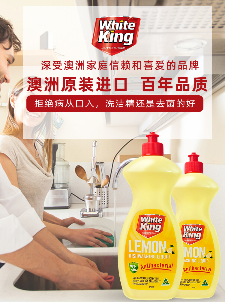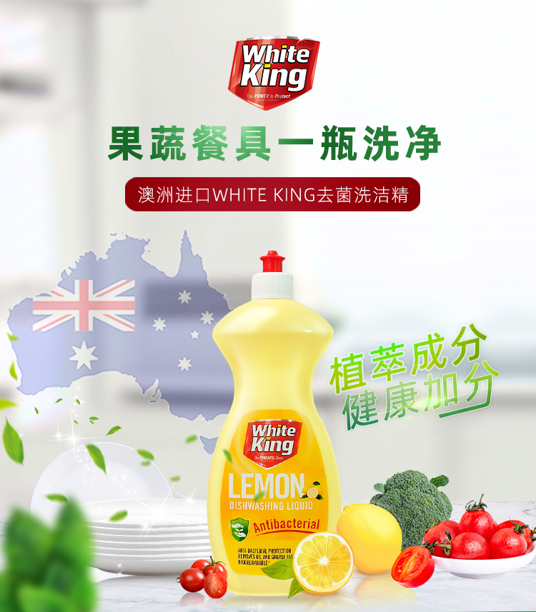 澳洲进口whiteking碗筷果蔬浓缩洗洁精清洗剂去菌除味去油污750ml