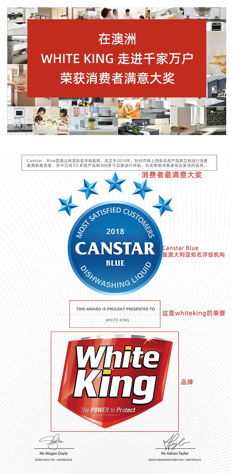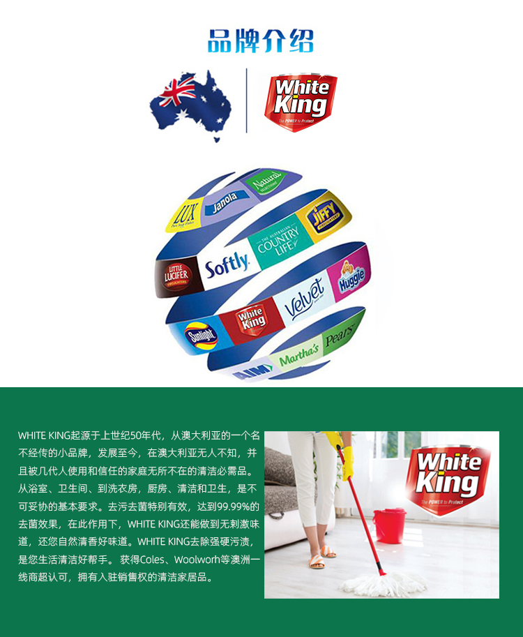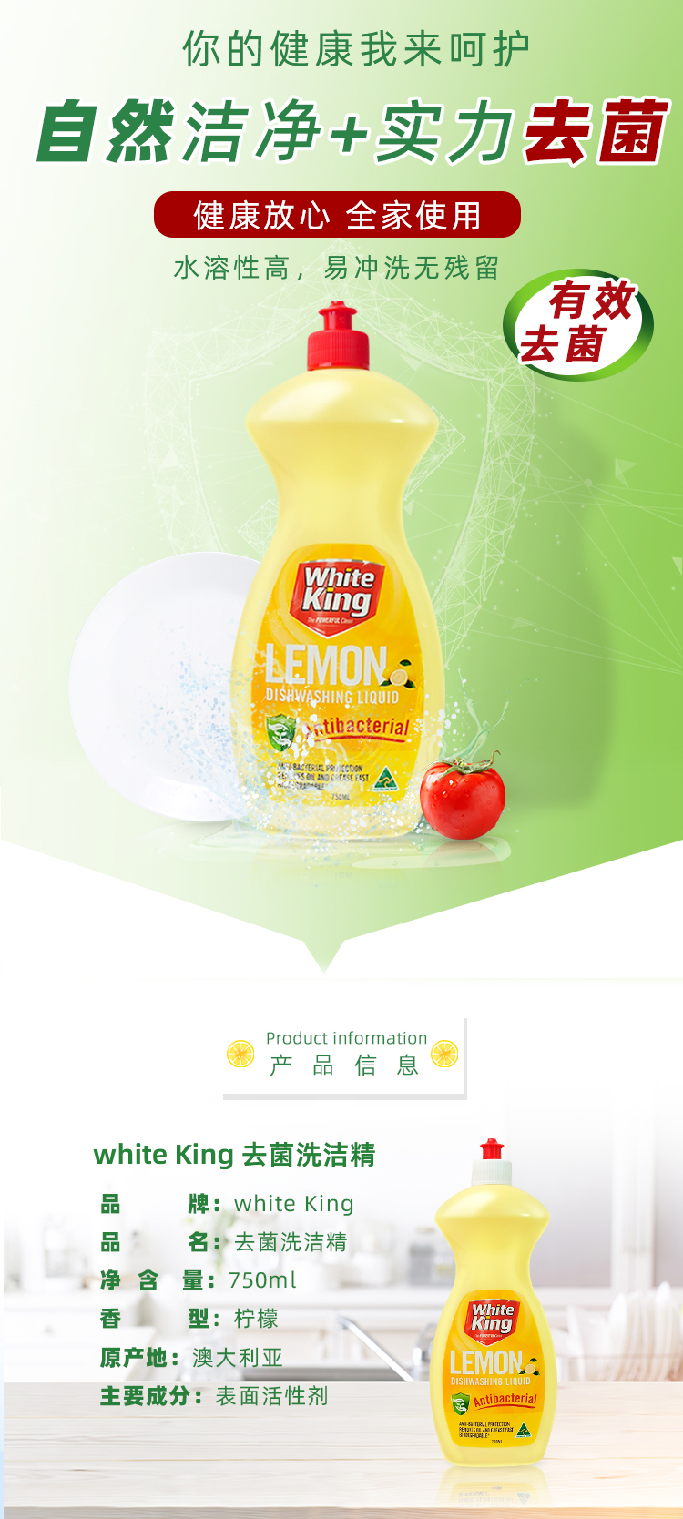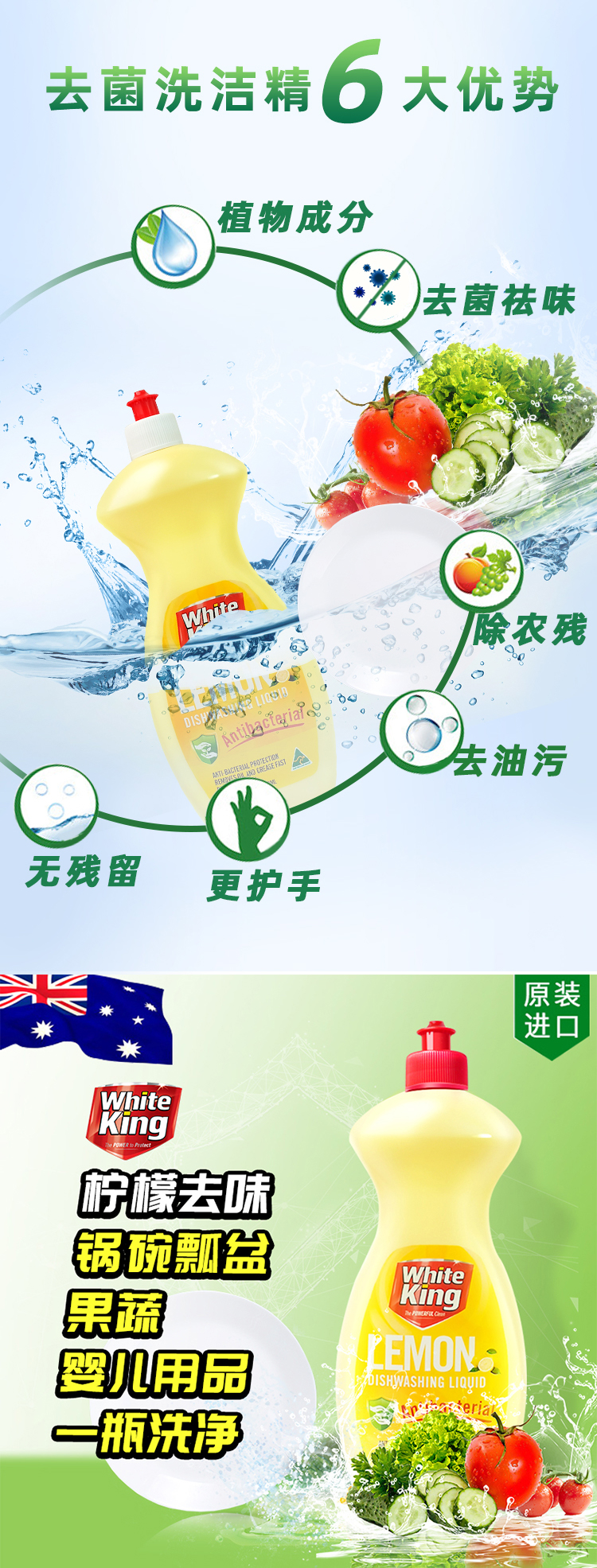 澳洲进口whiteking碗筷果蔬浓缩洗洁精清洗剂去菌除味去油污750ml