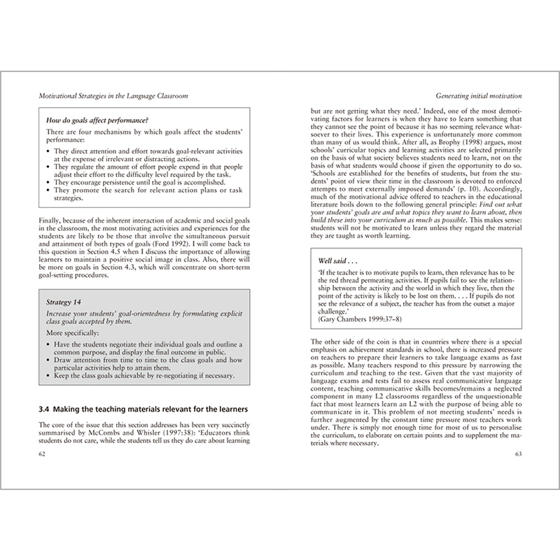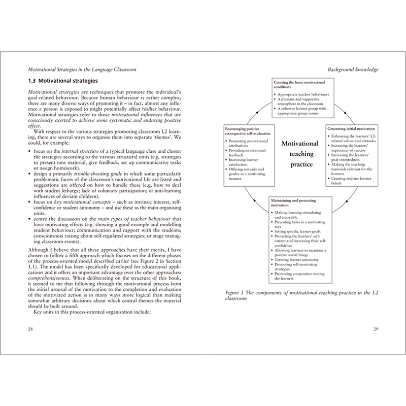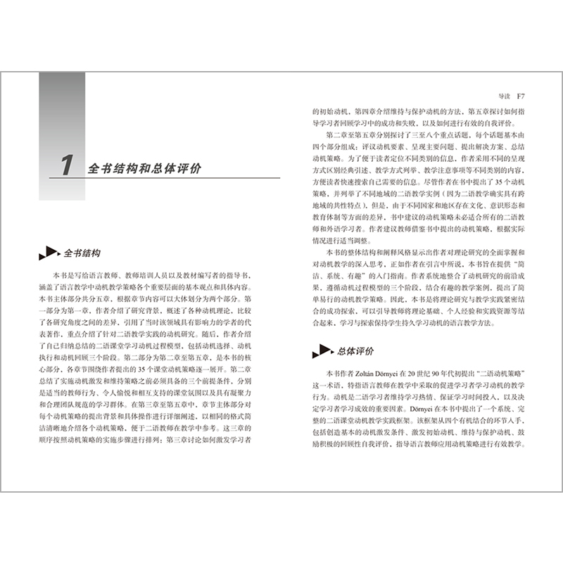 剑桥英语教师丛书”精选自剑桥大学出版社出版的英语教师教育领域的力作,并由国内知名的英语教育界专家、学者撰写中文导读,力求从英语语言教学的理论和实践两个层面,为英语教师的教学实践提供理论指导,并为英语教师的在职教育和终身职业发展提供丰富的资源。《语言课堂上的动机策略》是“剑桥英语教师丛书”中的一本。《语言课堂上的动机策略》是写给语言教师、教师培训人员以及教材编写者的指导书,涵盖了语言教学中动机教学策略的各个重要层面的基本观点和具体内容。全书共分五章。第一章介绍了研究背景,概述了各种动机理论,比较了各研究角度之间的差异,重点介绍了针对二语教学实践的动机研究。第二章总结了实施动机激发和维持的策略之前必须具备的三个前提条件。第三章至第五章是本书的核心部分,按照动机策略的实施步骤进行排列:第三章讨论如何激发学习者的初始动机,第四章介绍维持与保护动机的方法,第五章探讨如何指导学生回顾学习中的成功和失败,以及如何进行有效的自我评价。《语言课堂上的动机策略》总结了外语课堂中激发和维持学习者学习动机的35个教学策略,可以帮助教师从不断提升学习者动机的角度设计和实施教学活动。《语言课堂上的动机策略》集理论概述、案例呈现和策略阐释于一体,为一线教师提供了可操作的教学建议,可以作为外语教师开展教学活动及提升自身能力、实现自我发展的重要参考书。
