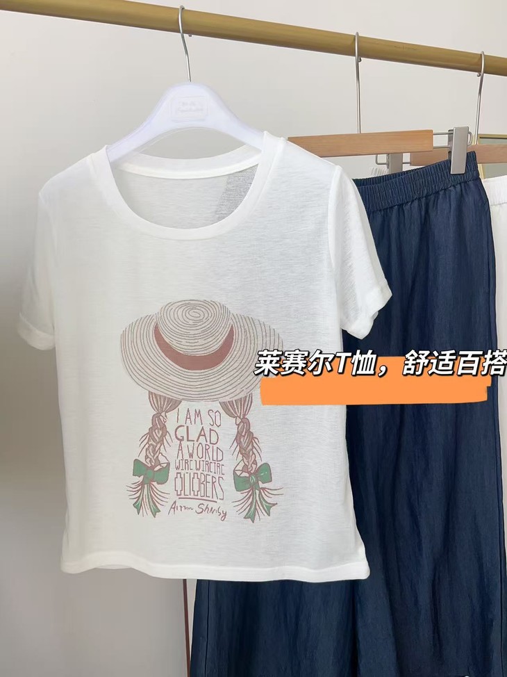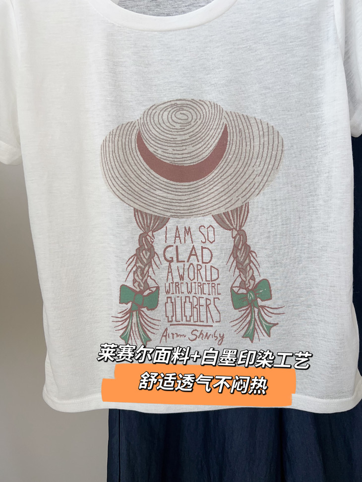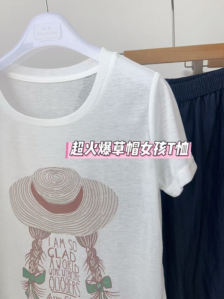 【MOMOTIABIN莱赛尔圆领撞色草帽女孩T恤YCHZ77】✅简约而高级,正肩好显瘦,实用性超高✅透气吸湿效果很好,夏天穿依然清爽不粘腻