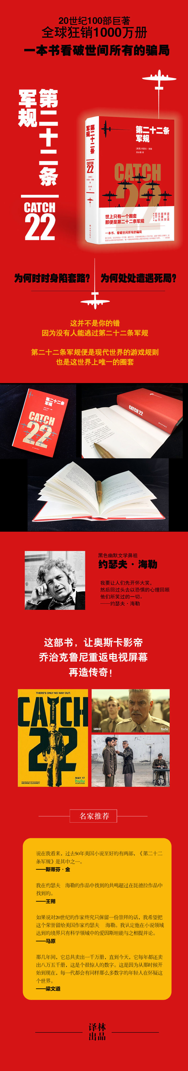 1923年出生于纽约一个贫困的俄罗斯犹太人家庭,从小颇具语言天赋,爱好写作。从亚伯拉罕?林肯高中毕业后的一年中,做过铁匠学徒、信童与文员。这位声称“通过深入彻底的自我审视,我发现自己不适合军队”的作家于1942年参军,加入美国空军前往意大利前线,驾驶B-25轰炸机完成了60次飞行作战任务。战后,海勒先后在南加州大学和纽约大学研习语言,后又获得哥伦比亚大学的硕士学位。1961年,《第二十二条军规》出版,起初市场反应平平,后随着美国国内反战运动的兴起获得民众的强烈共鸣,迅速成为畅销小说。《第二十二条军规》从未获得过任何奖项,却成为世界上畅销的小说之一。1977年,海勒当选美国文学艺术院院士。晚年饱受病痛折磨,于1999年因心脏病发作在家中去世。