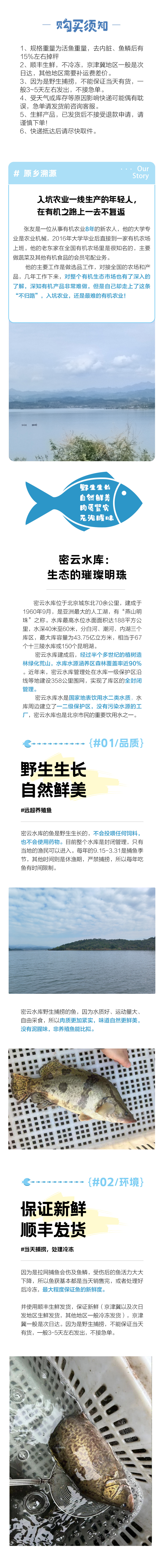 【新农人】:张友 【产地】:北京市密云区密云水库 【产品标准】:野生捕捞,非人工饲养 【产品特色】:肉质更加紧实,味道更加鲜美 【发货方式】:整条鱼去鳞、去鳃、去内脏、抽真空顺丰生鲜发货 【发货时间】:一般情况下单后3~5天左右发出,不接急单