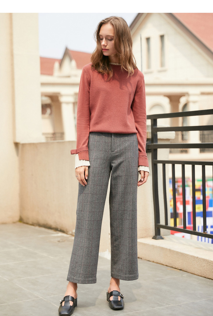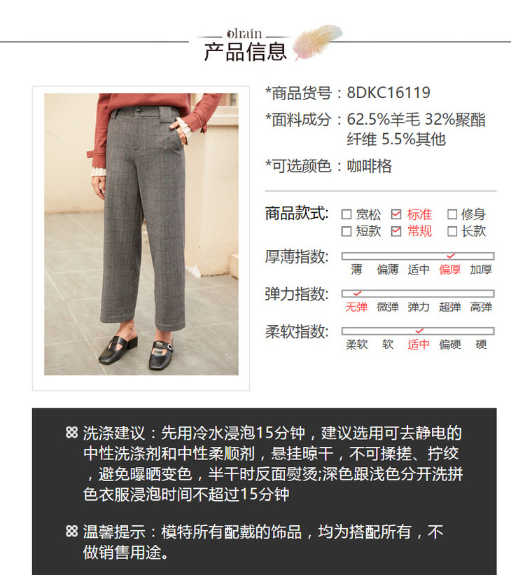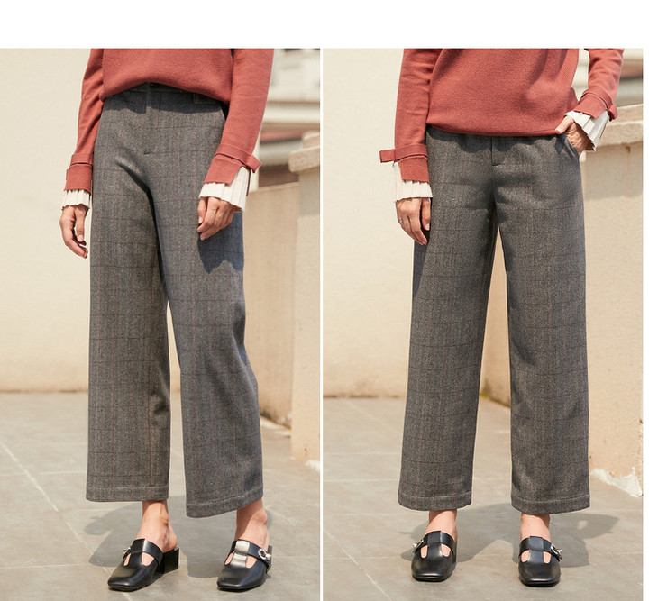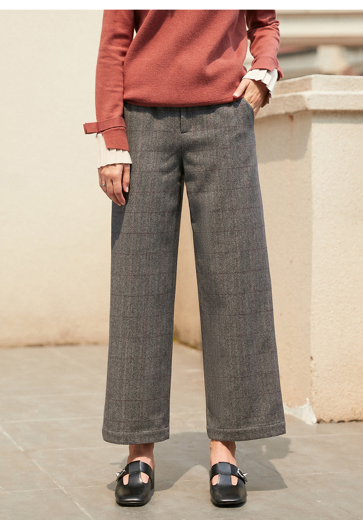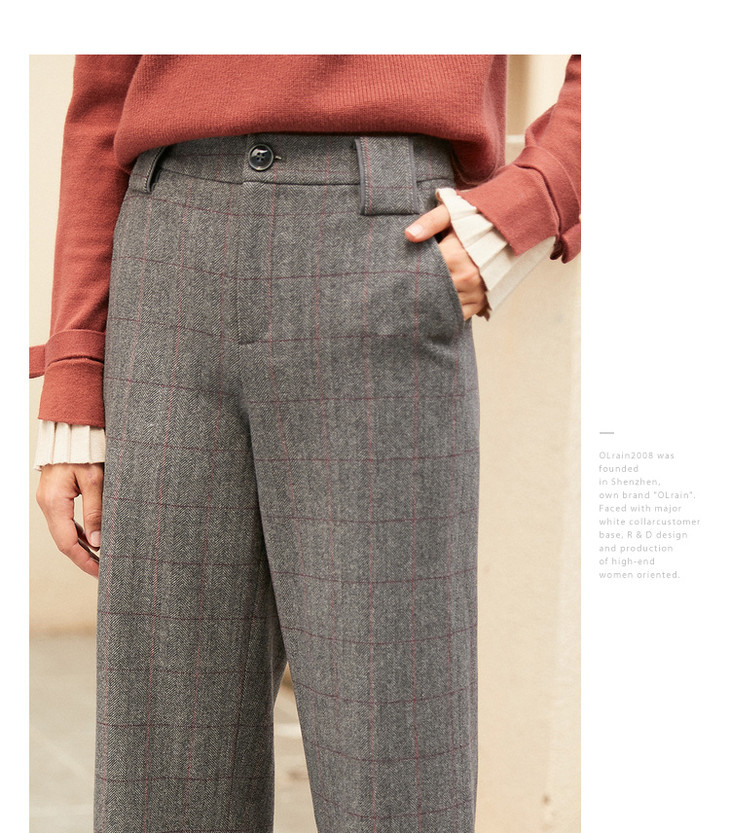 欧芮儿毛呢格子休闲裤女裤冬加绒加厚保暖直筒裤呢子阔腿裤