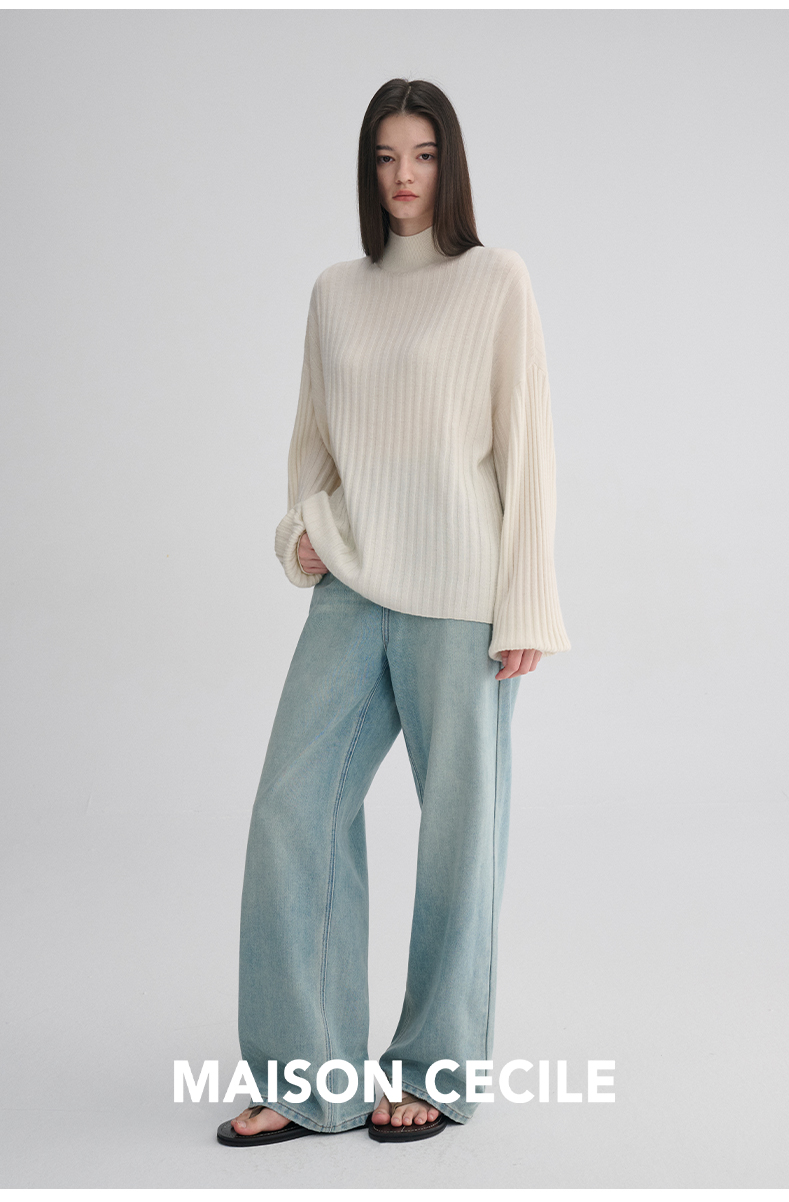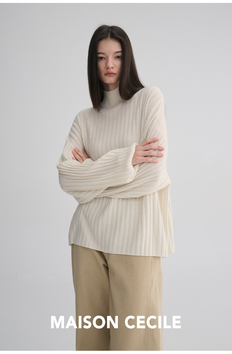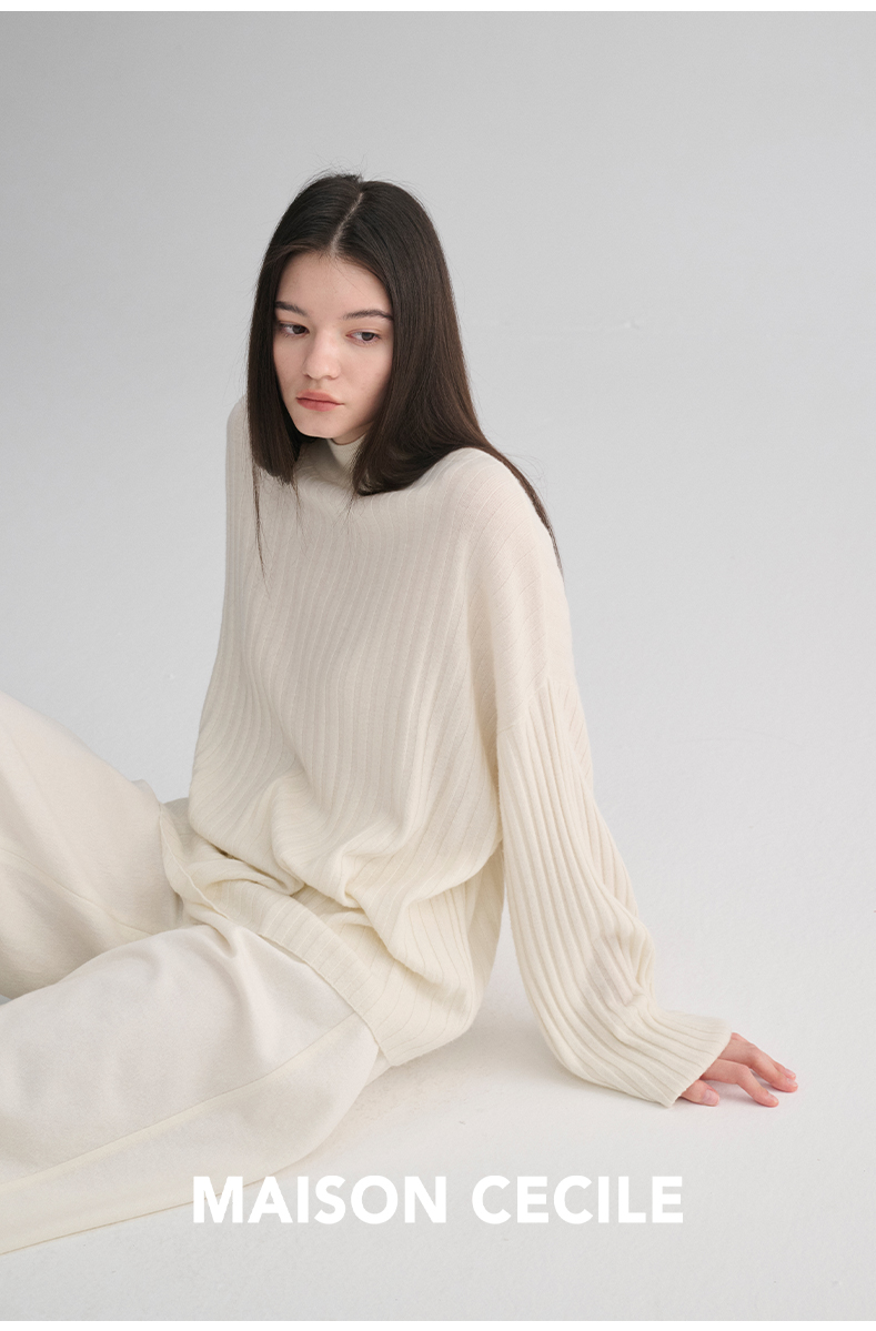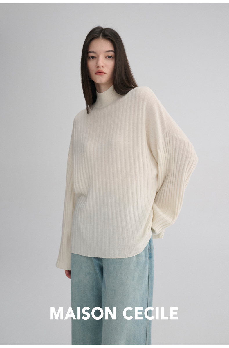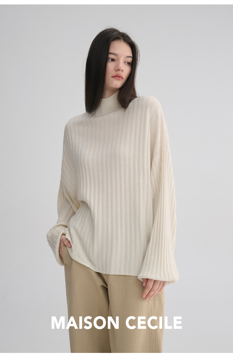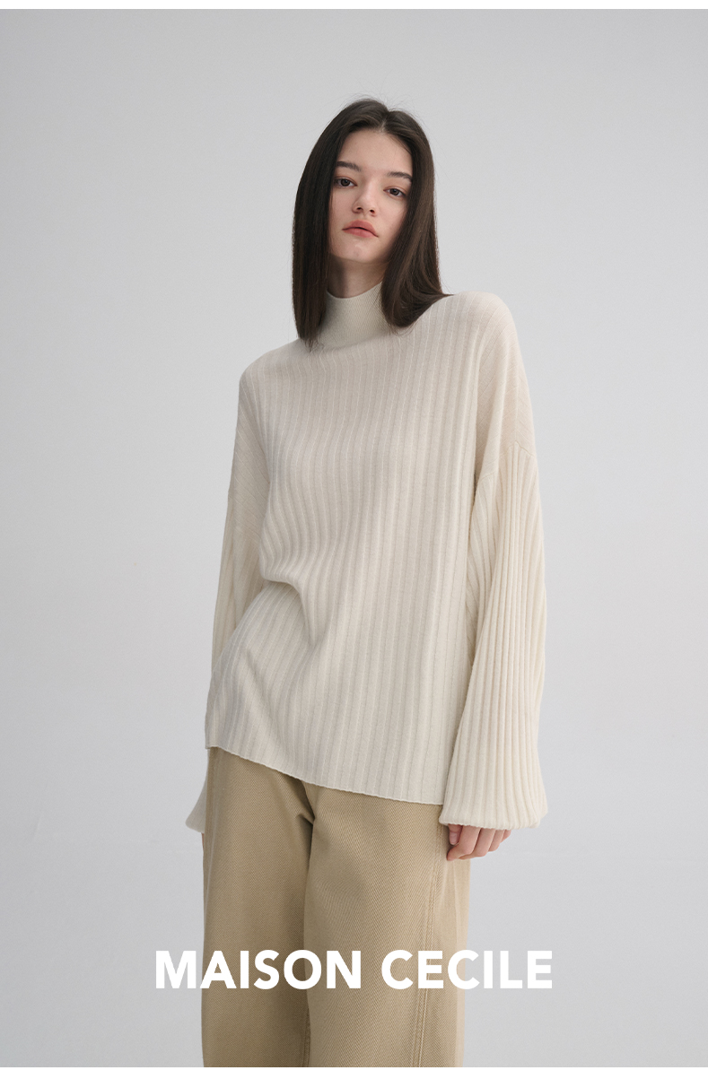 MAISON CECILE 羊绒羊毛针织半高领慵懒感立体条纹灯笼袖针织毛衣