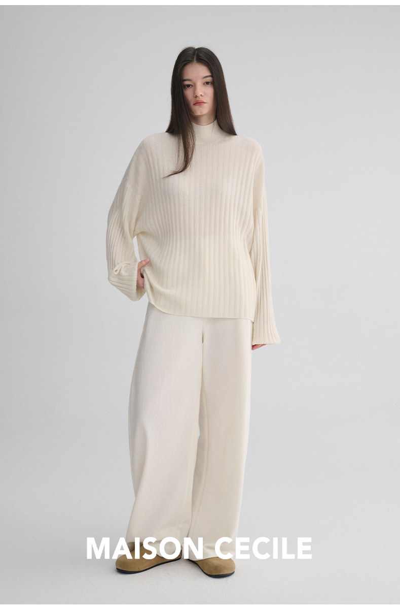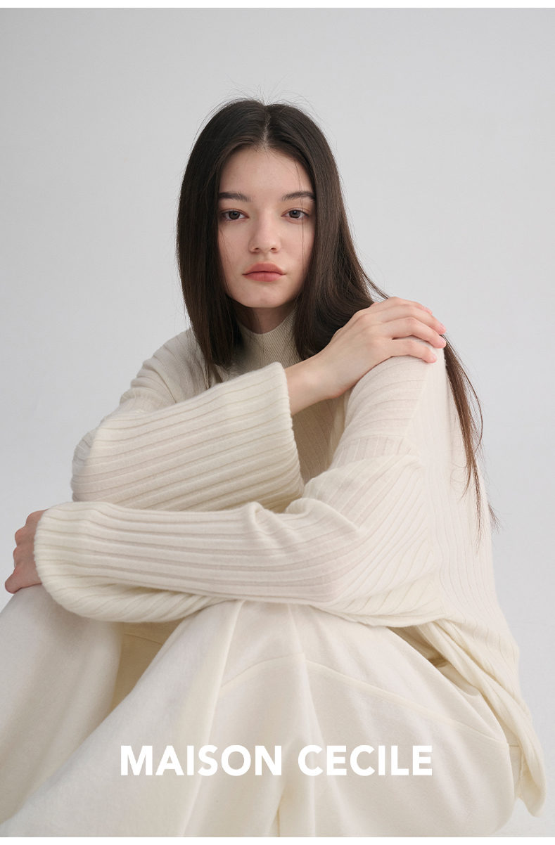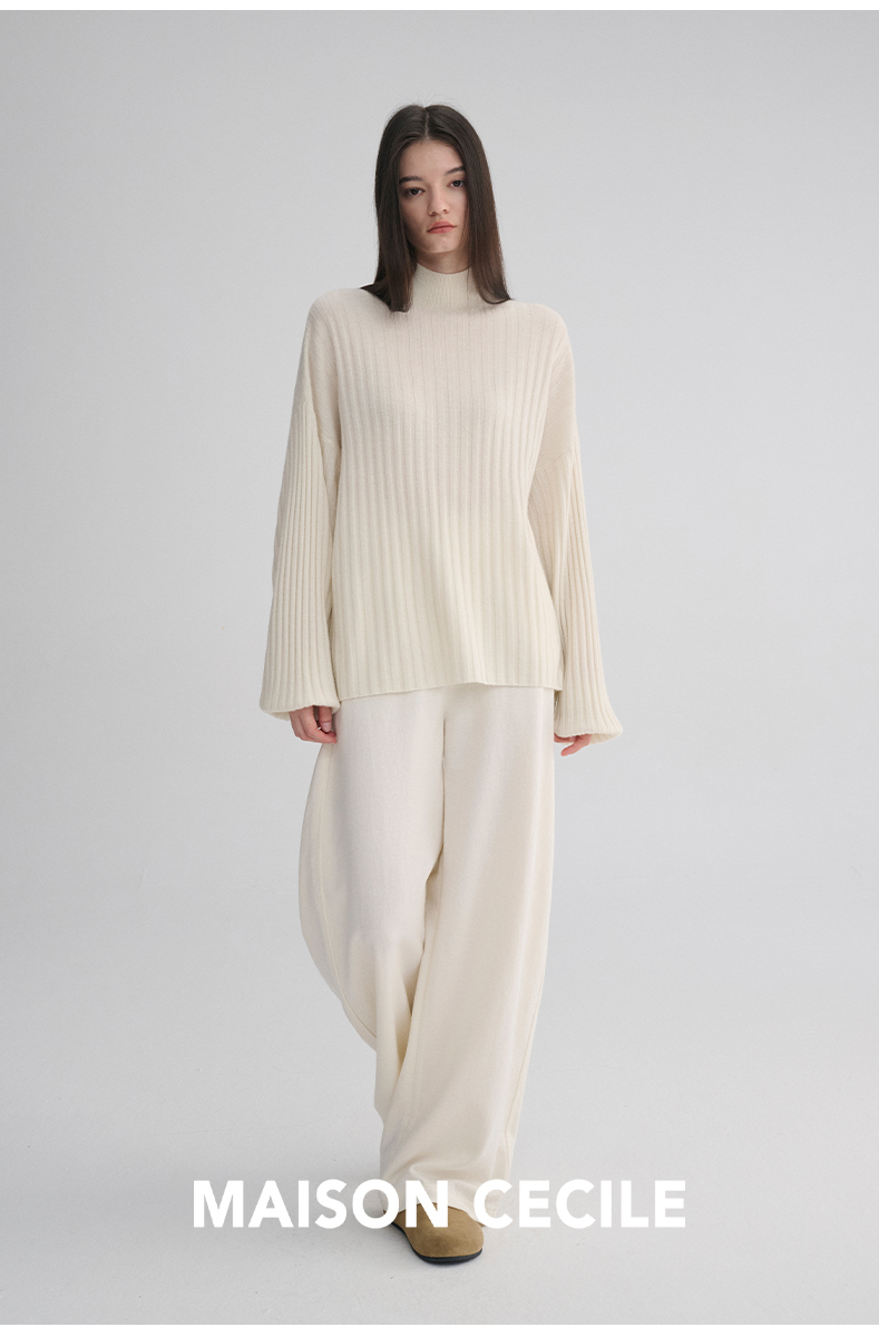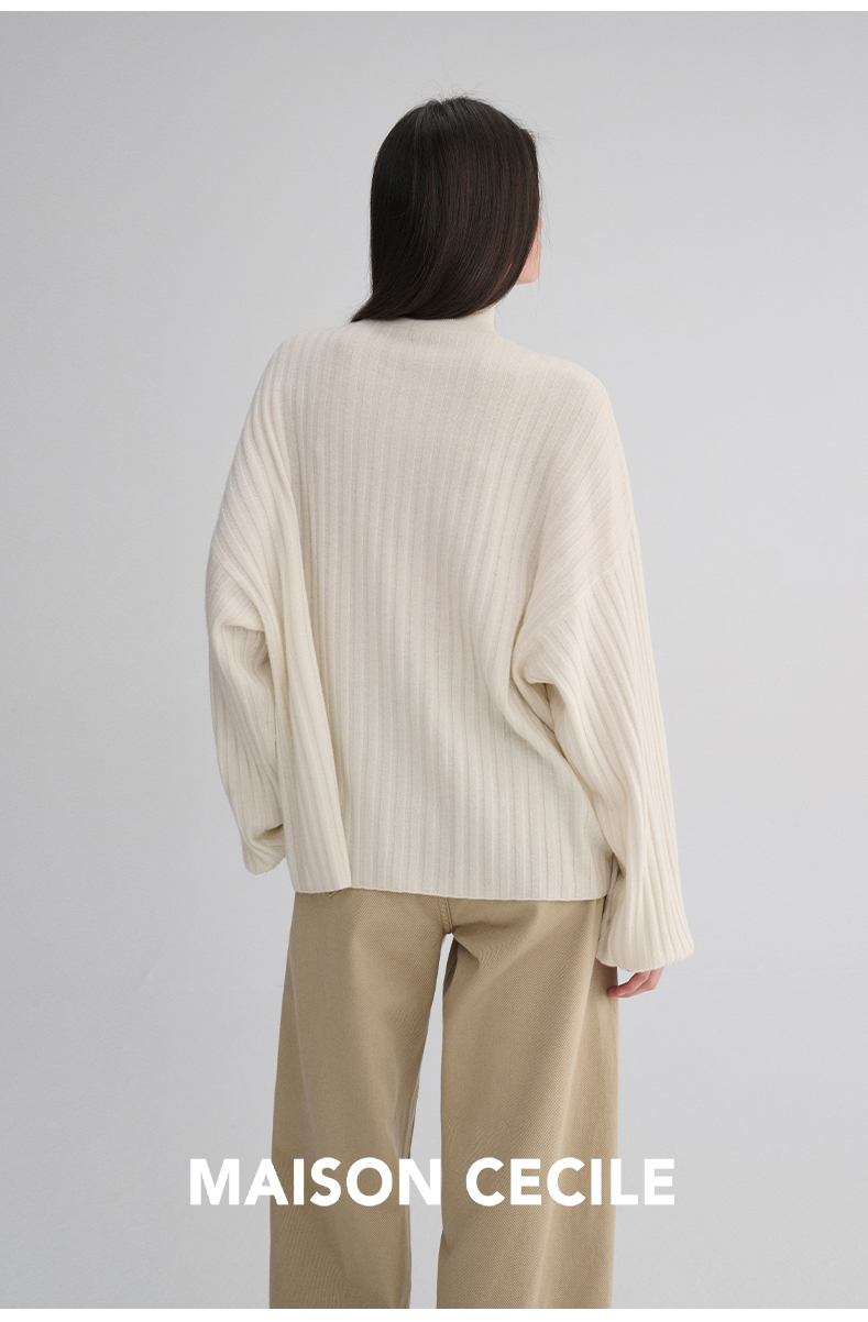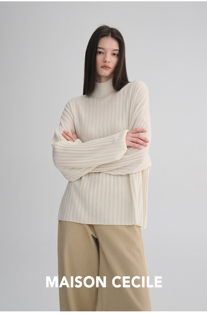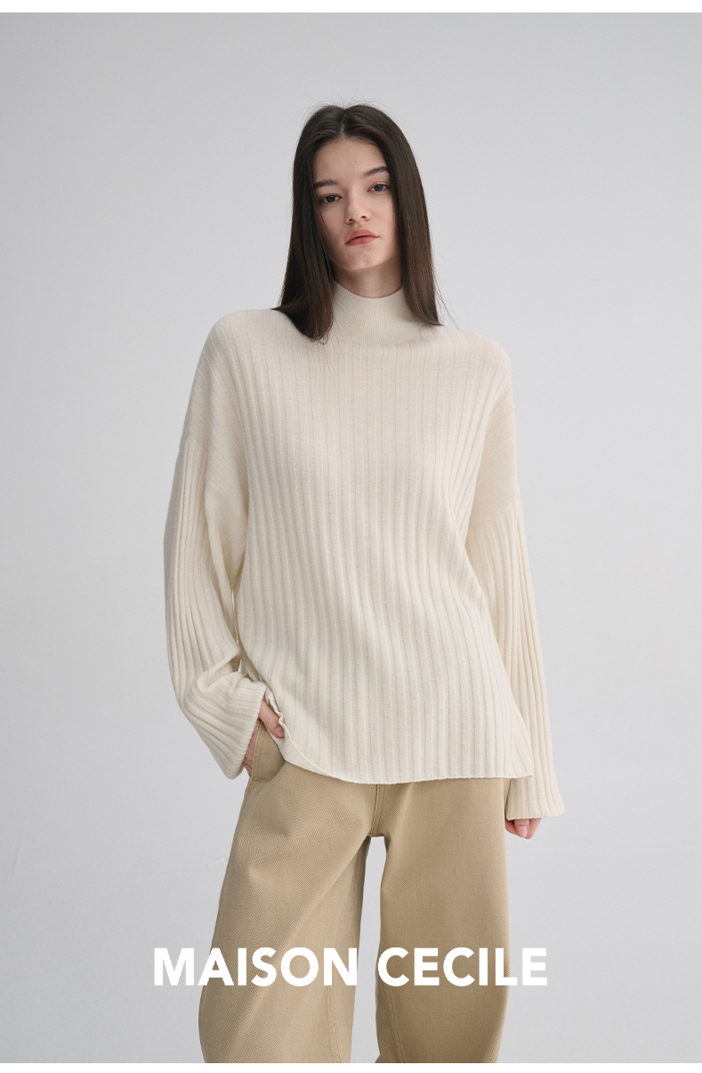 MAISON CECILE 羊绒羊毛针织半高领慵懒感立体条纹灯笼袖针织毛衣