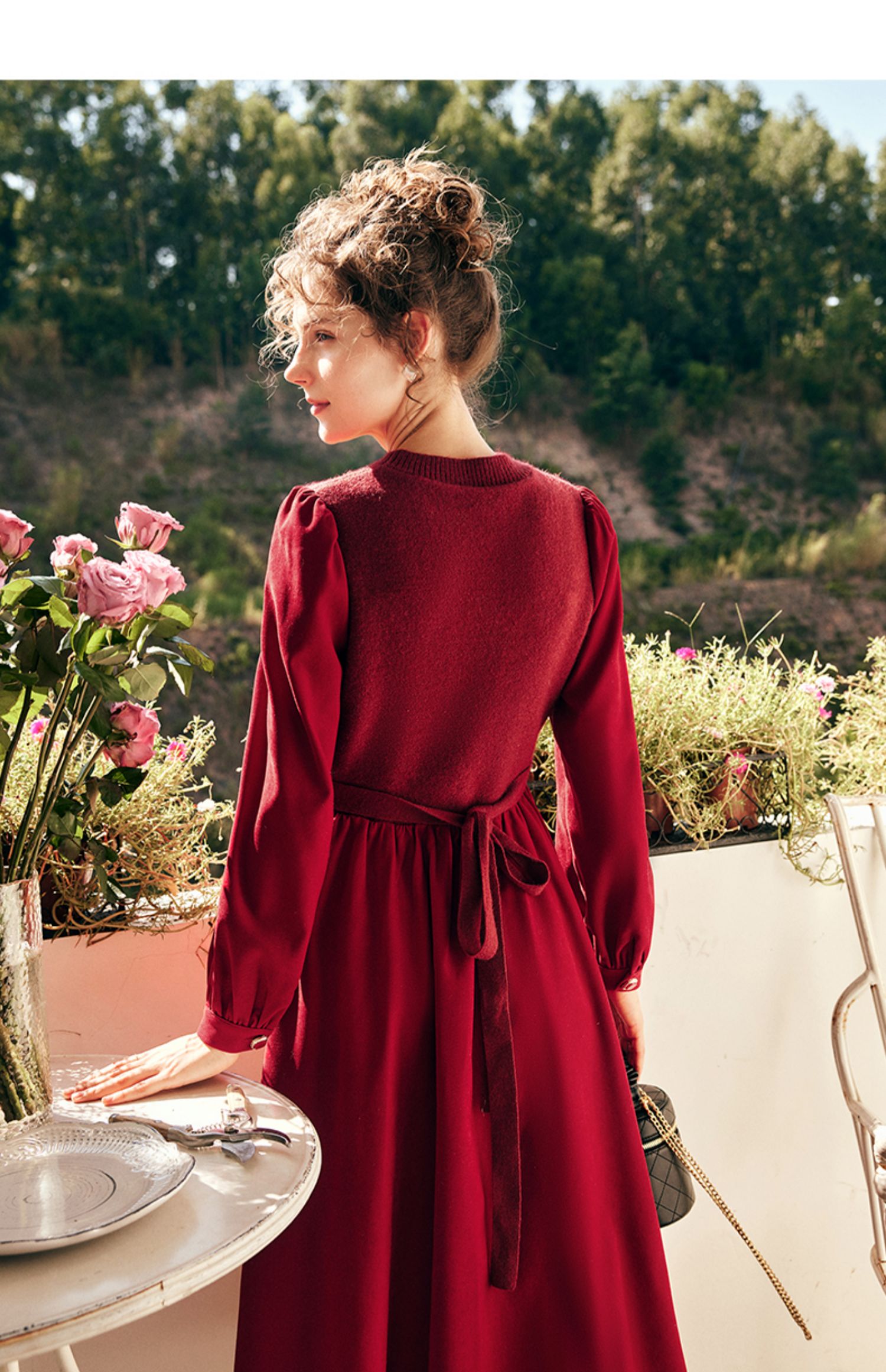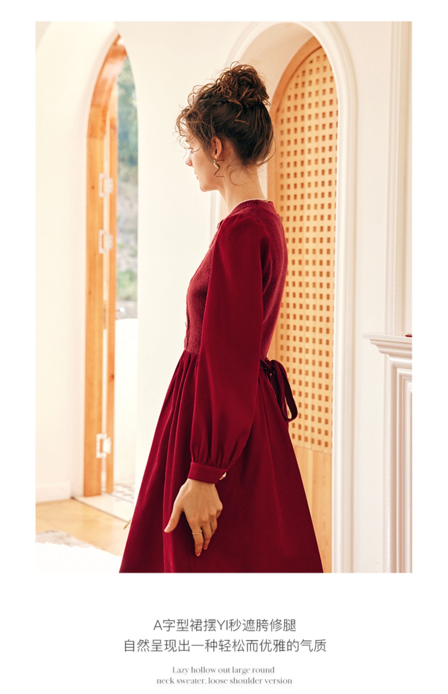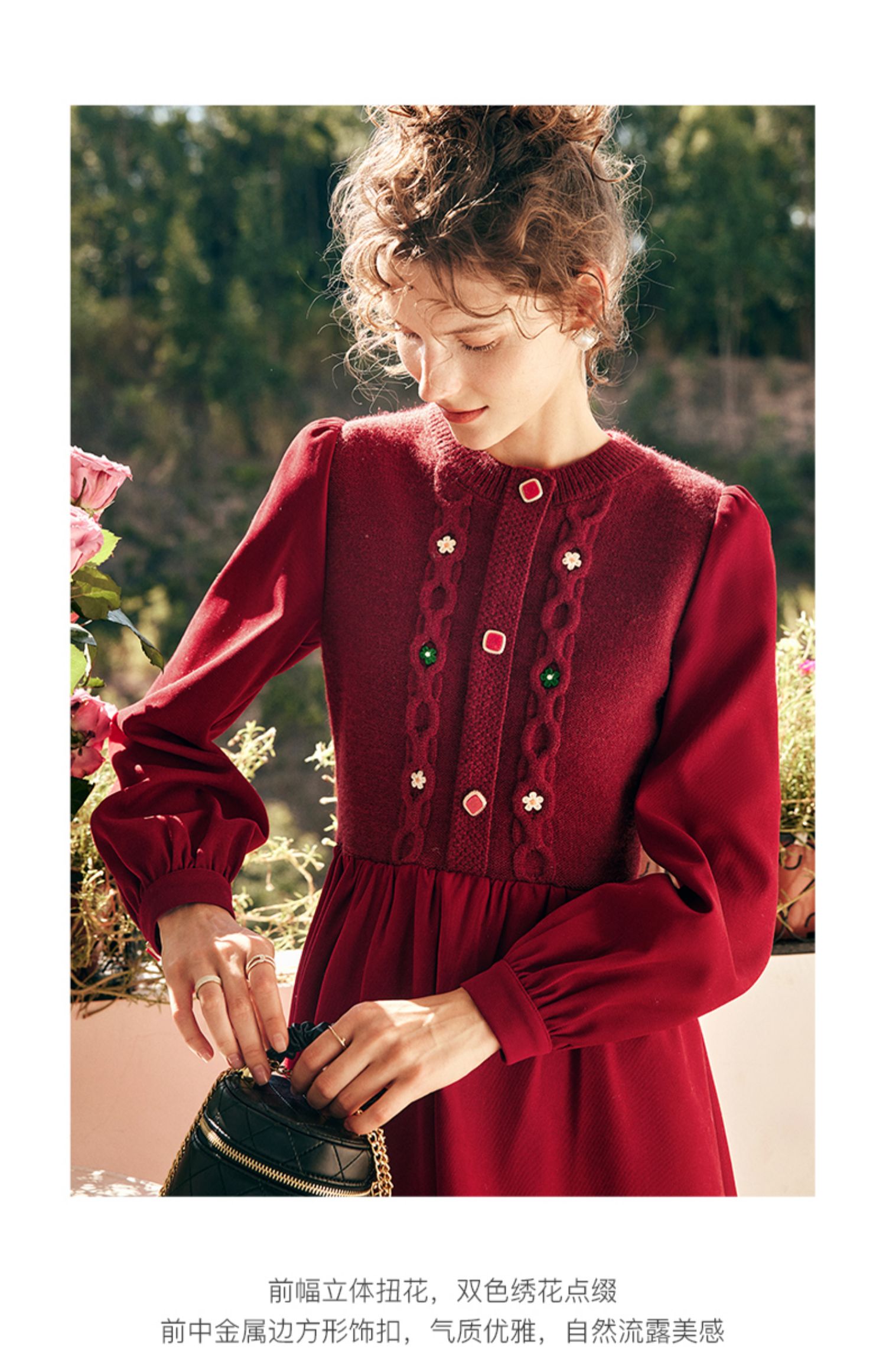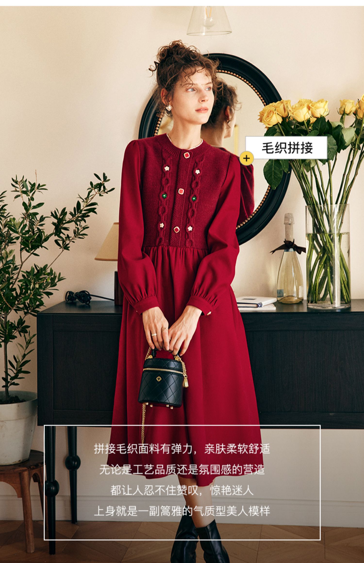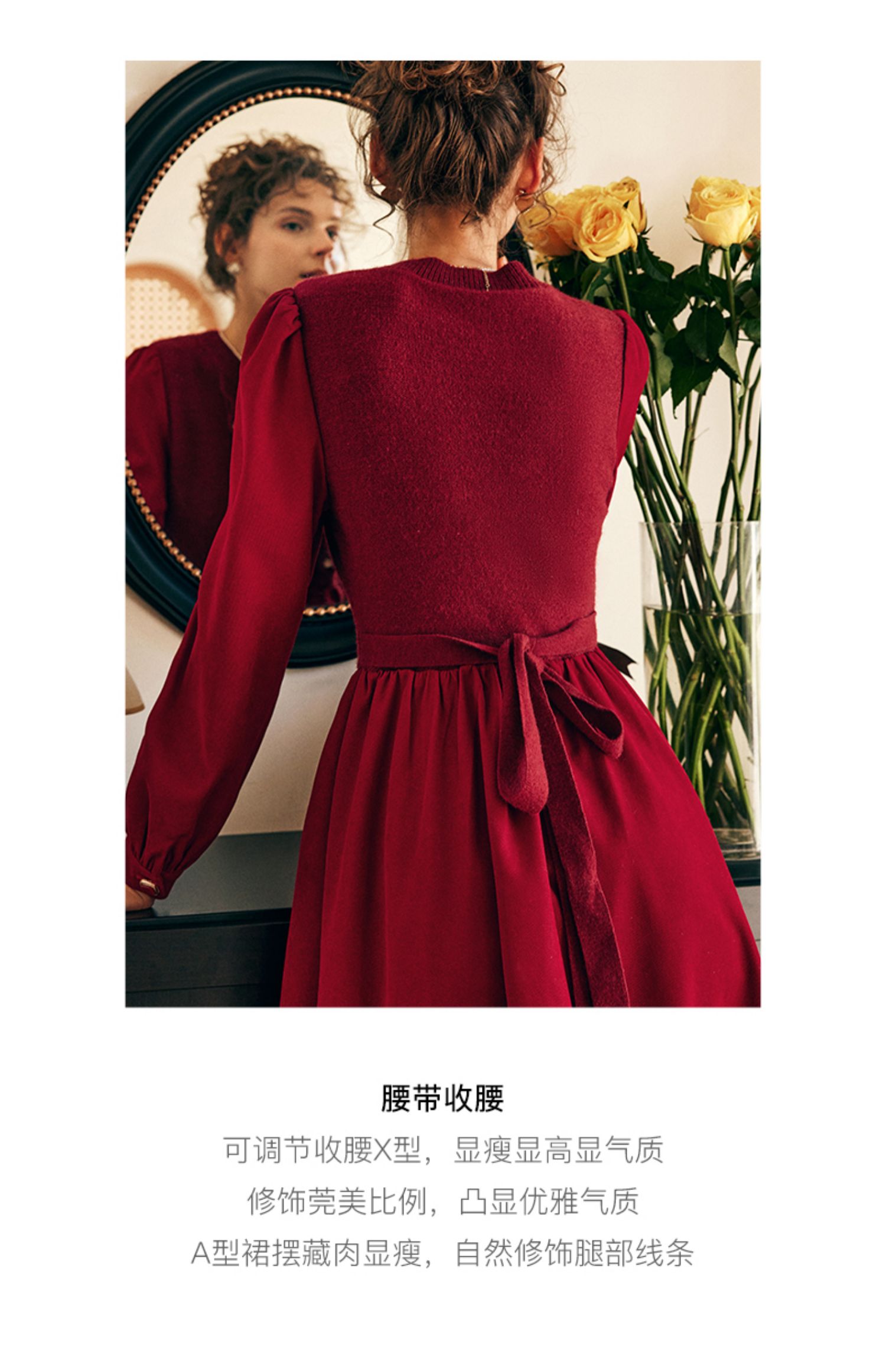 OLrain欧芮儿法式酒红色连衣裙女秋季2023年新款收腰针织拼接裙子