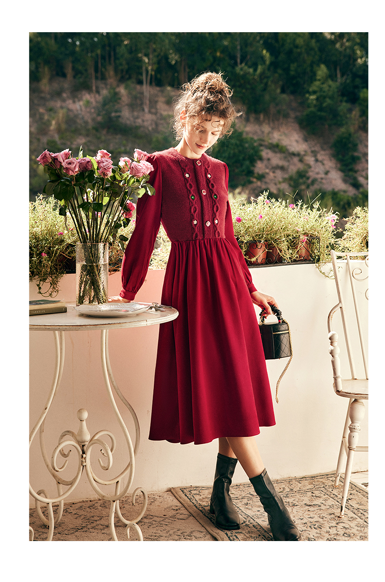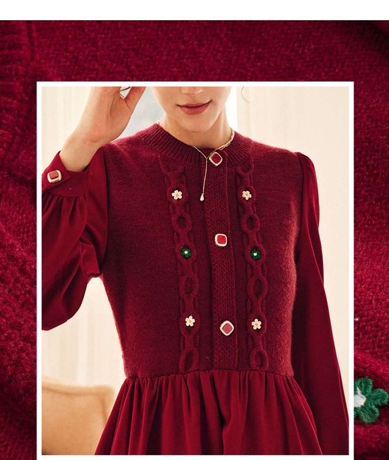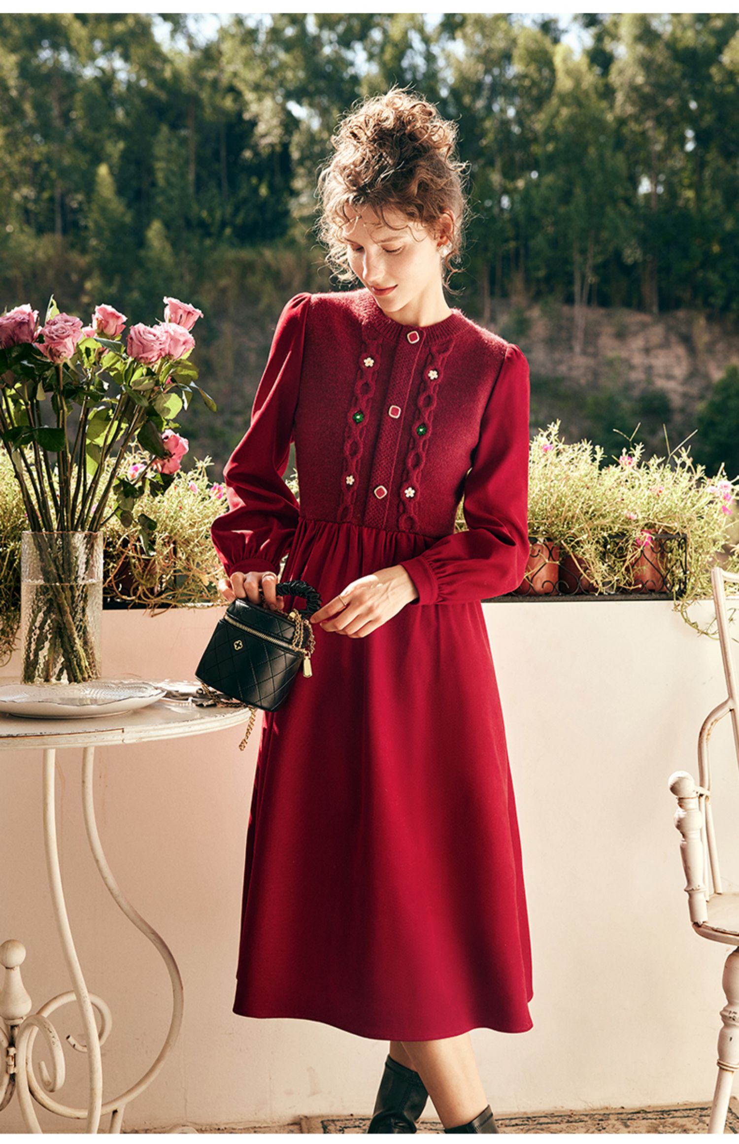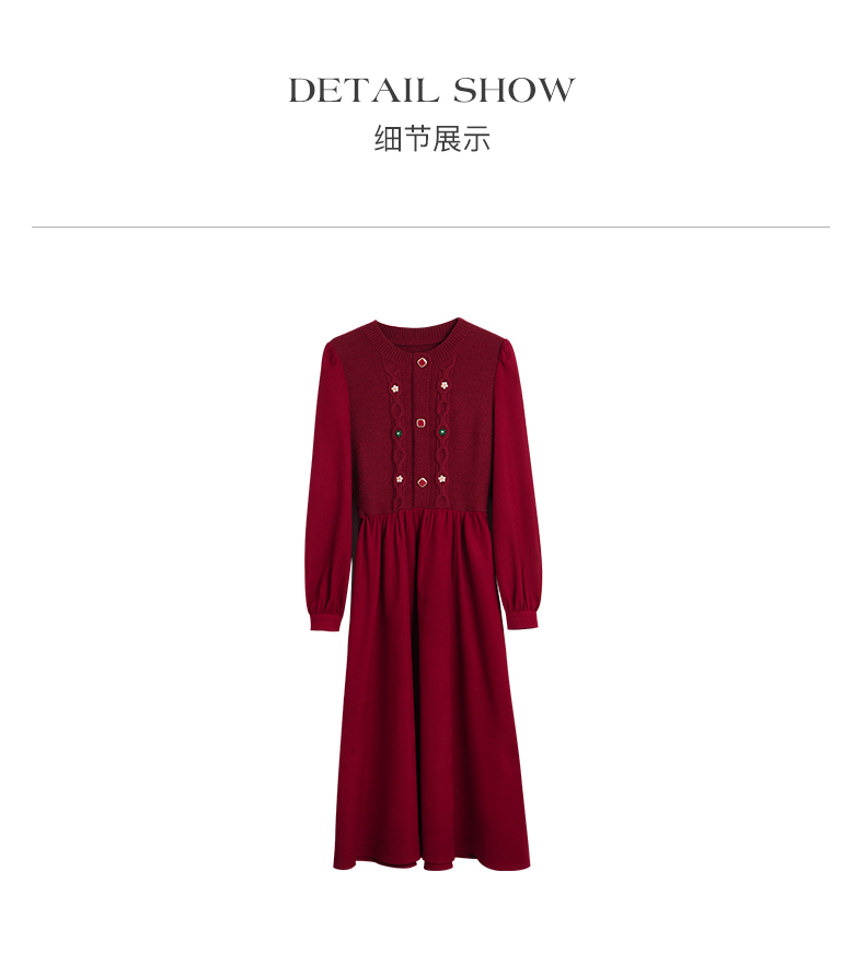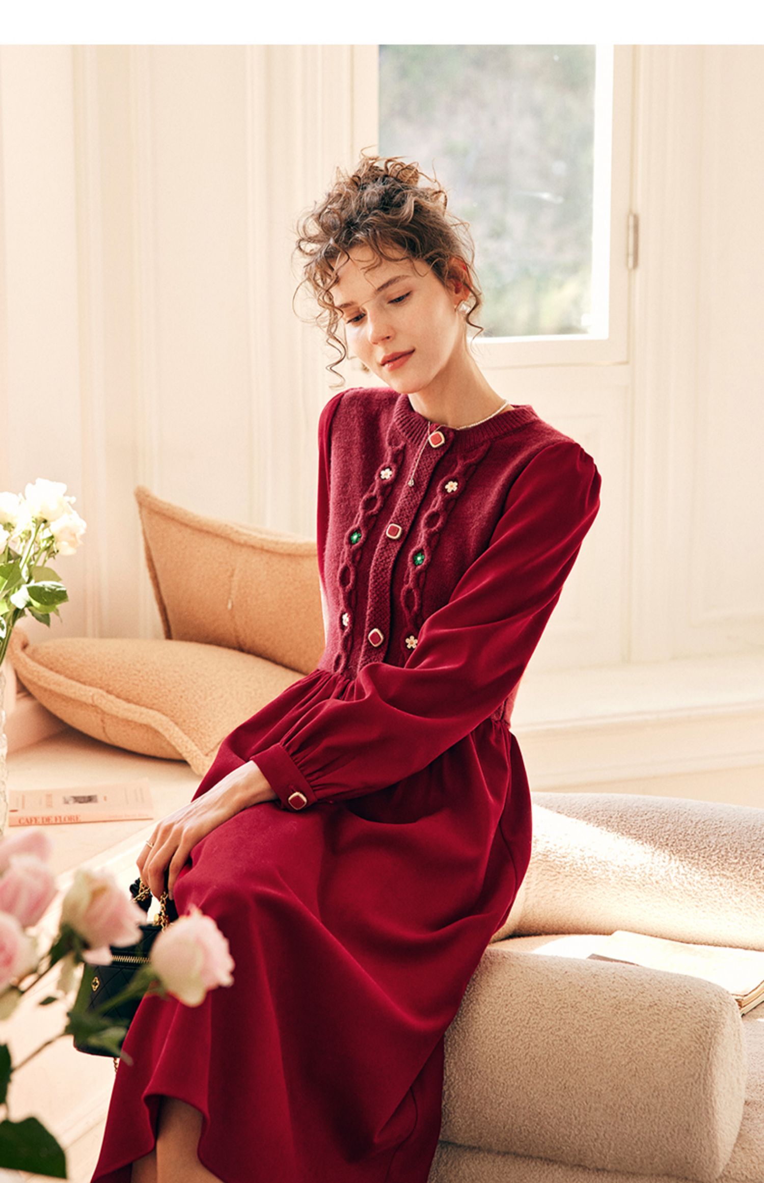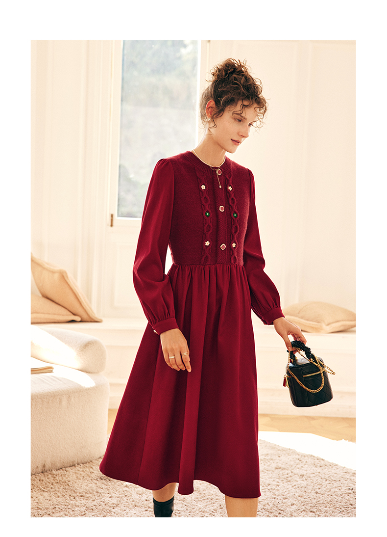OLrain欧芮儿法式酒红色连衣裙女秋季2023年新款收腰针织拼接裙子