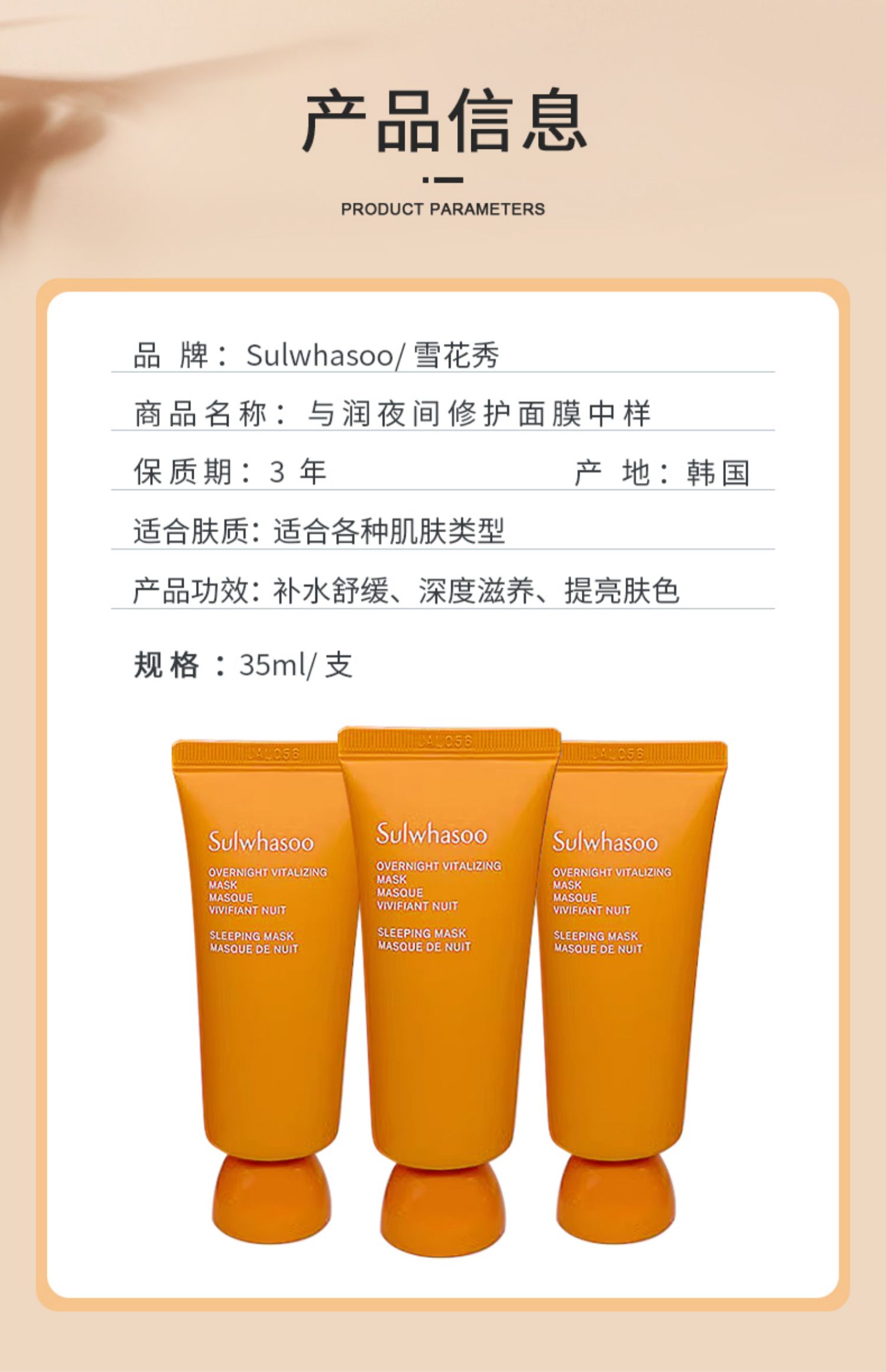 【跨境】雪花秀雨润睡眠面膜中样35ml*1/3支 新款(效期:2028.02)