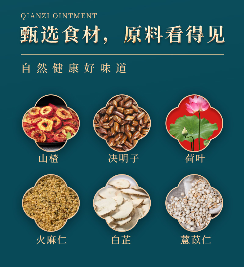 成分:茯苓、山药、火麻仁、决明子、白芷、山楂、薏苡仁、枸杞子、橘皮、乌梅、鱼腥草、荷叶