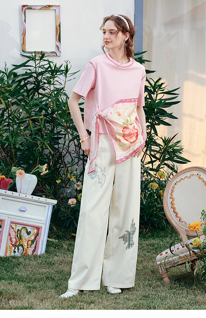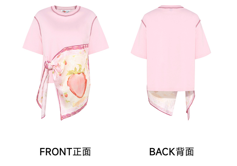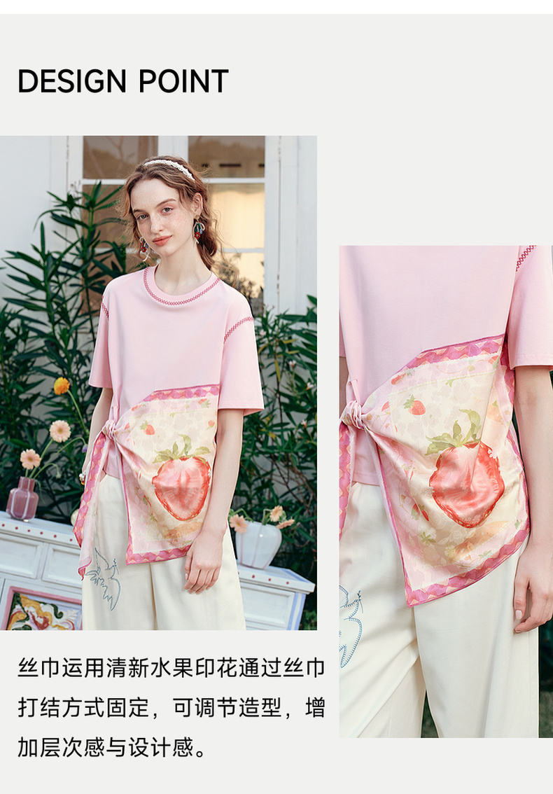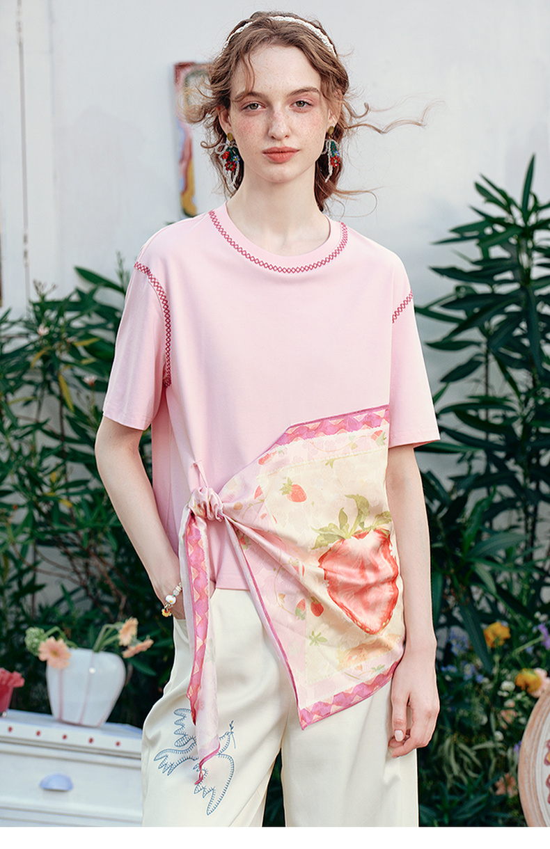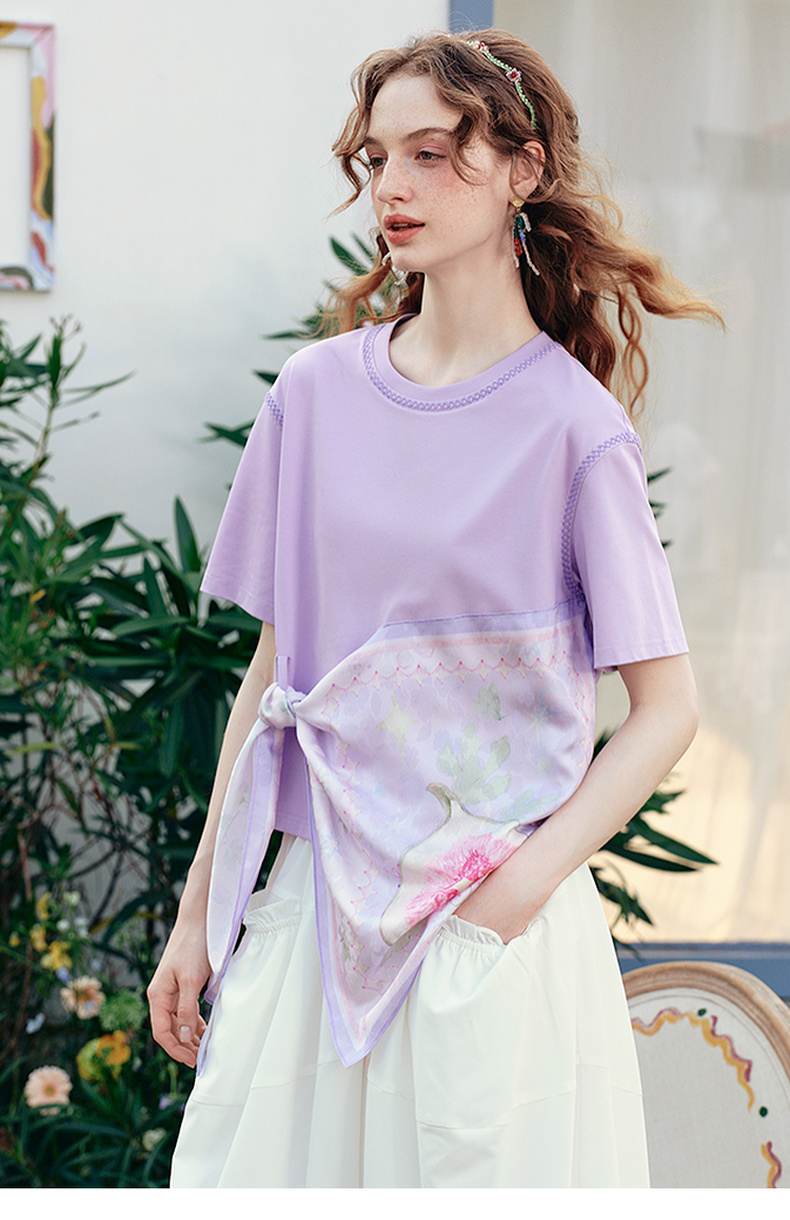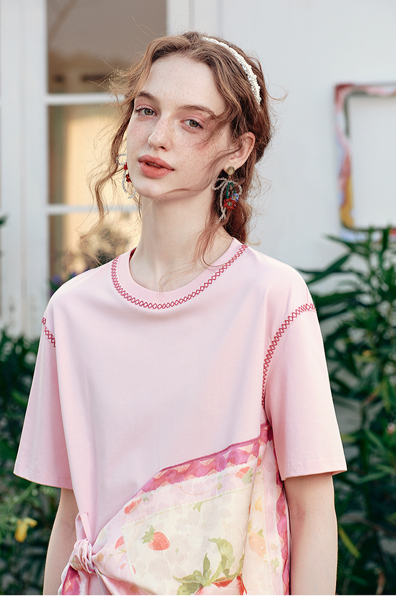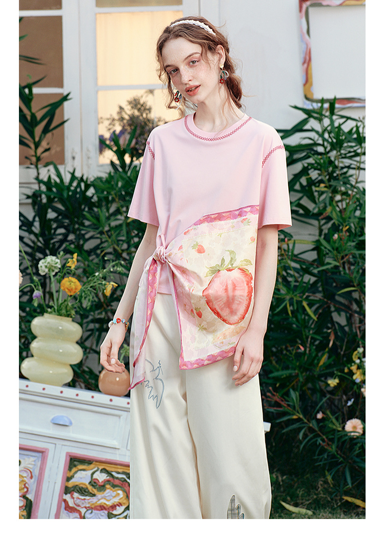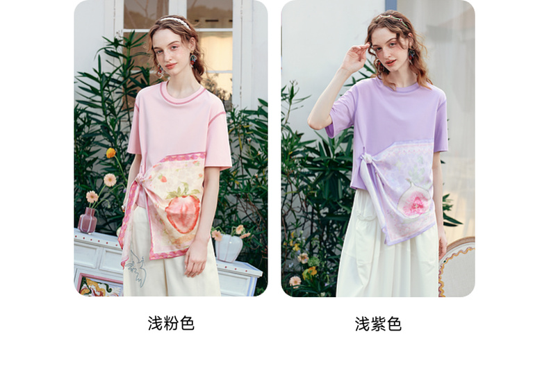 两三事 桃气莓酒 2025夏季新款小清新印花布拼接绑带短袖t恤女