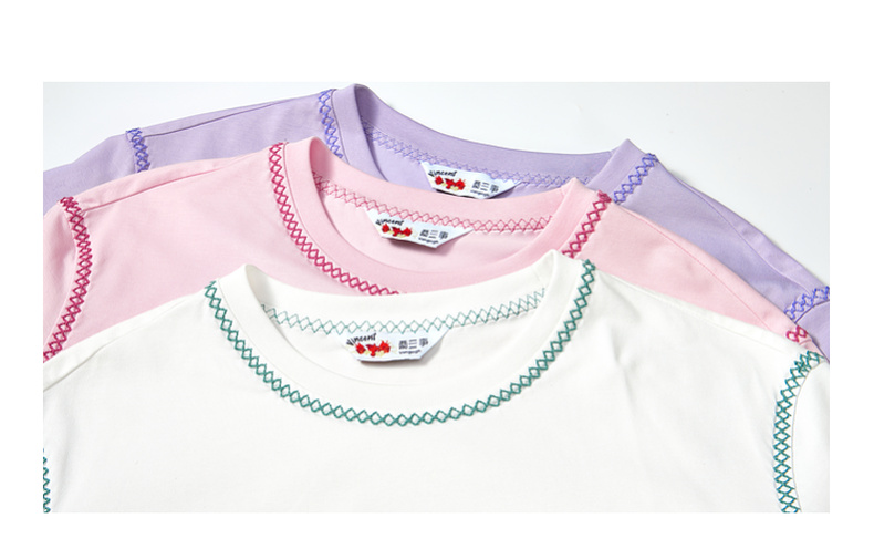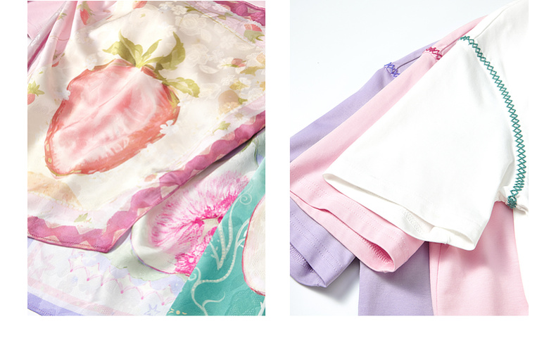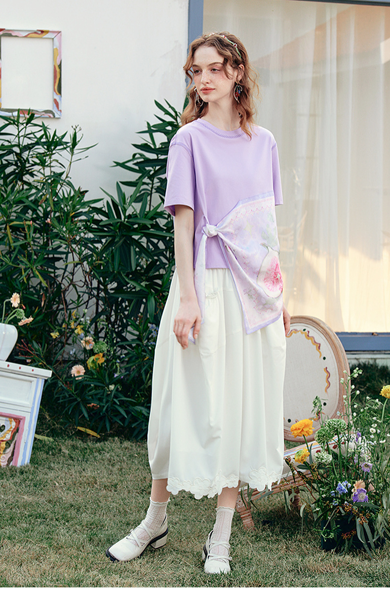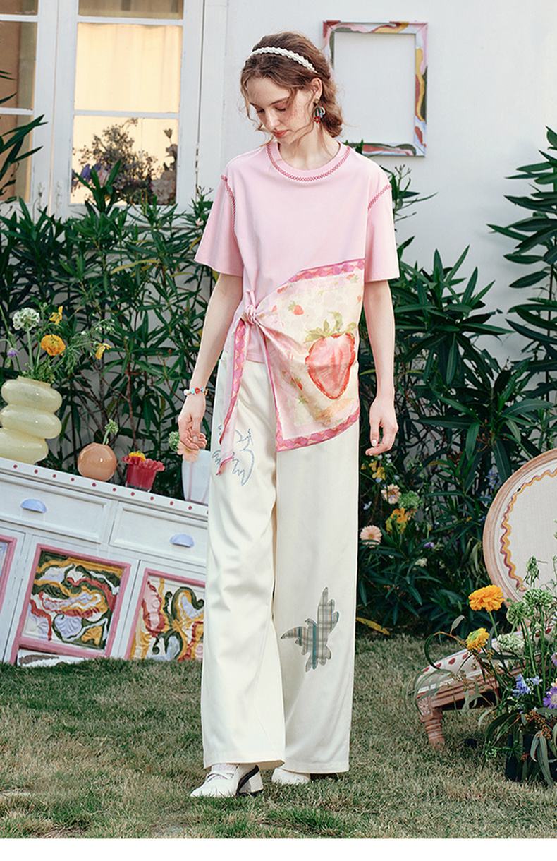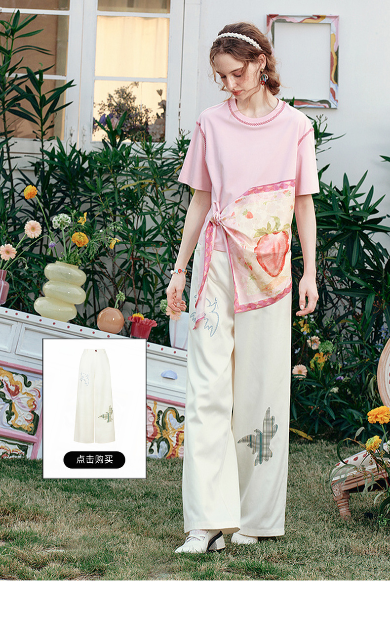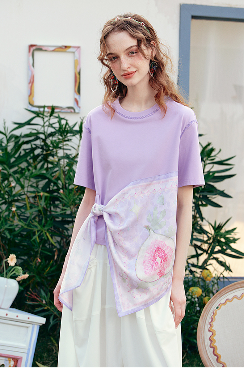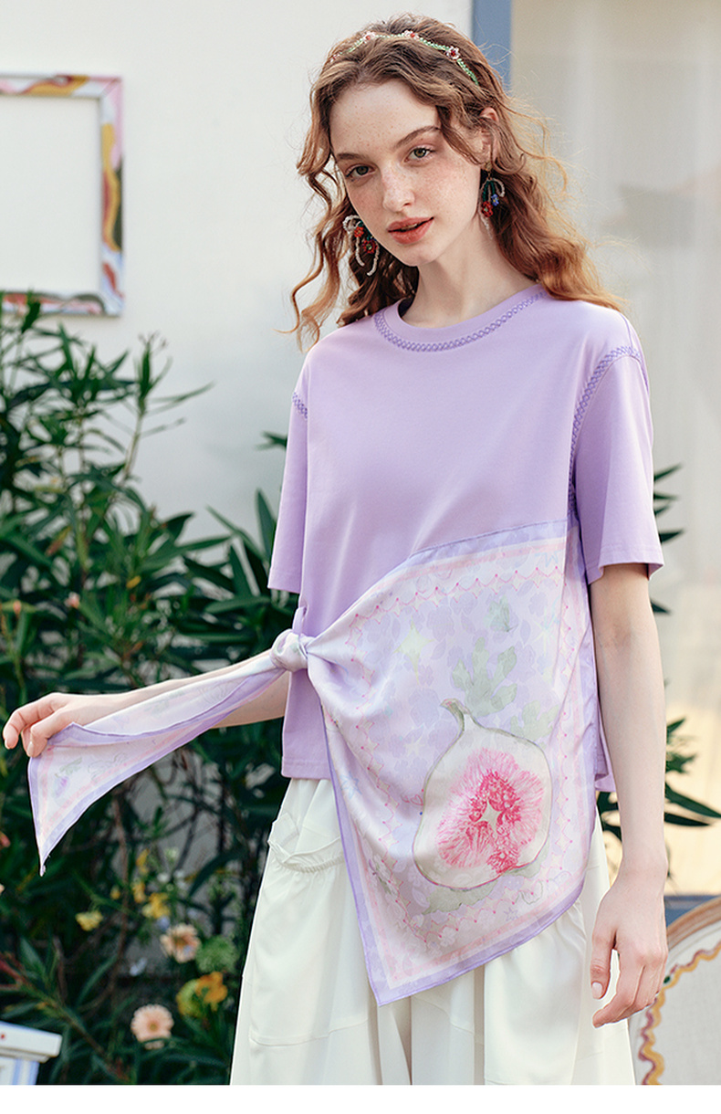 两三事 桃气莓酒 2025夏季新款小清新印花布拼接绑带短袖t恤女