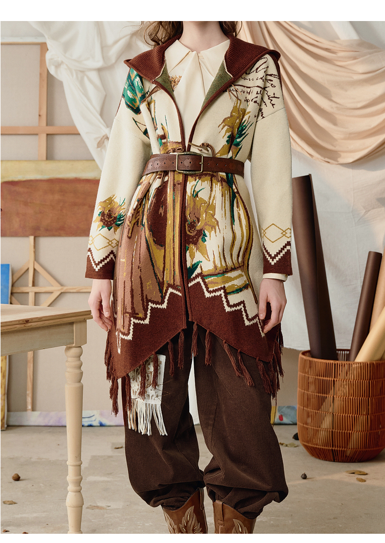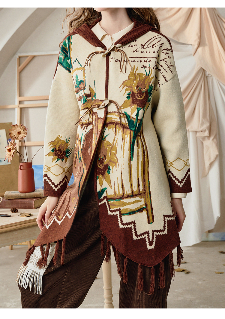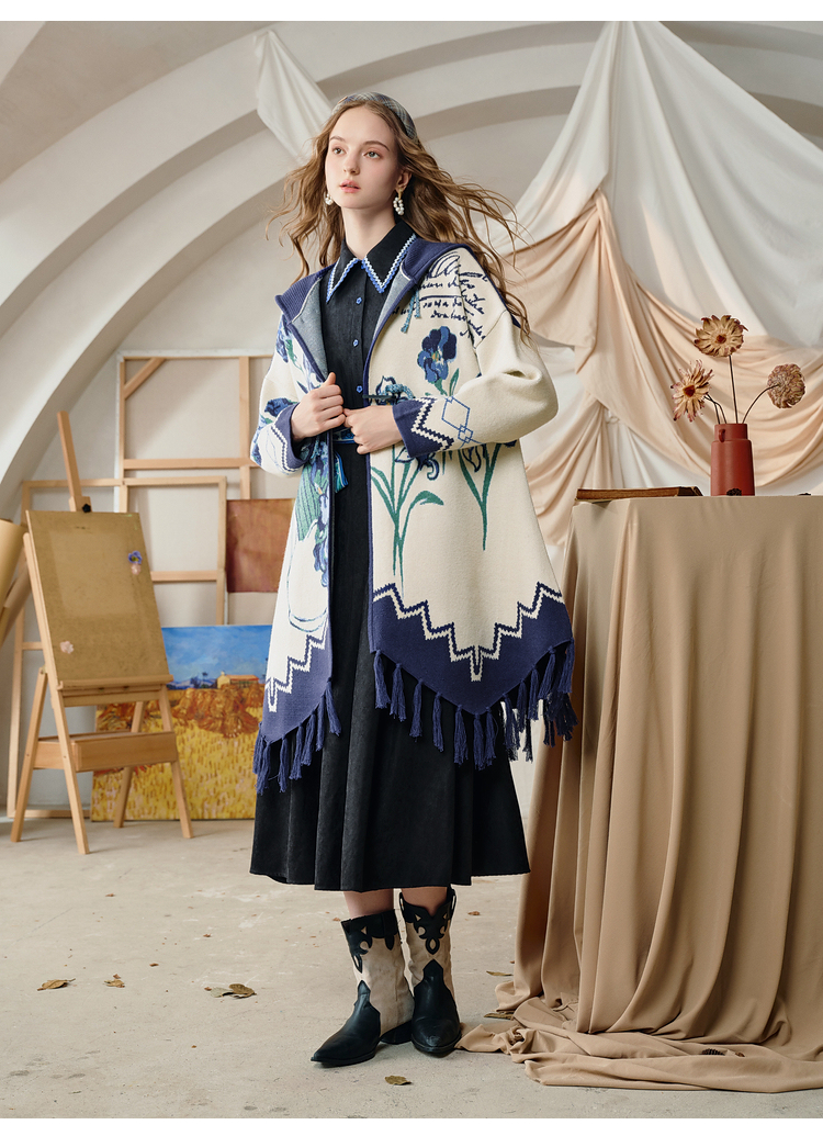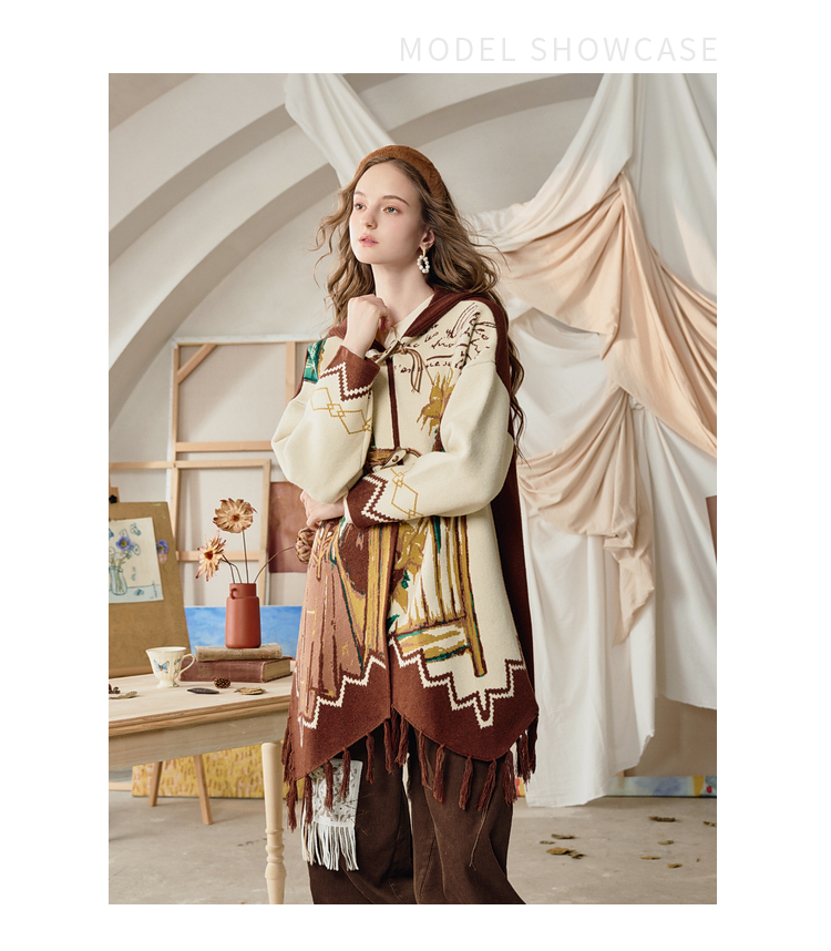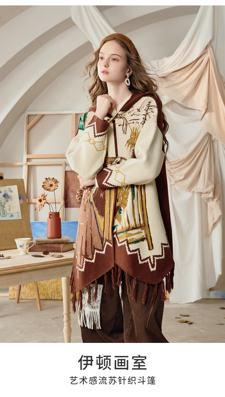 两三事梵高文艺伊顿画室2025冬季新款流苏下摆斗篷式连帽毛衣外套