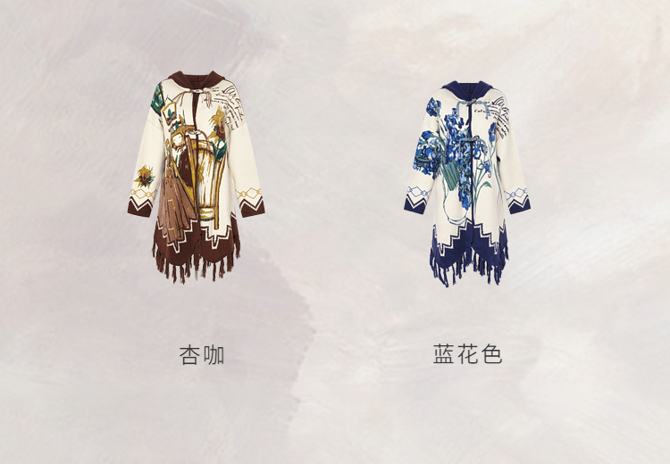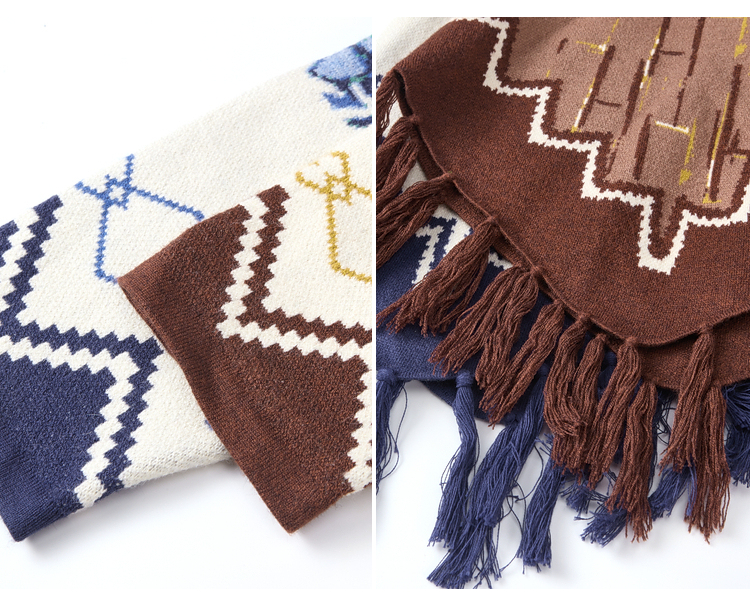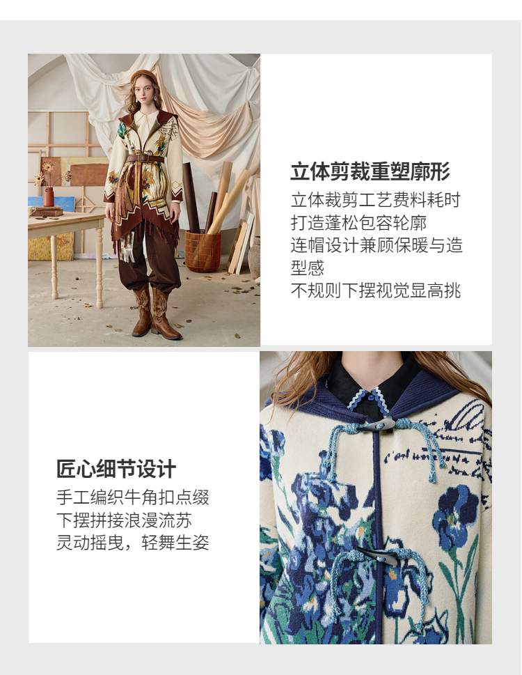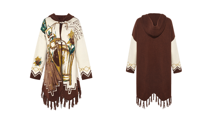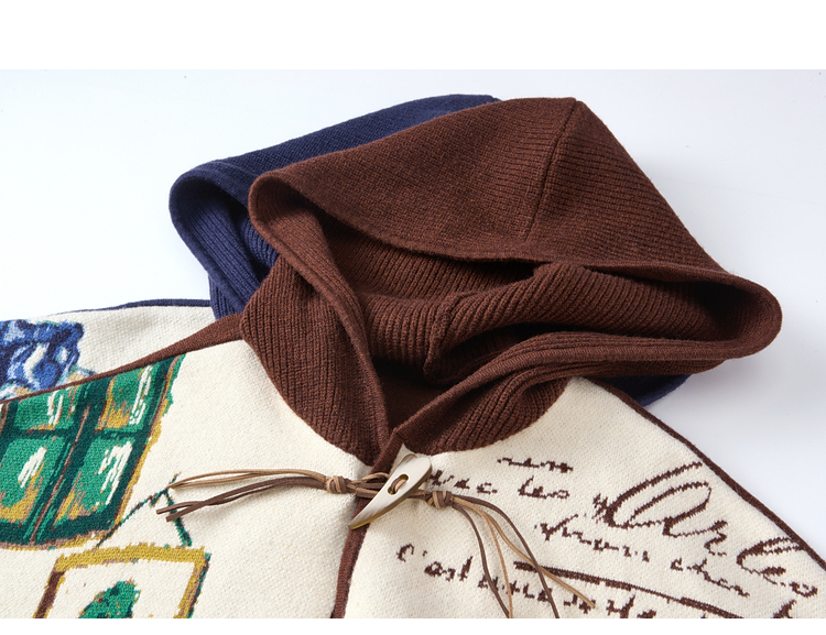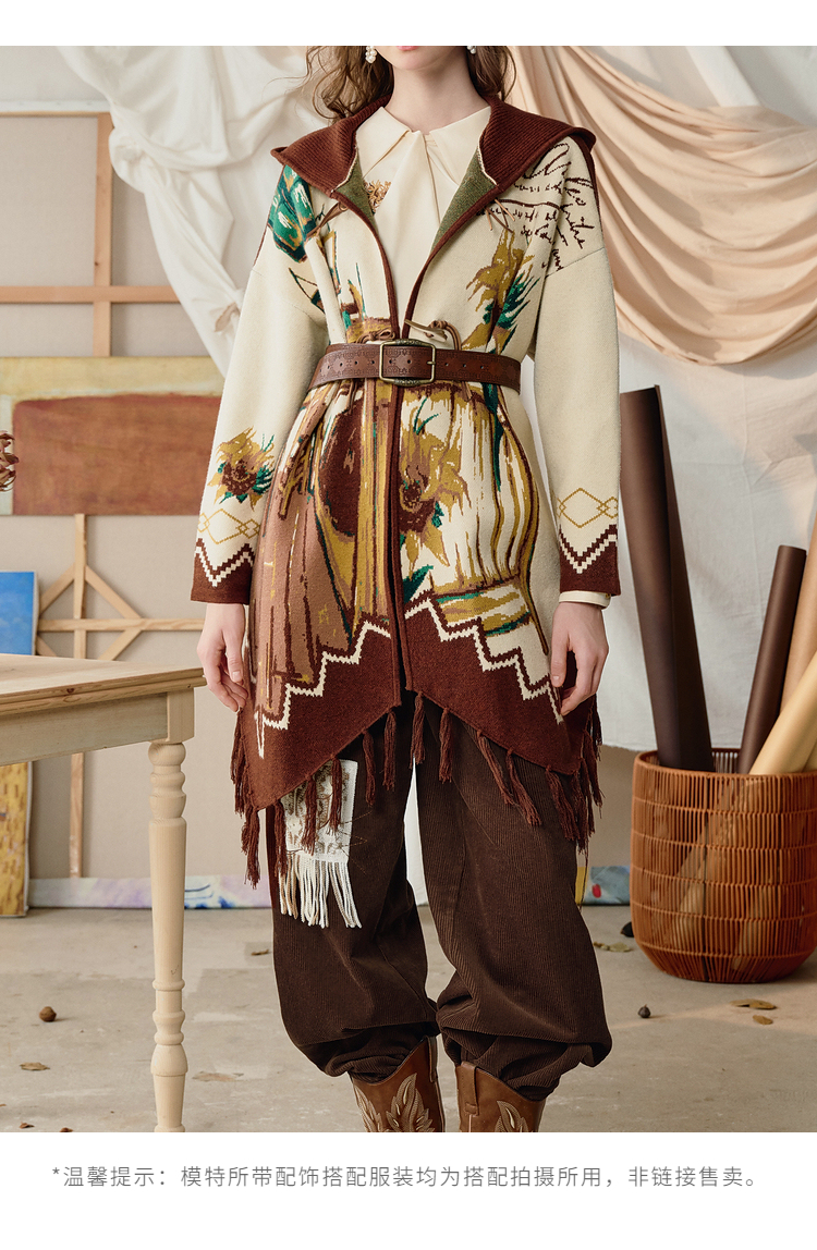 两三事梵高文艺伊顿画室2025冬季新款流苏下摆斗篷式连帽毛衣外套